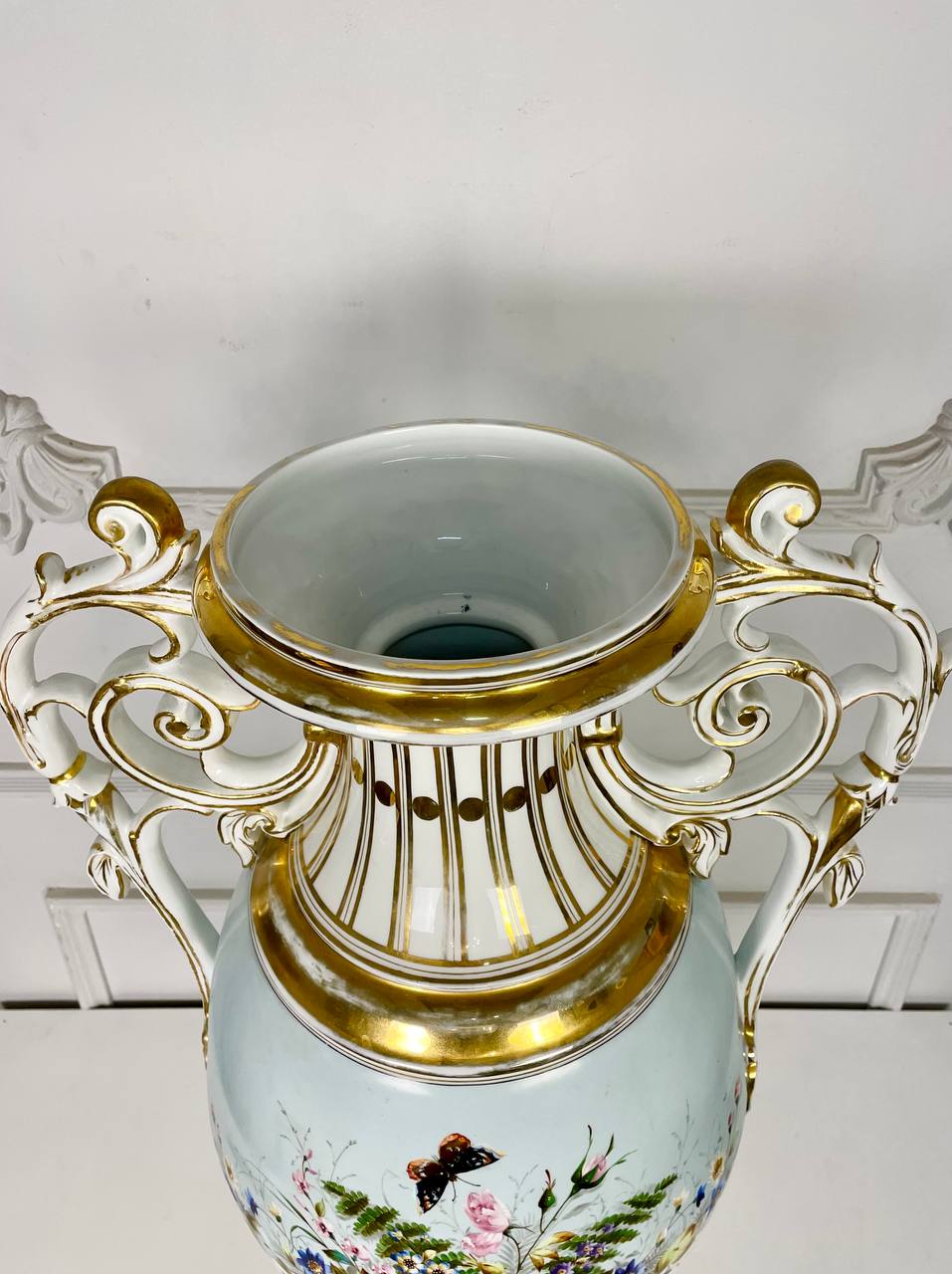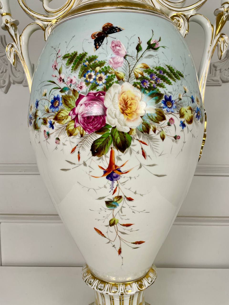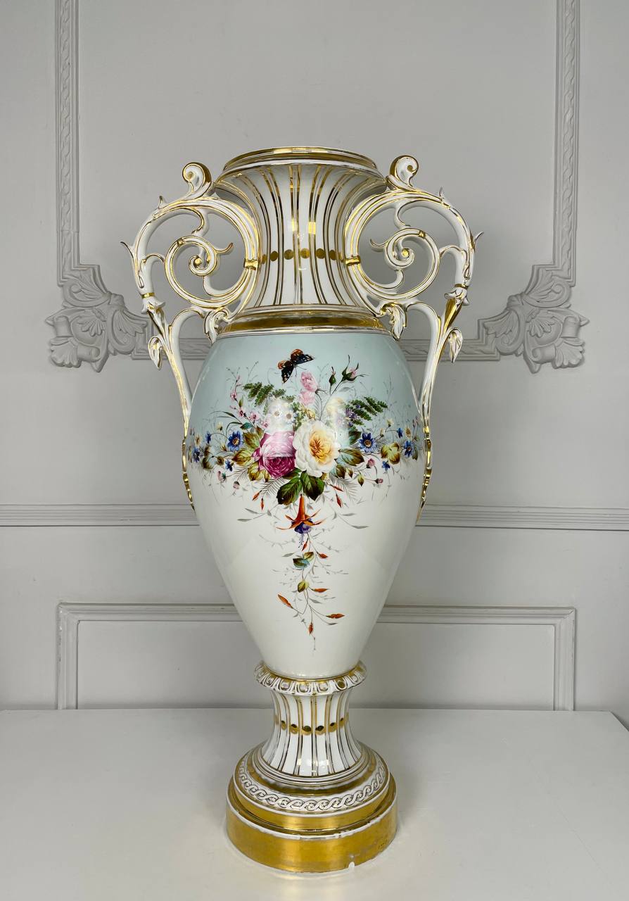 Вероятно, ваза была преподнесена императорской семье в качестве подарка в соответствии с традицией «Высочайших подношений» к традиционным праздникам Рождества и Пасхи. Её монументальный размер, исключительный для фарфоровых ваз с цветочной росписью, свидетельствует о том, что она предназначалась для украшения парадных дворцовых залов. Роспись исполнена в модной во 2-ой половине 19-го века стилистике неорококо. Симметричные ручки выполнены в виде завитков рокайля. Яркая цветовая гамма с насыщенными нарядными оттенками характерна для изделий ИФЗ 1870-х годов. Есть все основания предполагать, что данная ваза единственный сохранившийся экземпляр.