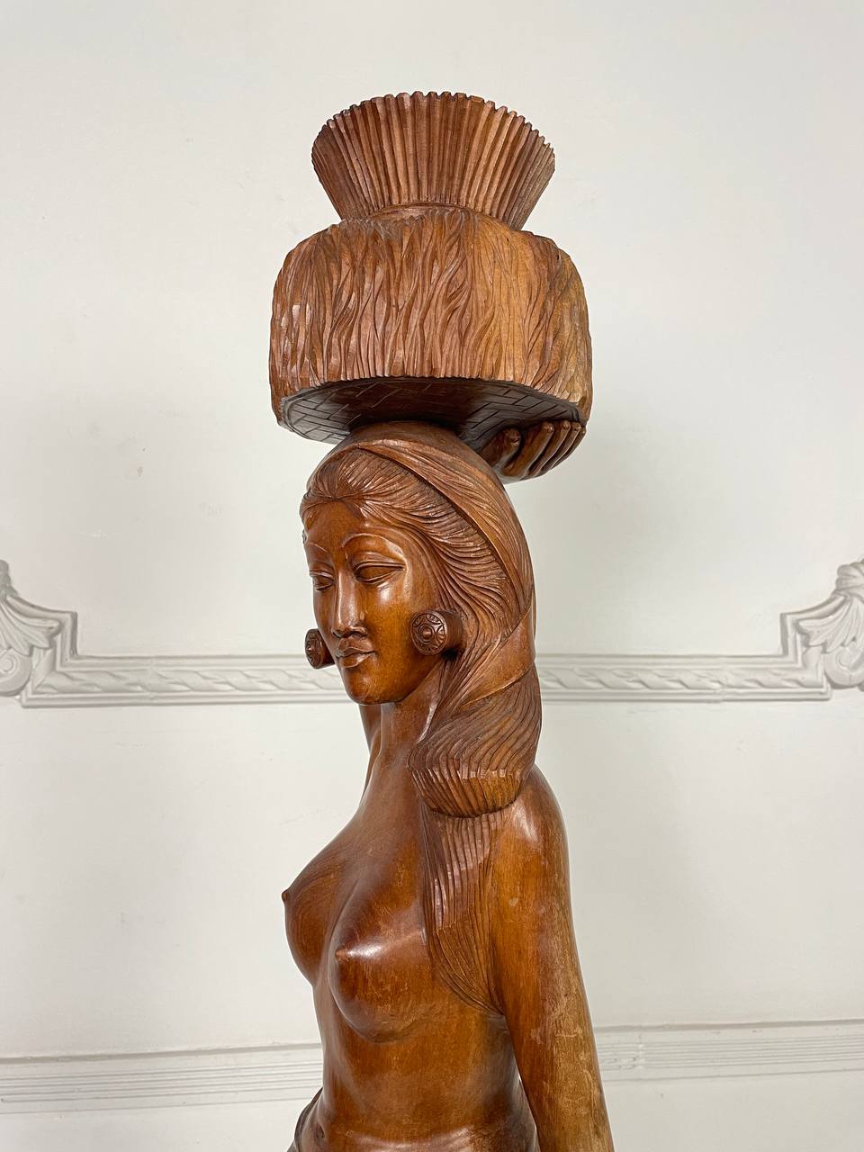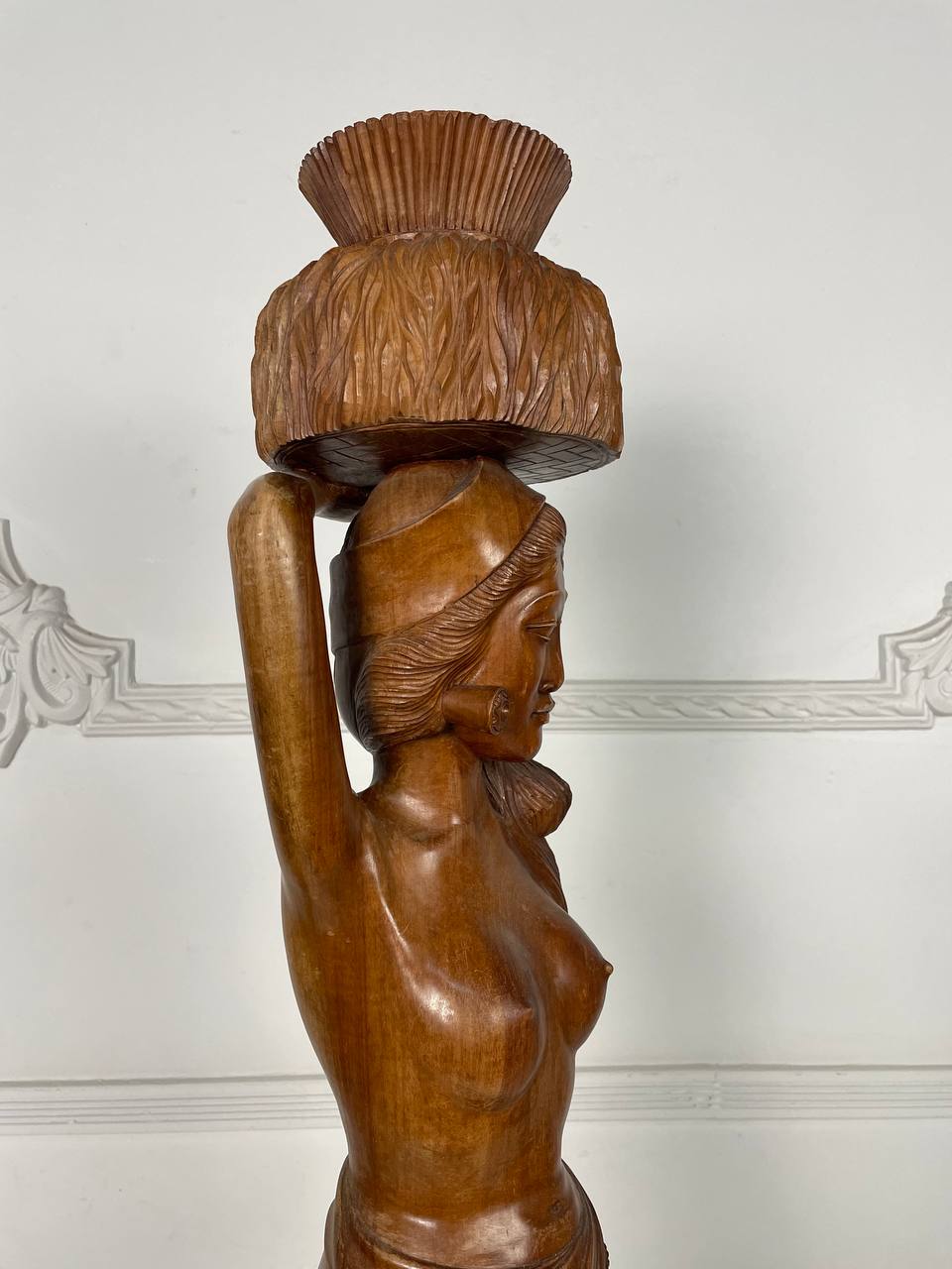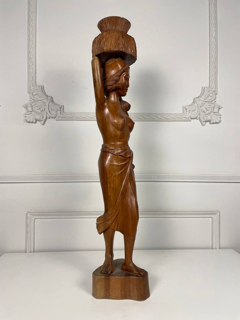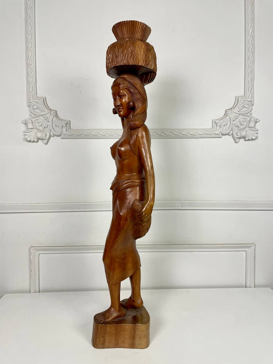 Антикварная большая скульптура восточной девушки, несущей на голове стог сена, середина XX века.