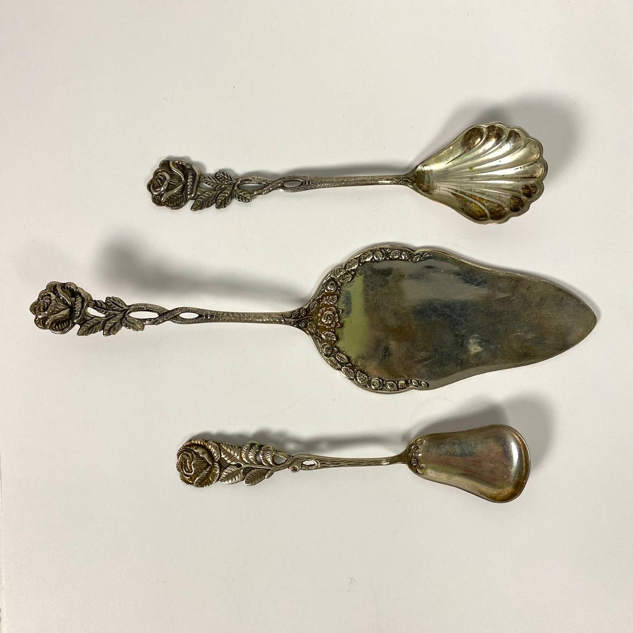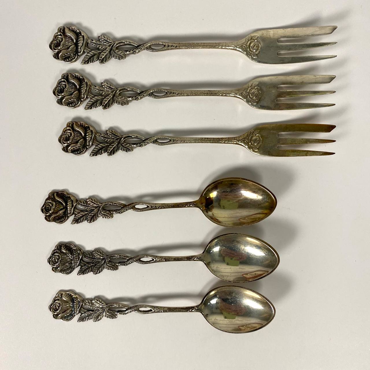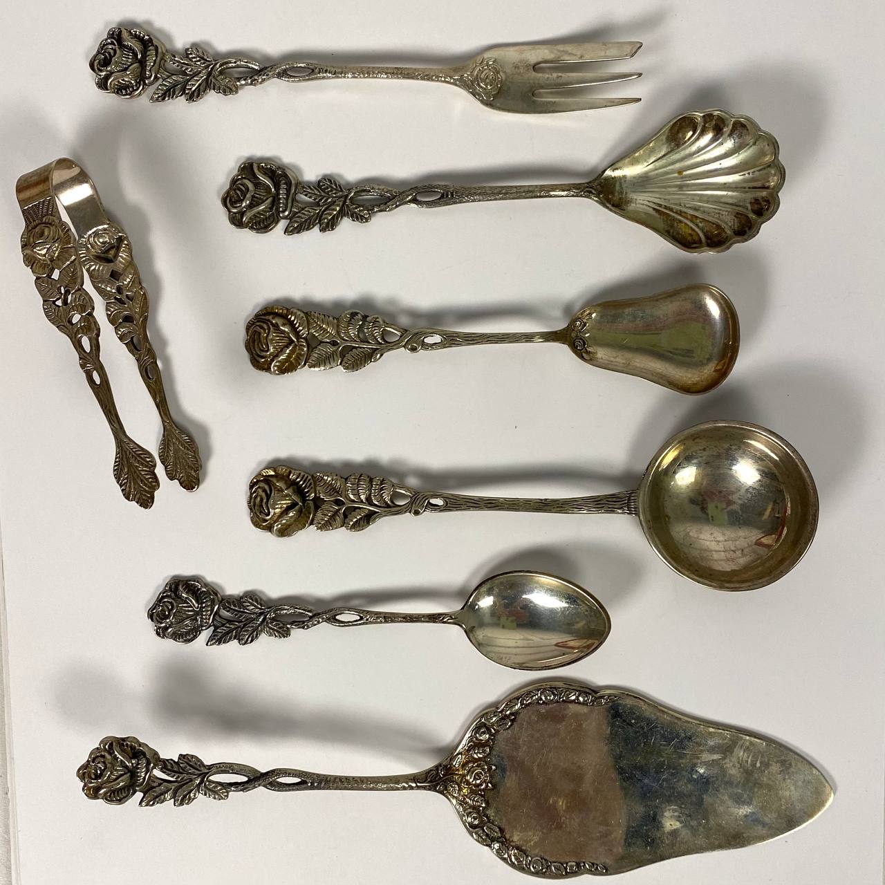 Десертный набор "Хильдесхаймская роза", Pfeiffer Bestecke, Германия, 1960-70-е годы. Серебро 800 пробы. В комплекте 6 кофейных ложечек, 6 вилочек, лопатка, щипцы для сахара, ложечки для компота, варенья, мороженого. Оригинальный кофр. Размер кофра: 26,5х22 см