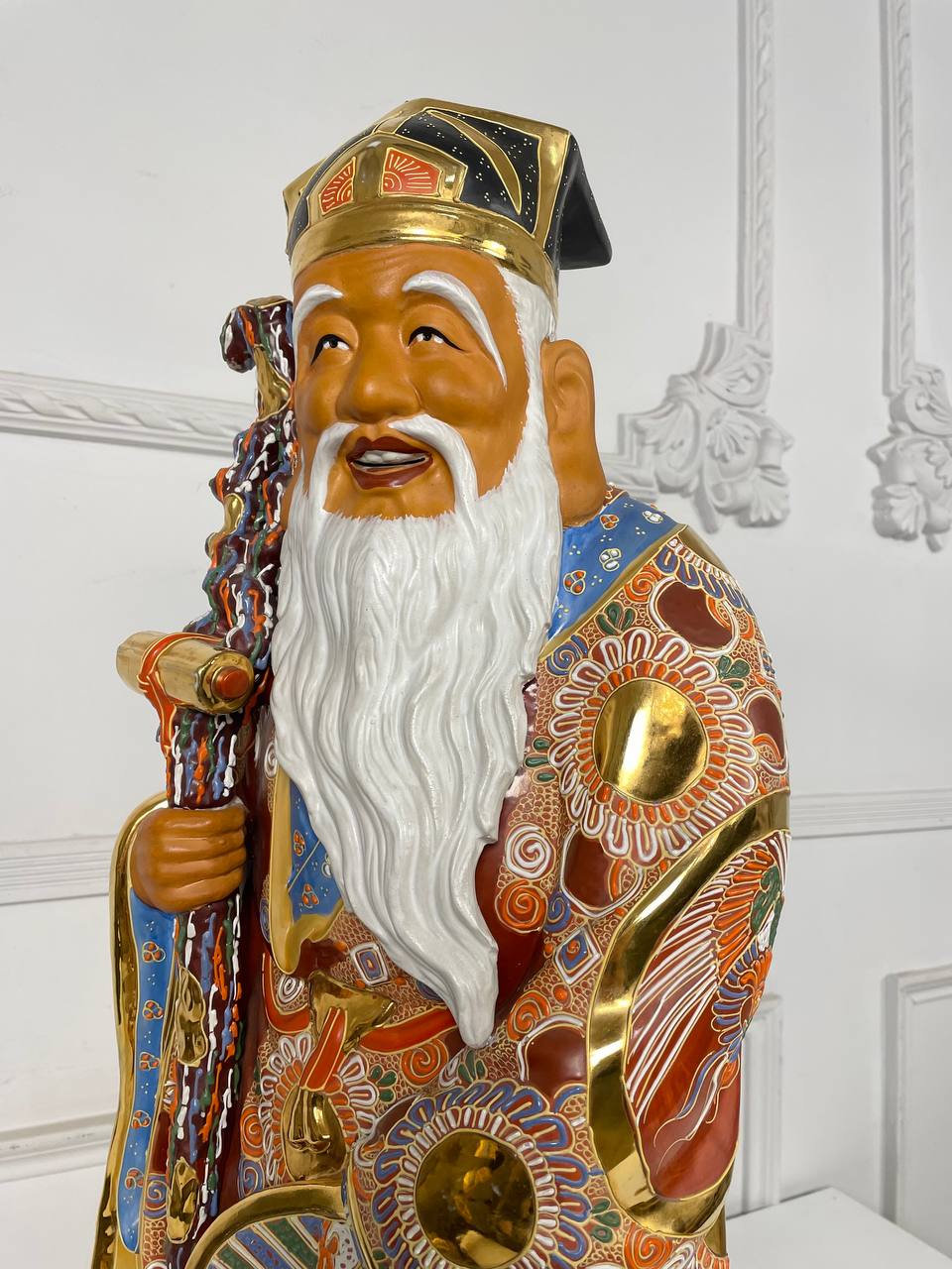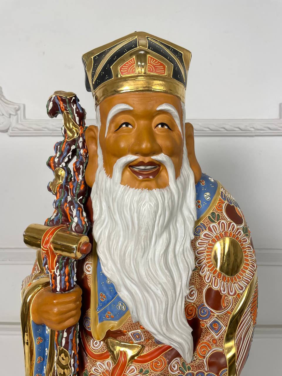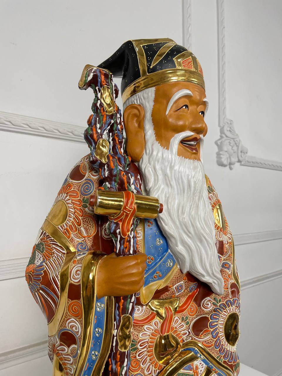 Антикварная Большая скульптура старца Дзюродзина, одного из семи мудрецов (богов счастья). Фарфор, глазурь, золочение, полихромная роспись. Япония, мастерские Кутани, 1940х годов.