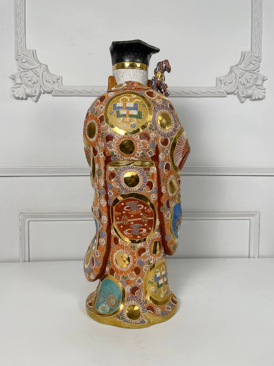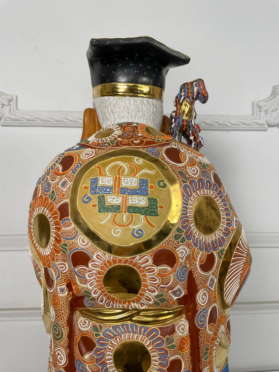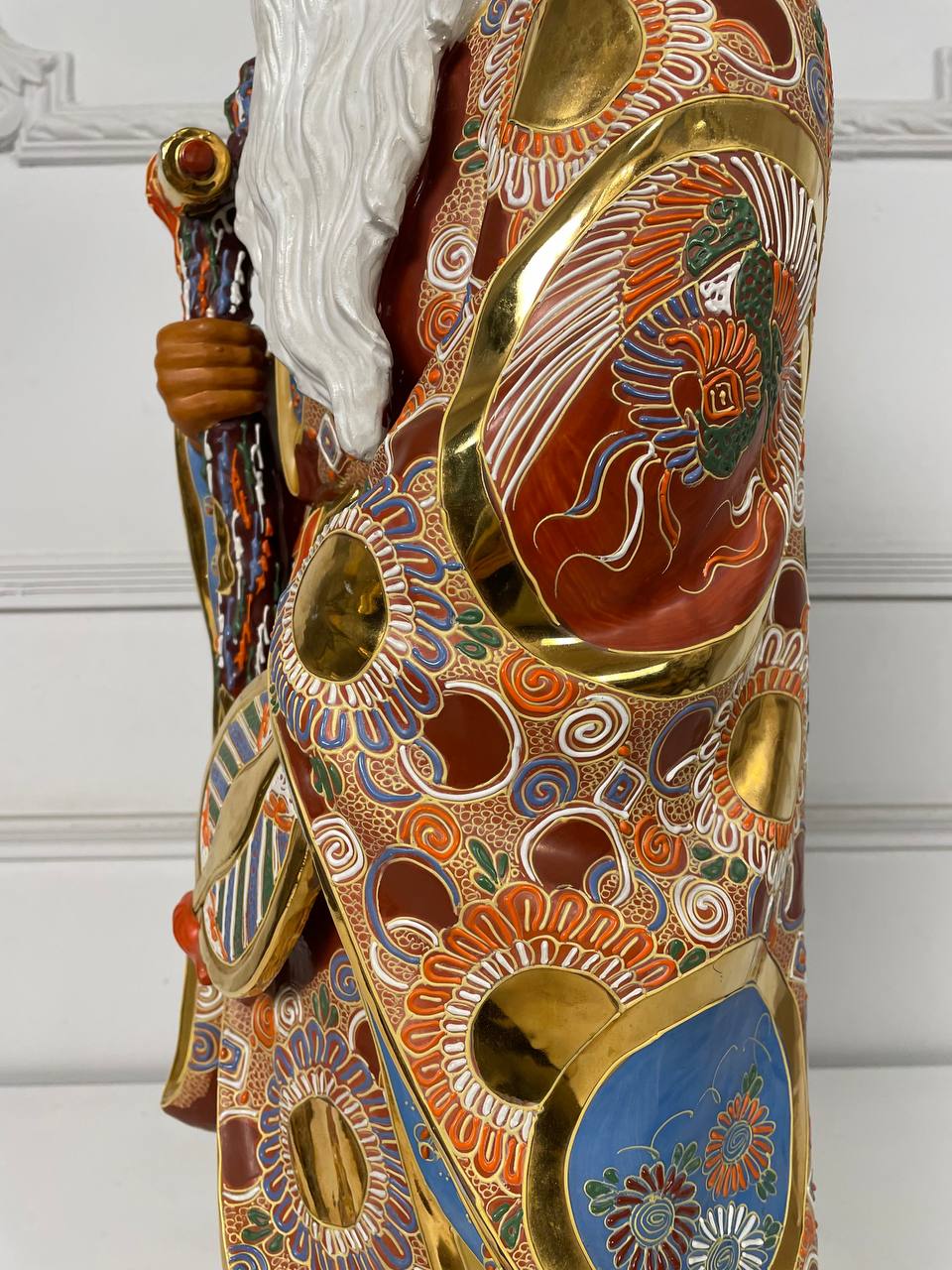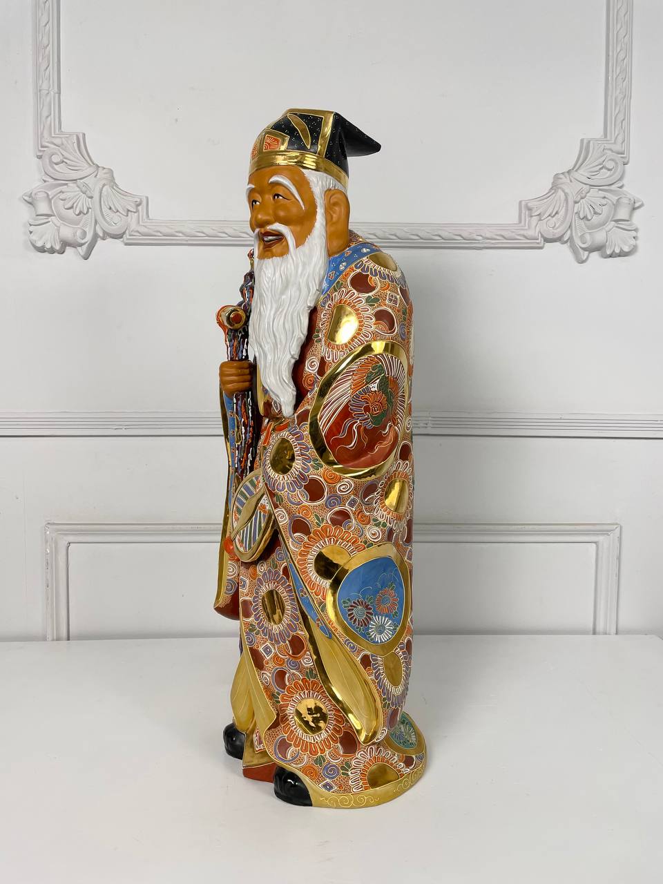 Антикварная Большая скульптура старца Дзюродзина, одного из семи мудрецов (богов счастья). Фарфор, глазурь, золочение, полихромная роспись. Япония, мастерские Кутани, 1940х годов.