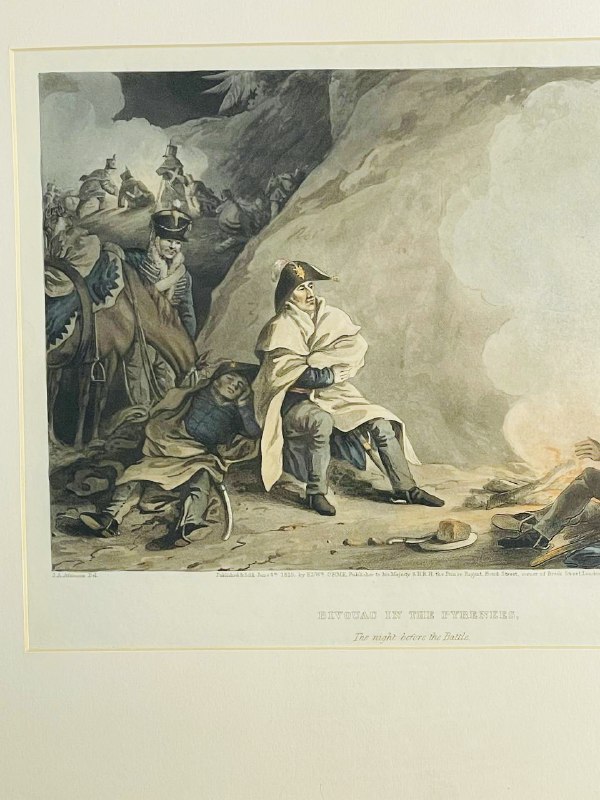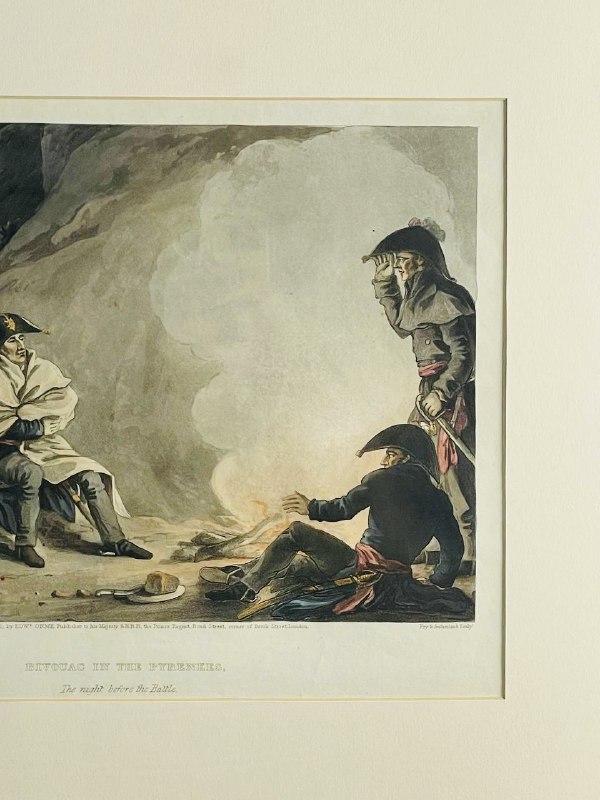 Антикварная гравюра "Бивак в Пиренеях. Ночь перед сражением", ХIХ век, Англия. Издательство Эдварда Орме, 1815, Лондон. Цветная акватинта с ручной раскраской акварелью. Размер: 51х42,5 см.