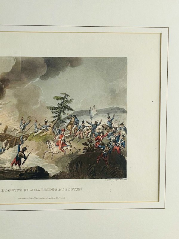 Антикварная гравюра "Взрыв моста в Эльстере", ХIХ век, Англия. Издательство Джеймса Дженкинса, 1815, Лондон. Цветная акватинта с ручной раскраской акварелью. Размер: 51х42,5 см.