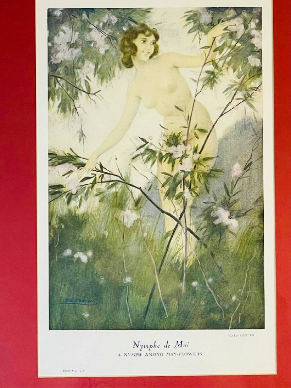 Фотогравюра «Нимфа среди майских цветов», Франция, 1923. Оригинальная цветная фотогравюра из редкого откровенного издания «ЭРОС». Художник Leo Fontan (1884-1965). Размер: 54х39,5 см.