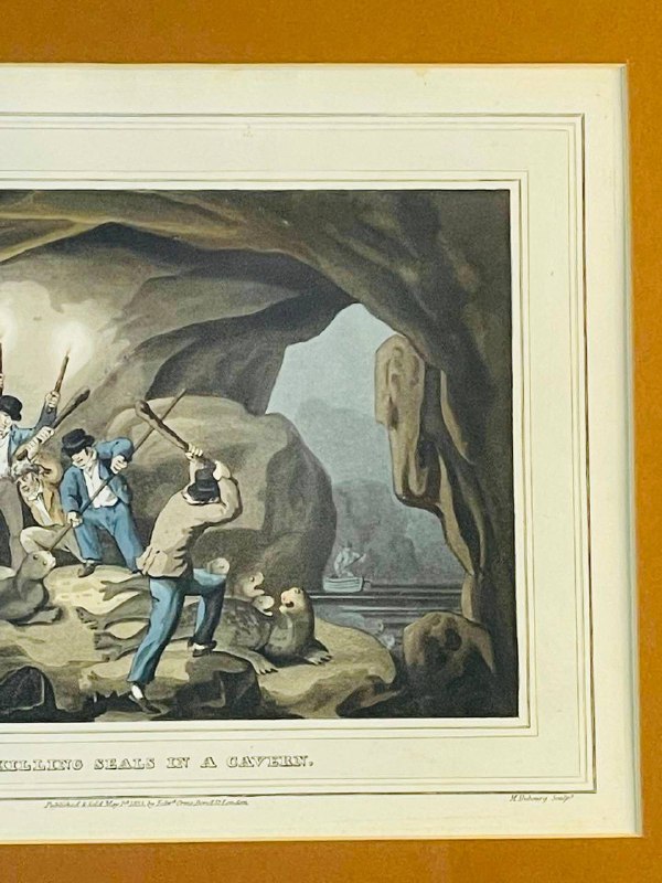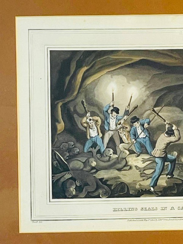 Аквантинта с ручной раскраской "Охота в пещере", первая половина ХХ века, Англия. Размер: 39,5х35 см.