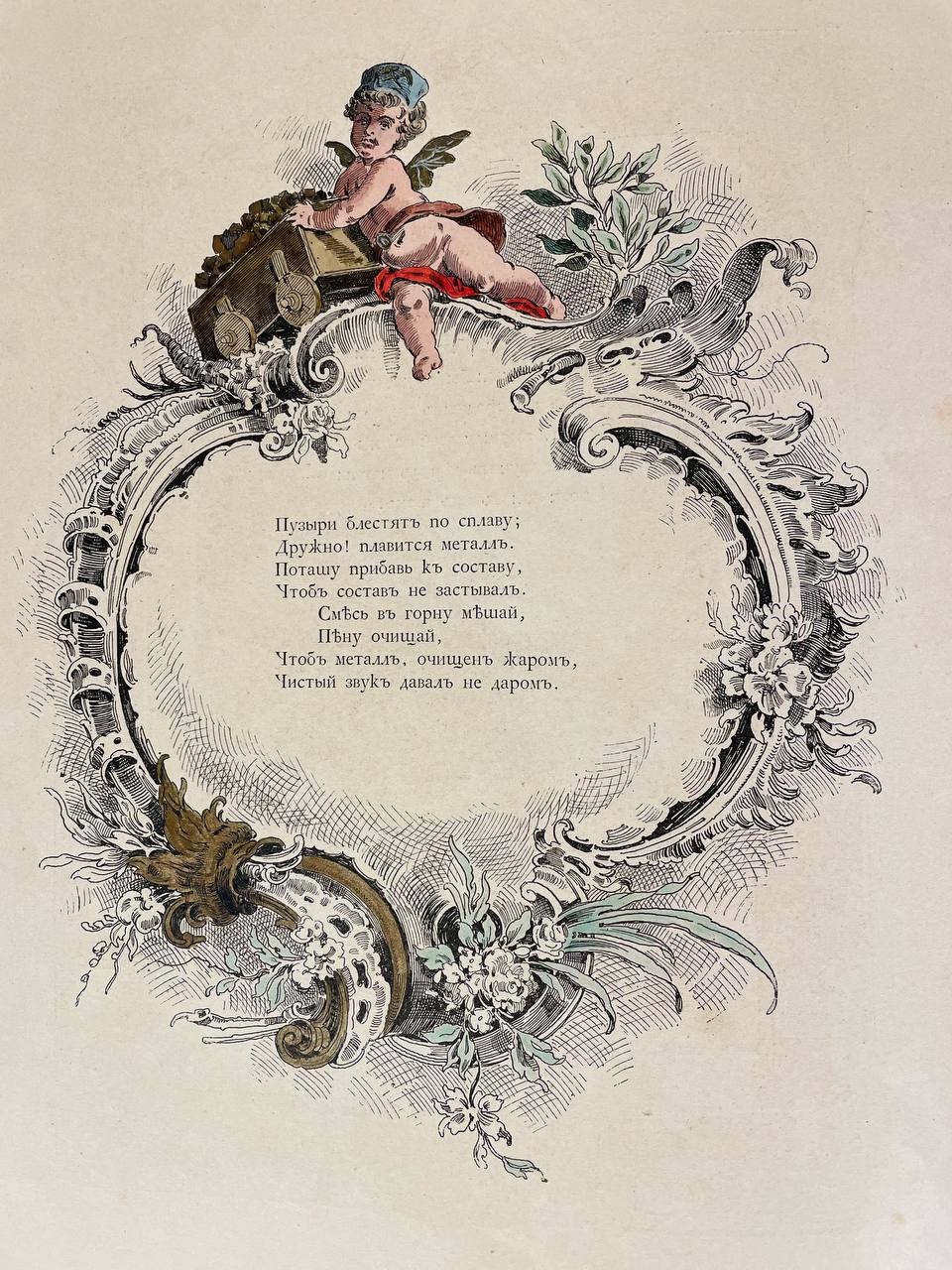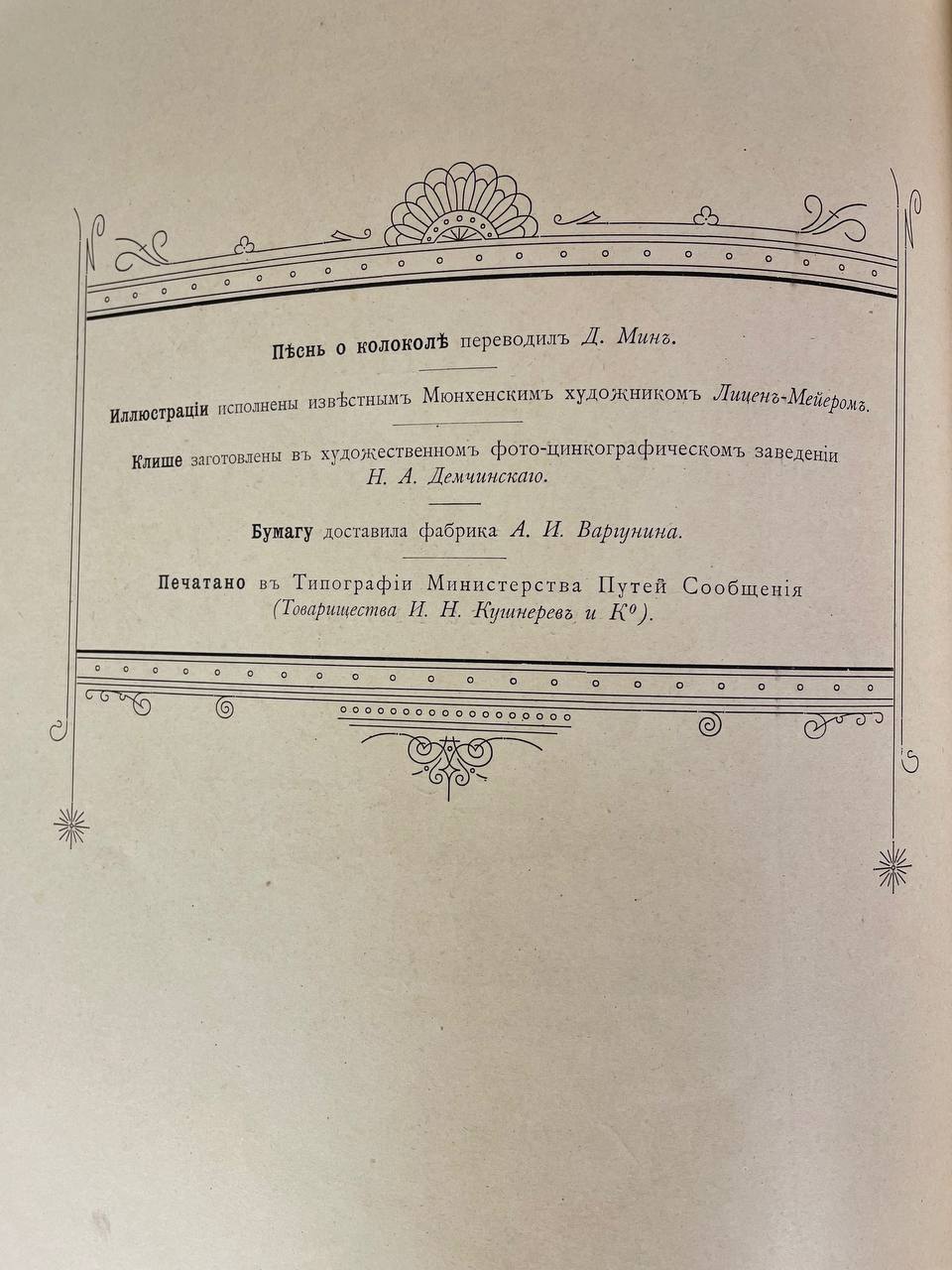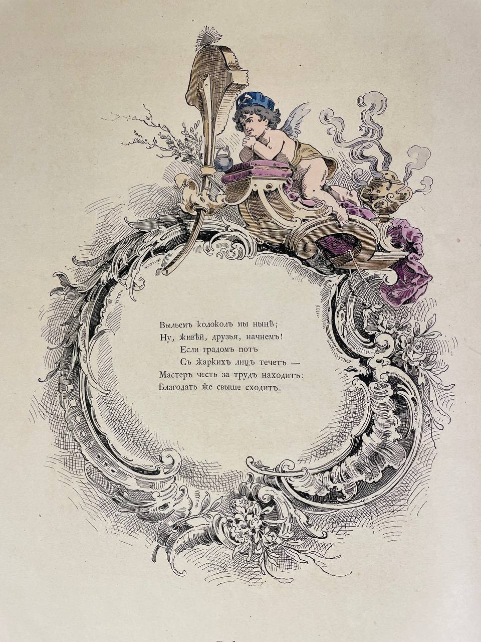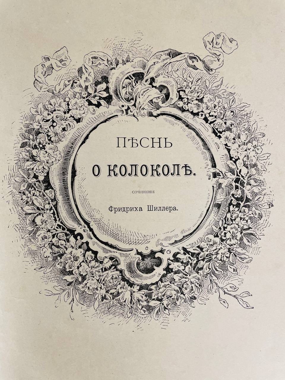 Антикварная книга «Песнь о Колоколе» Фридриха Шиллера, 1893 г, С-Петербург. Перевод Д. Минь. Иллюстрации Лицень-Мейер. Напечатано в типографии Министерства Путей Сообщений (Товарищества И.Н. Кушнерев и Ко) Размер 27х37h см.