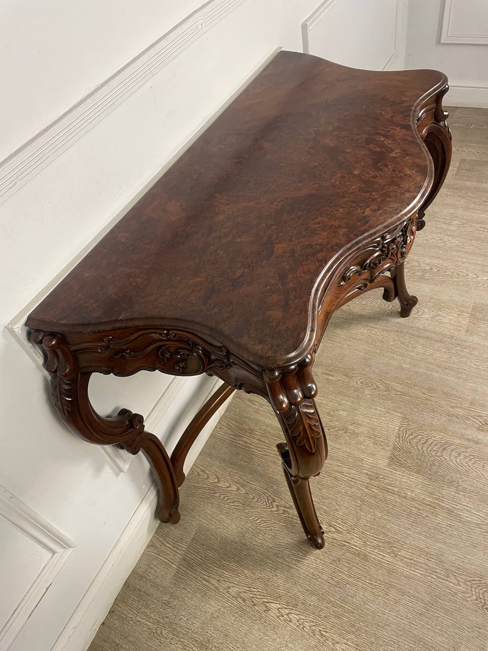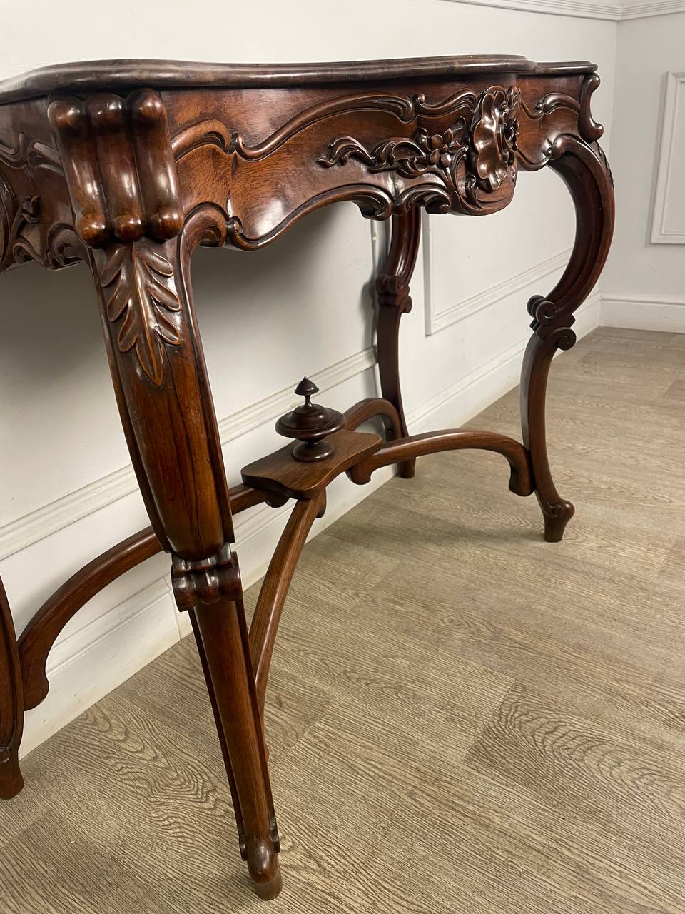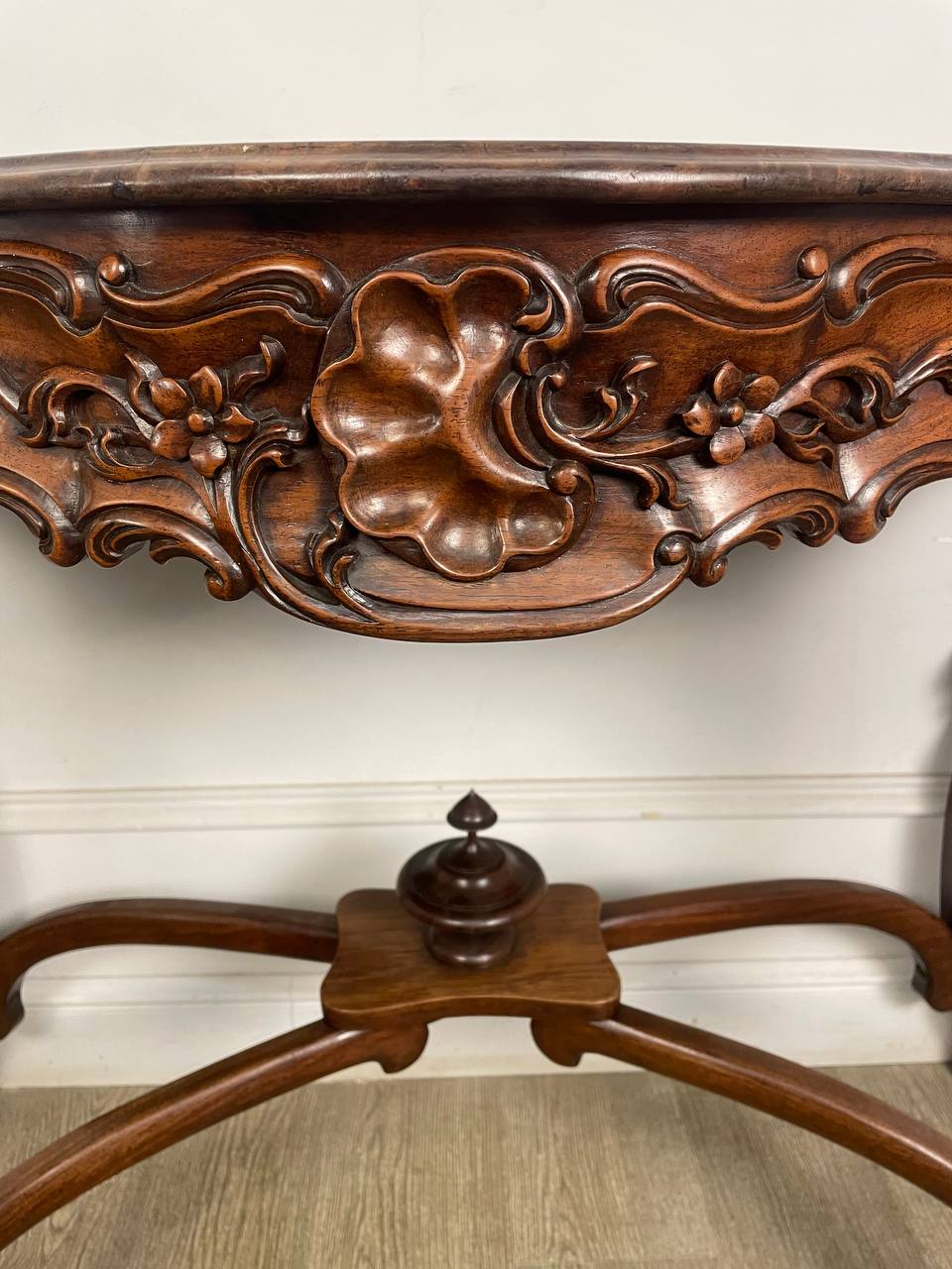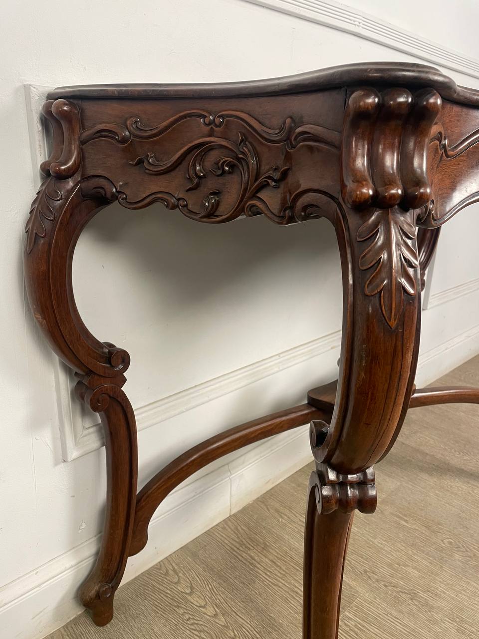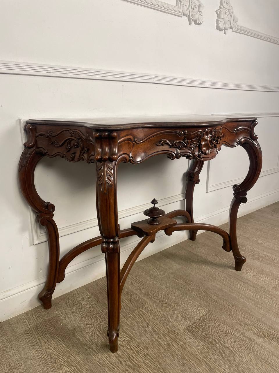 Антикварная консоль второй половины XX века, Франция. Выполнена из ореха. Красивая резьба и фигурная столешница украшают консоль. Размер 100х49х80h см.