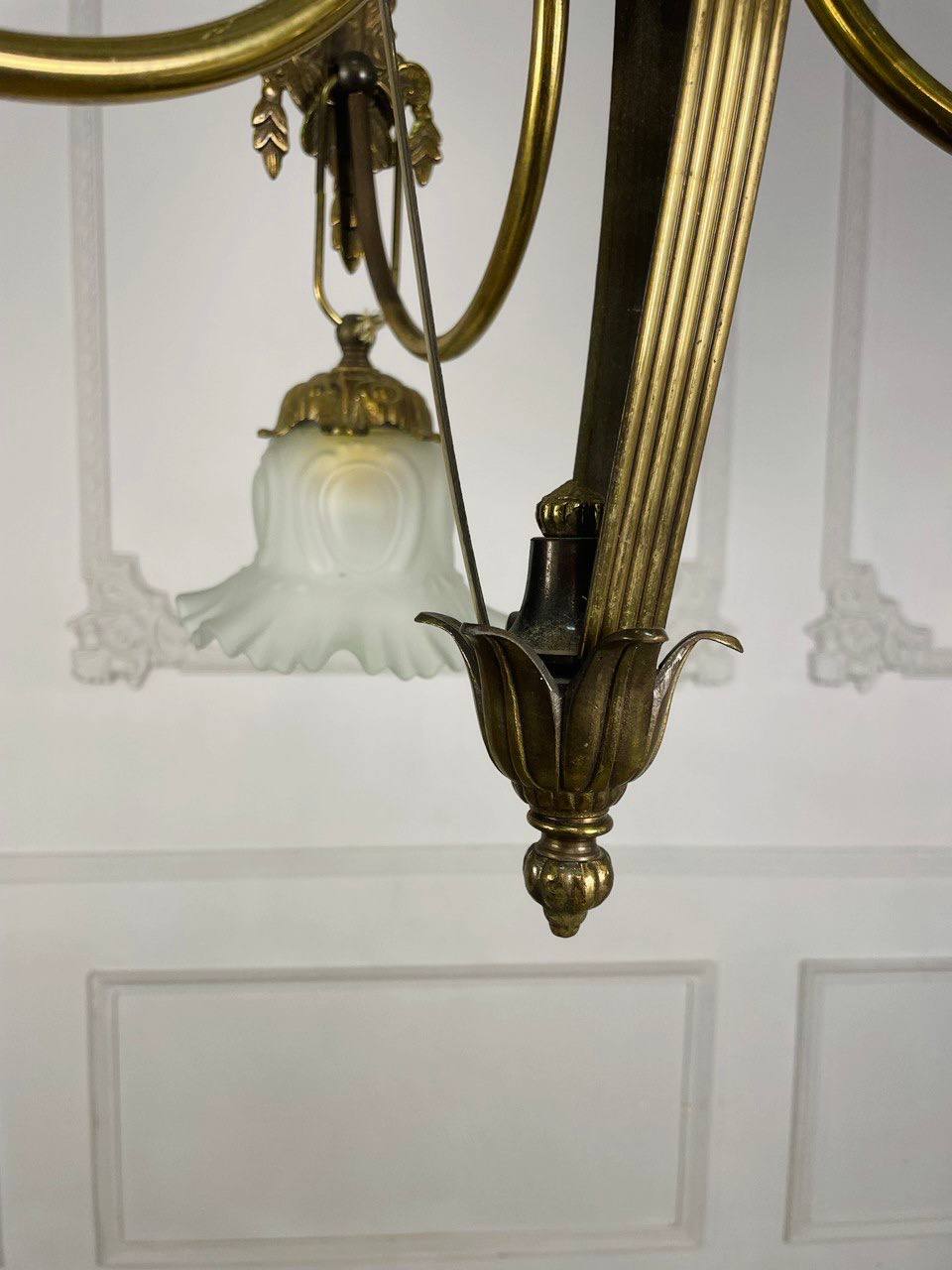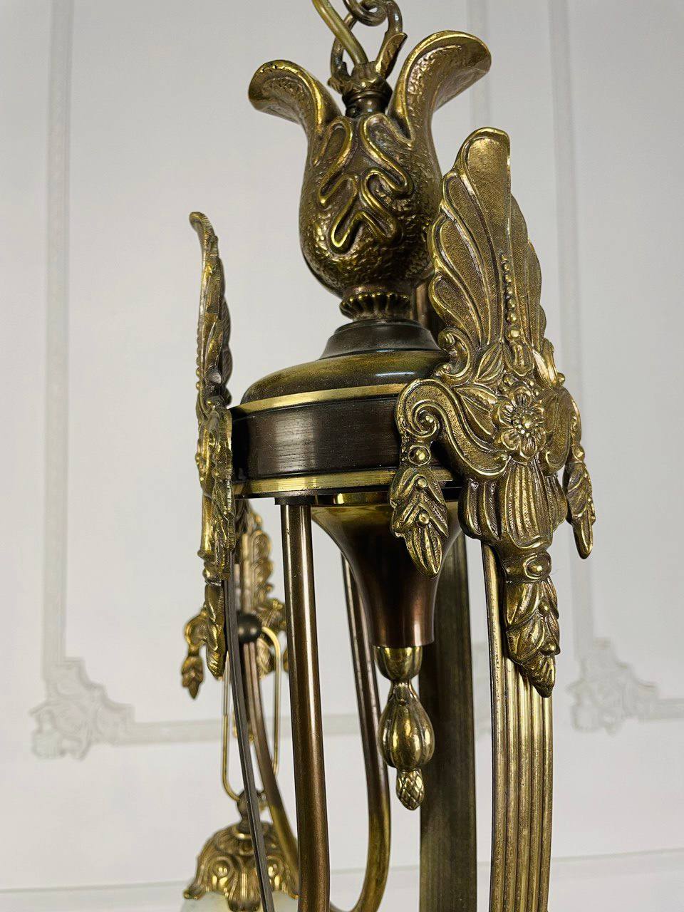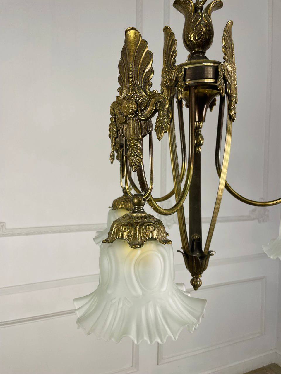 Антикварная люстра первой половины XX века, Европа. Выполнена из бронзы. Три светоточки. Оригинальные плафоны. Диаметр 60 см. Высота 70 см.