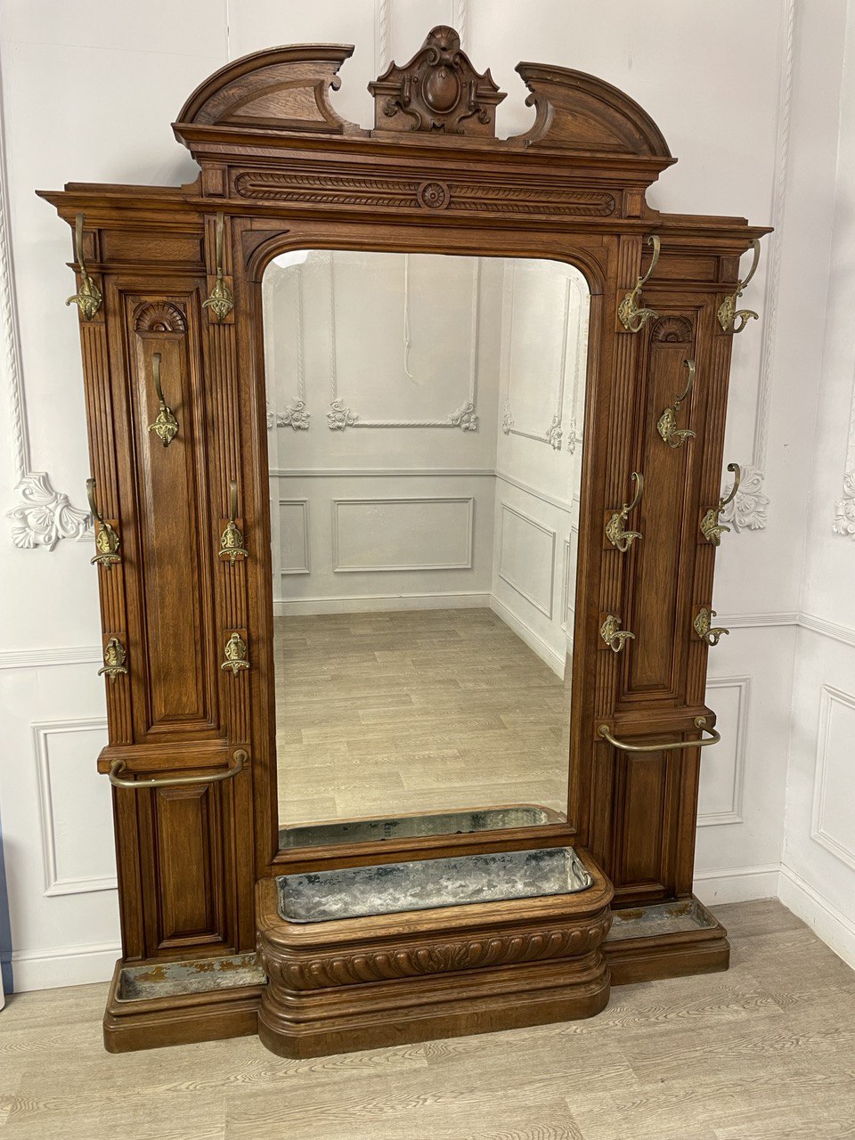 Антикварная прихожая рубежа XIX-XX веков, Франция. Выполнена из массива ореха. Оригинальное зеркальное полотно и бронзовая фурнитура. Размер 178х38х252h см.