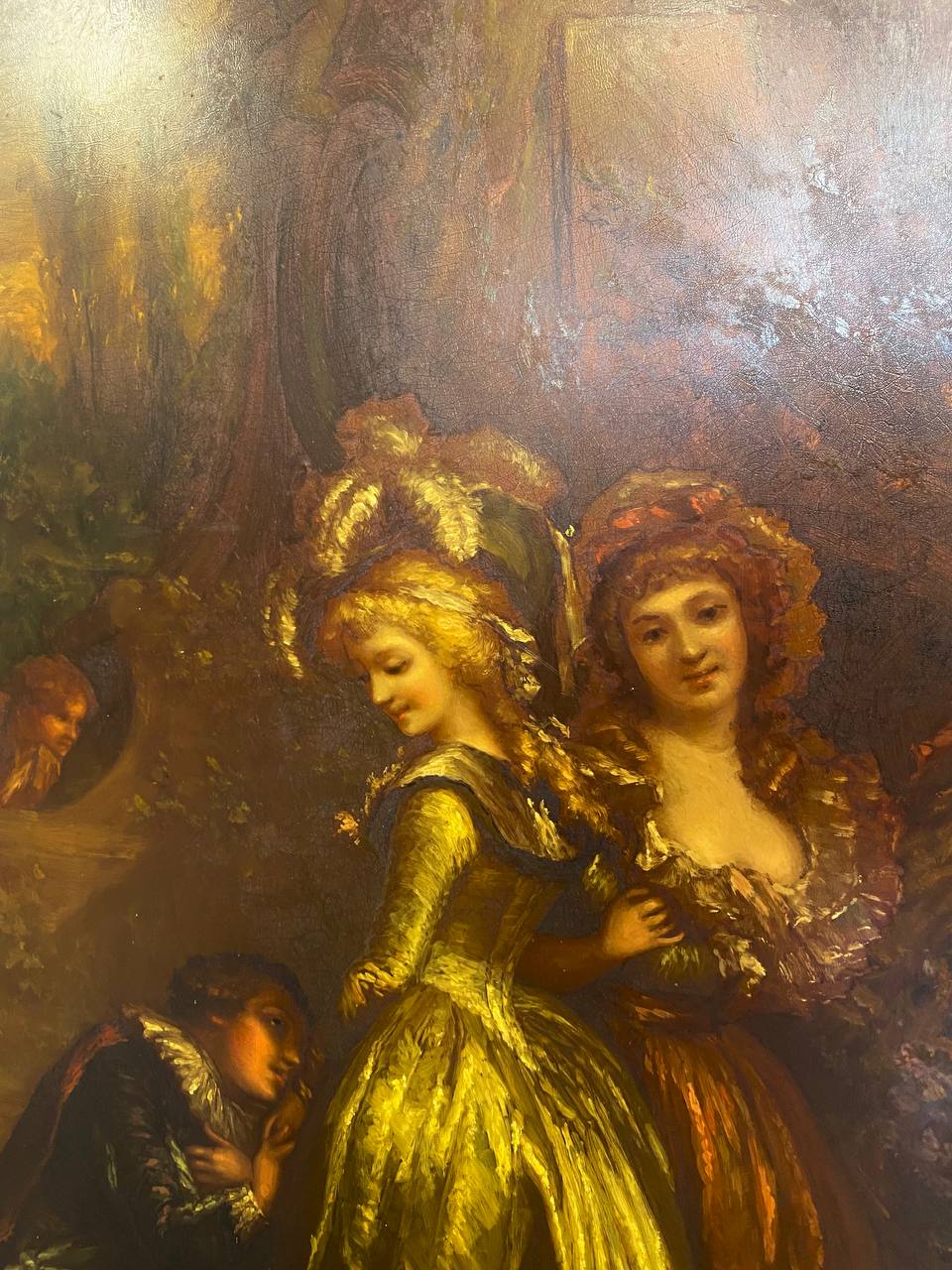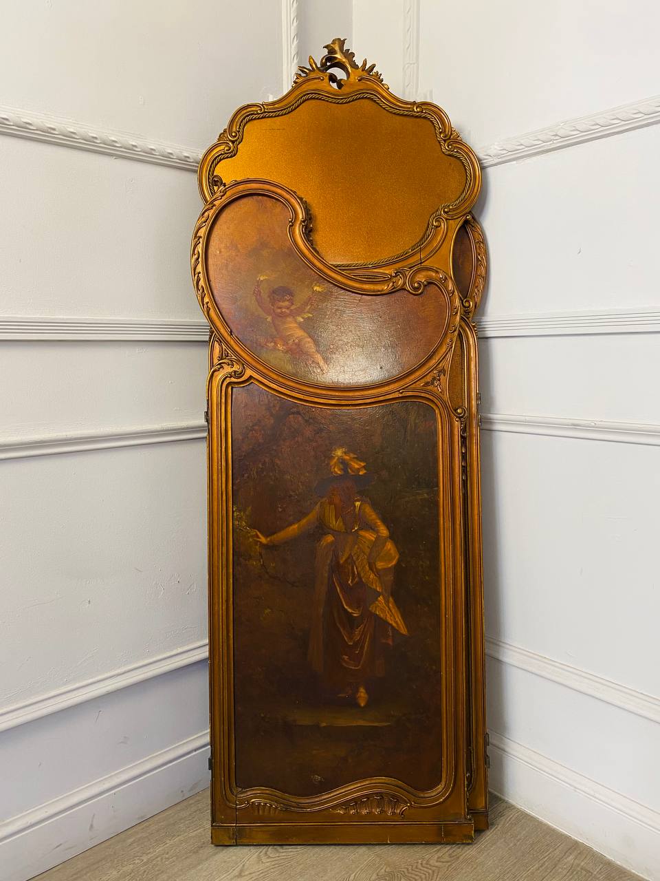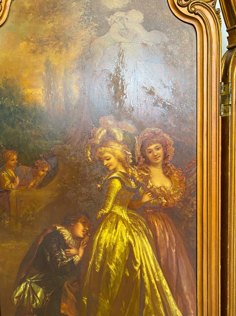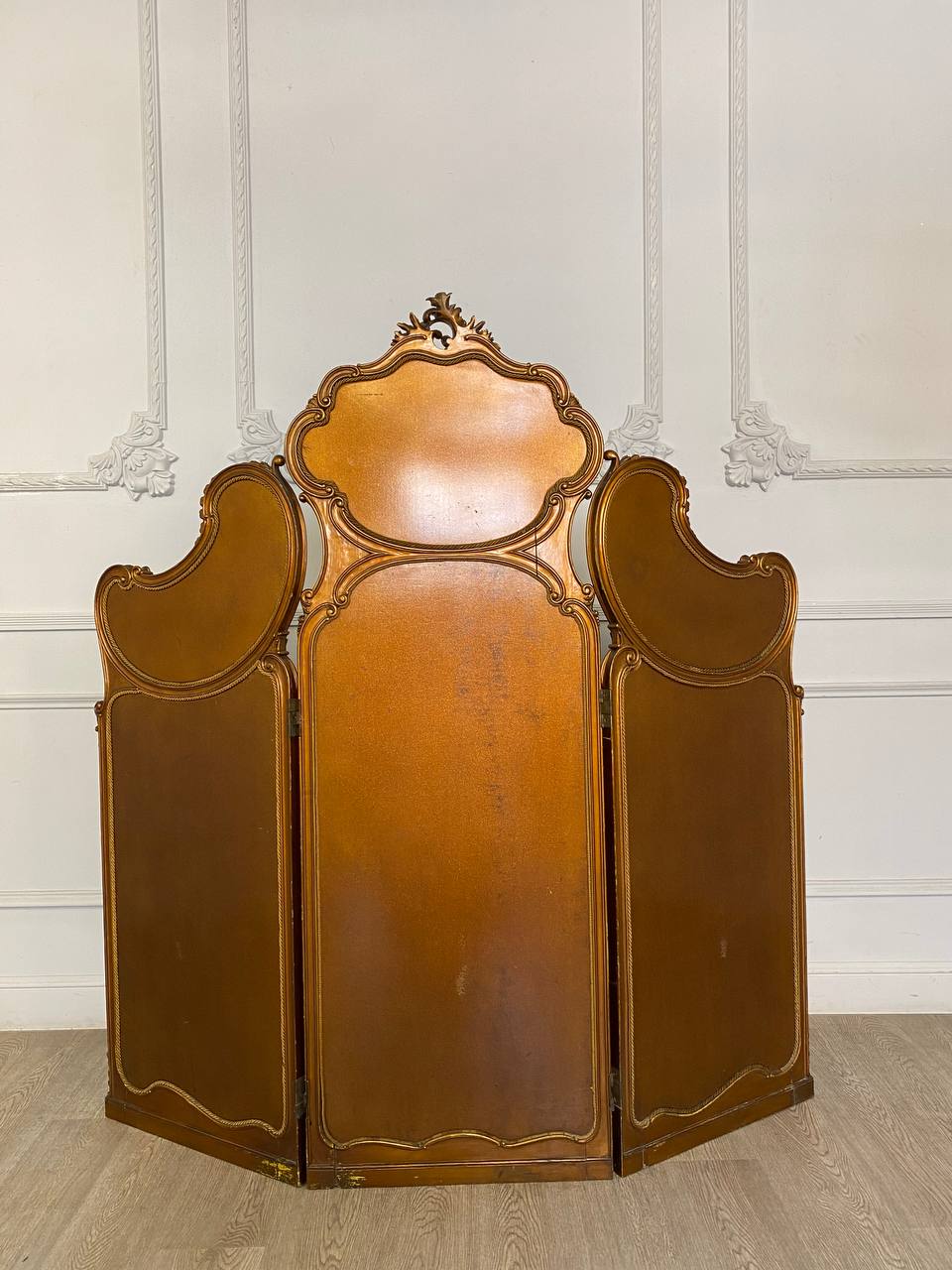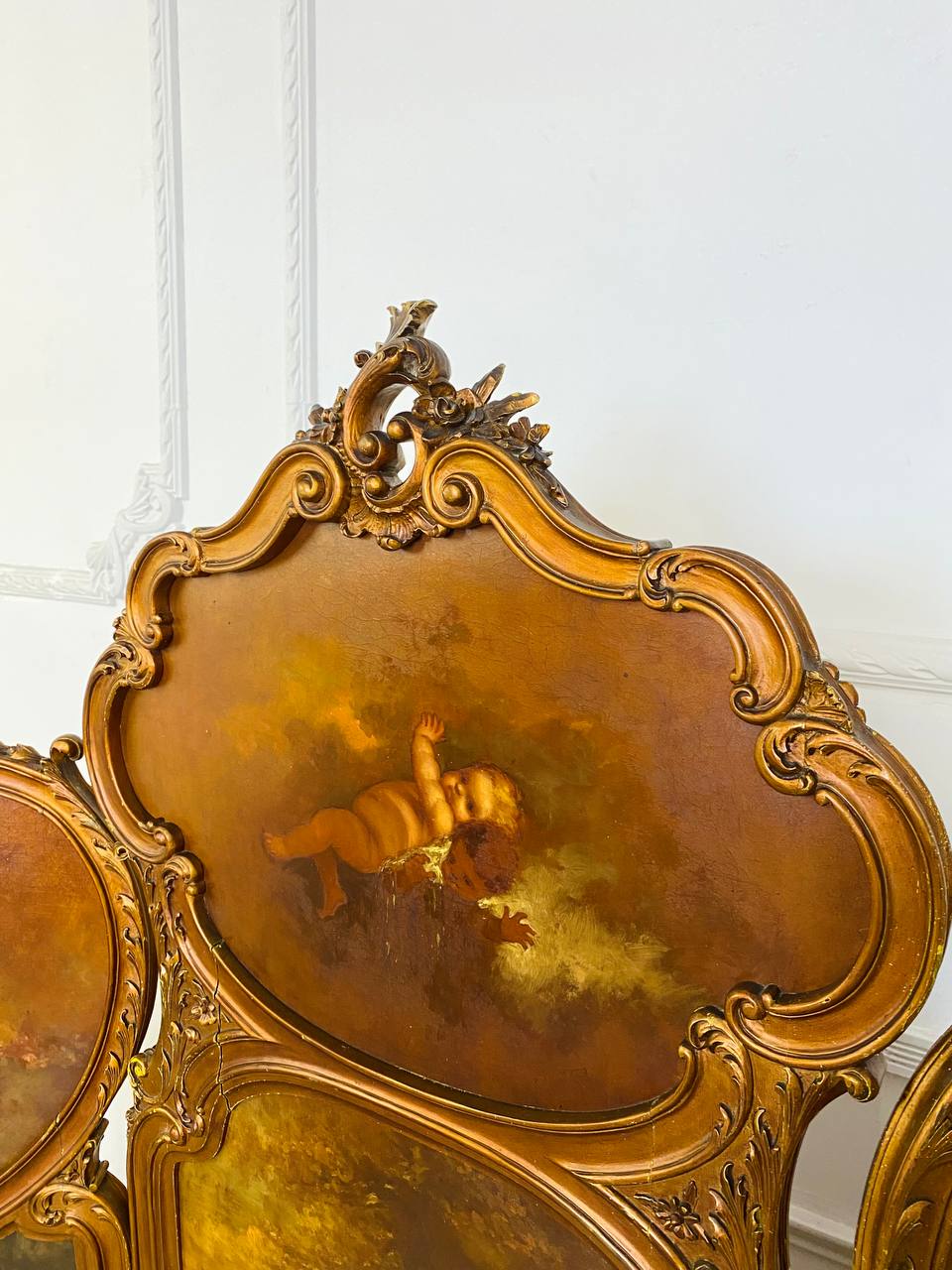 Ширма антикварная конца XIX века в стиле Louis XV, Франция. Выполнена из ореха и позолоты. Ширму украшают полотна с живописью. Размер 150х152h см.