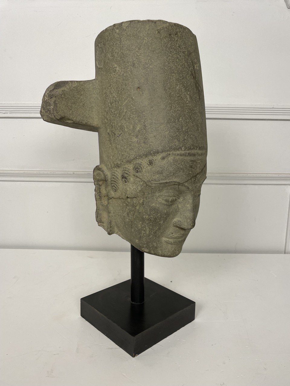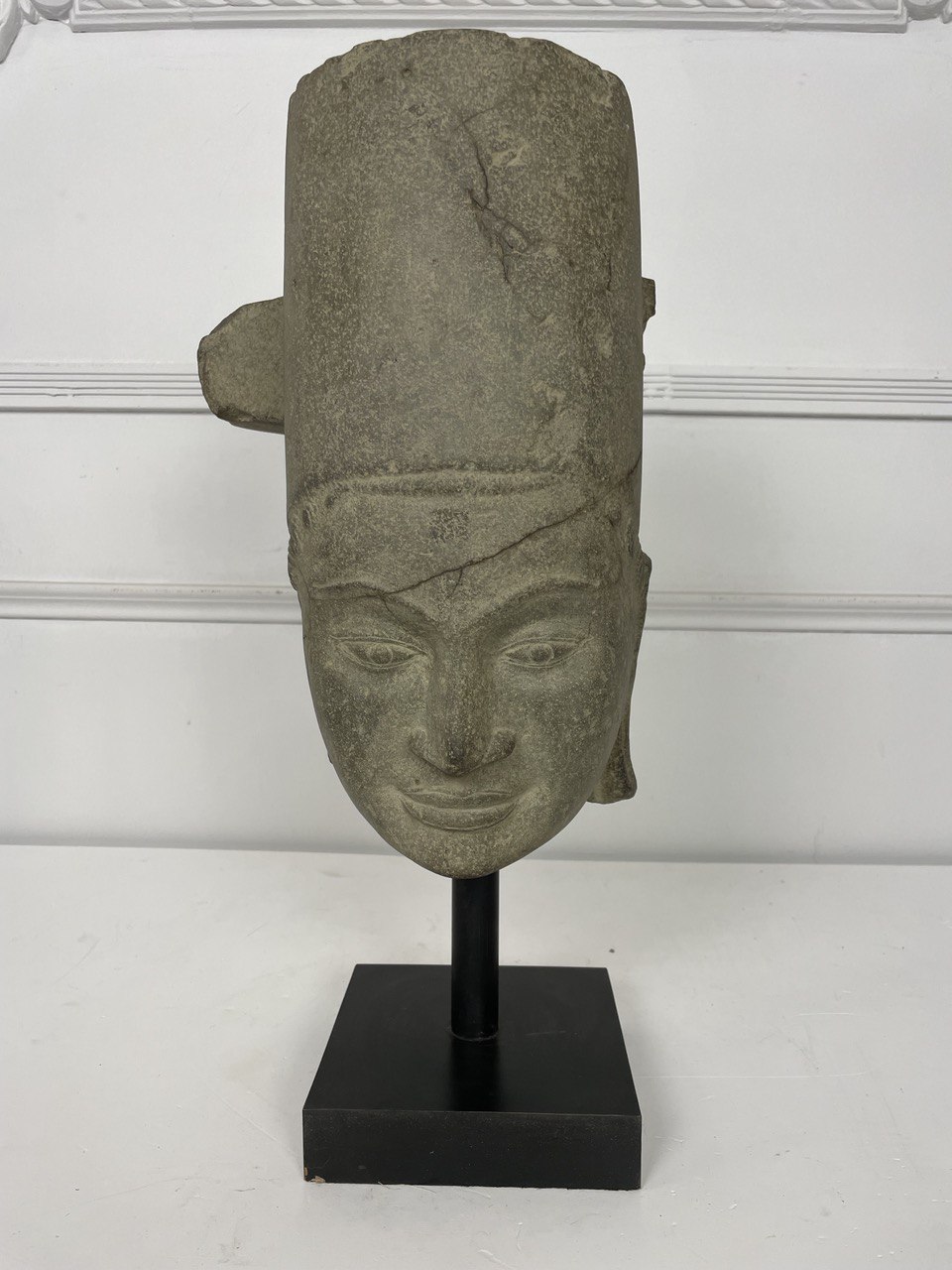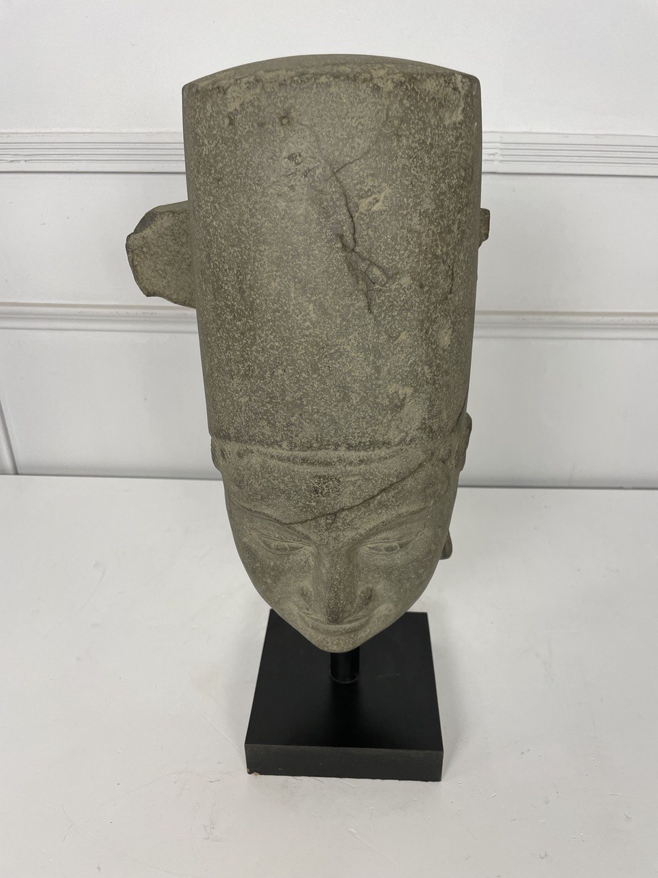 Скульптурная голова бога Вишну, Камбоджа, ХХ (?). Выполнена в традициях кхмерской монументальной пластики VII века. Песчаник, металлический постамент. Размер 26х26х53h см.