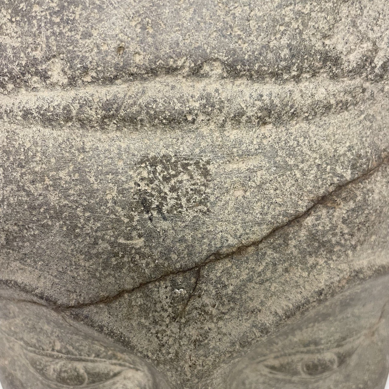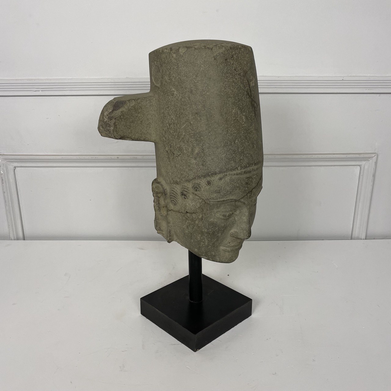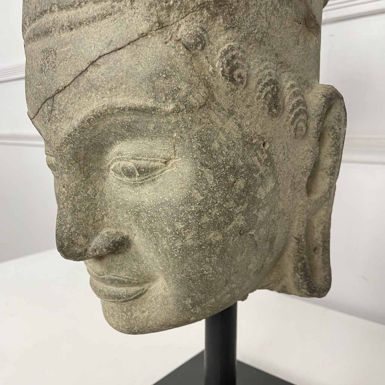 Скульптурная голова бога Вишну, Камбоджа, ХХ (?). Выполнена в традициях кхмерской монументальной пластики VII века. Песчаник, металлический постамент. Размер 26х26х53h см.