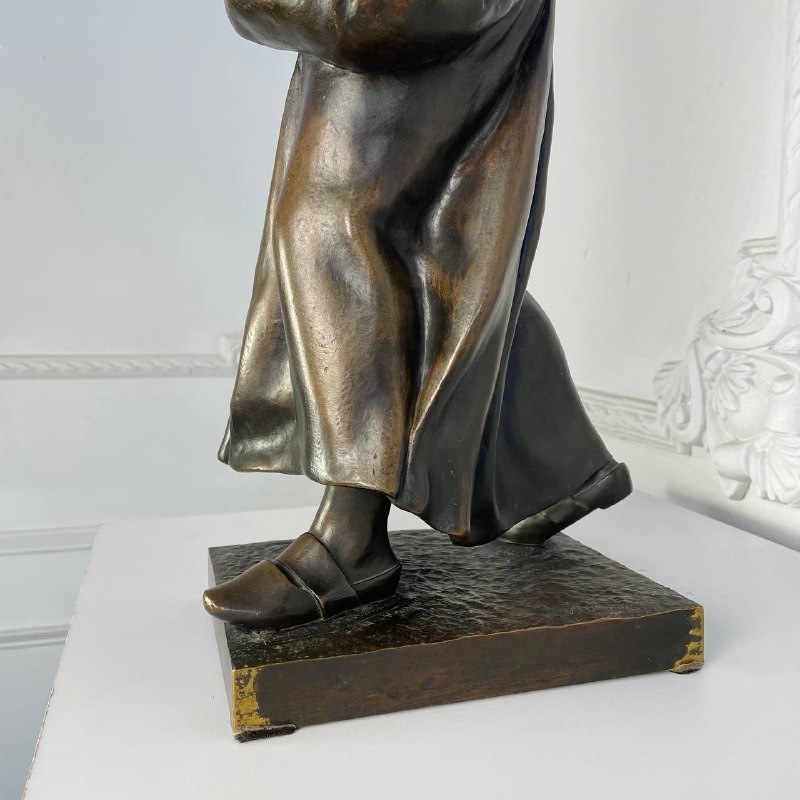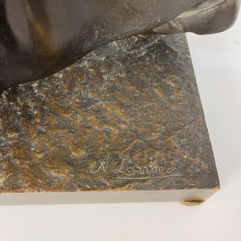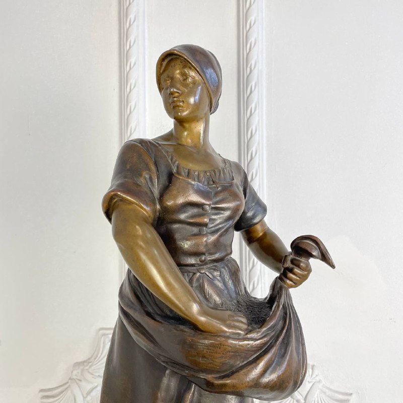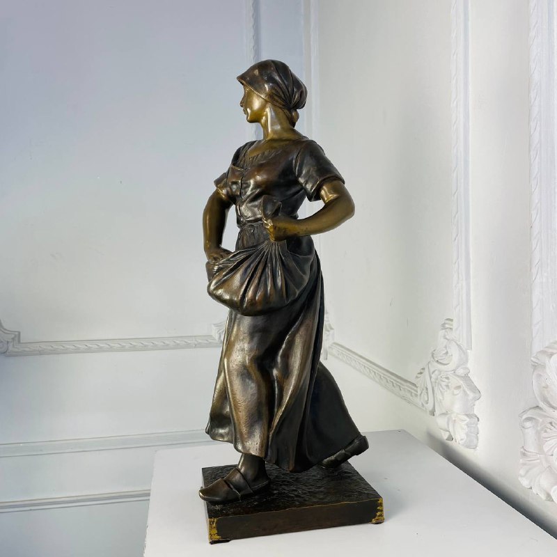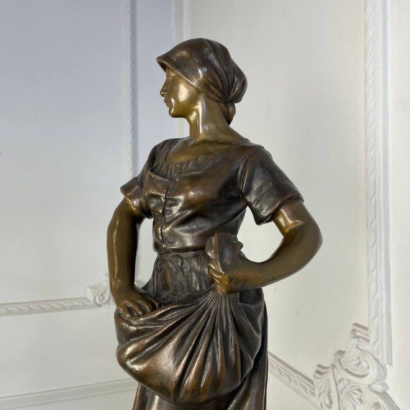 Подписная бронзовая скульптура "Крестьянка". Стоит подпись A. Larroux. Размер: 25х21х58h см. Антонен Ларру (1859-1913) - французский скульптор. Ученик знаменитого Александра Фальгьера. Участник художественного Салона Artistes Francais. Около 1900 года работал в стилистике Ар-Нуво, один из излюбленных образов - крестьянка с атрибутами труда или за сбором урожая. Литература: Jessica Goldring and Ben Macklowe et al, Dynamic Beauty: Sculpture of Art Noveau Paris, The Studley Press, Dalton, MA, 2011.