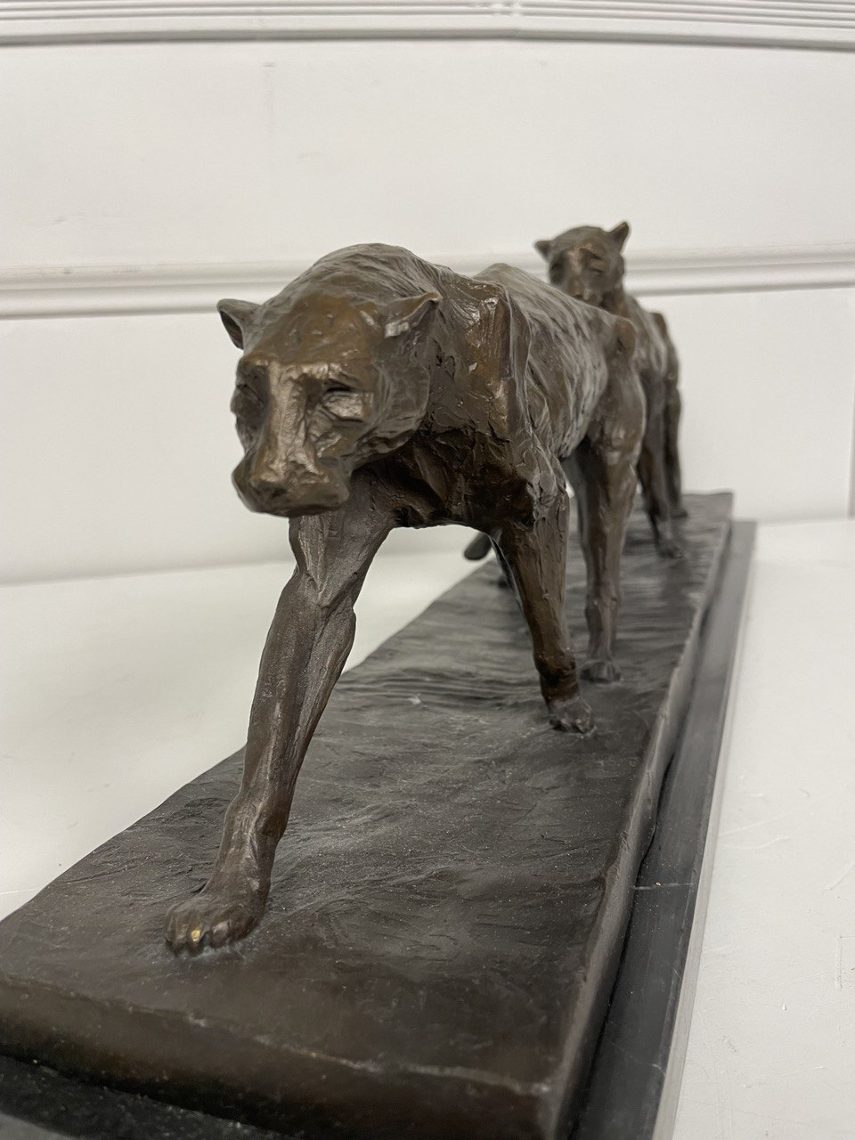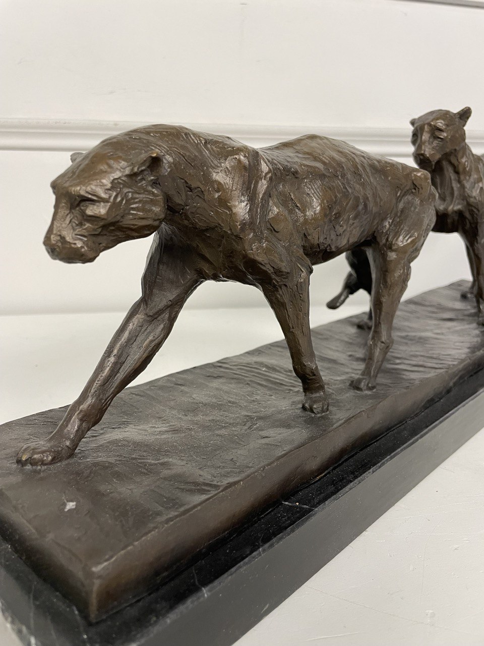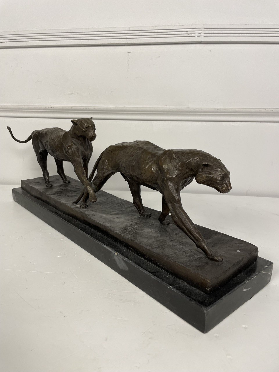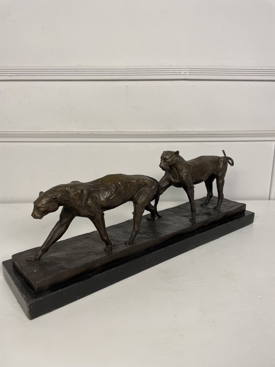 Антикварная скульптура «Идущие гепарды» начала XX века, Италия. Выполнена из бронзы и мрамора по мотивам одноименной работы скульптора Рембрандта Бугатти. Размер 65х16х22h см.