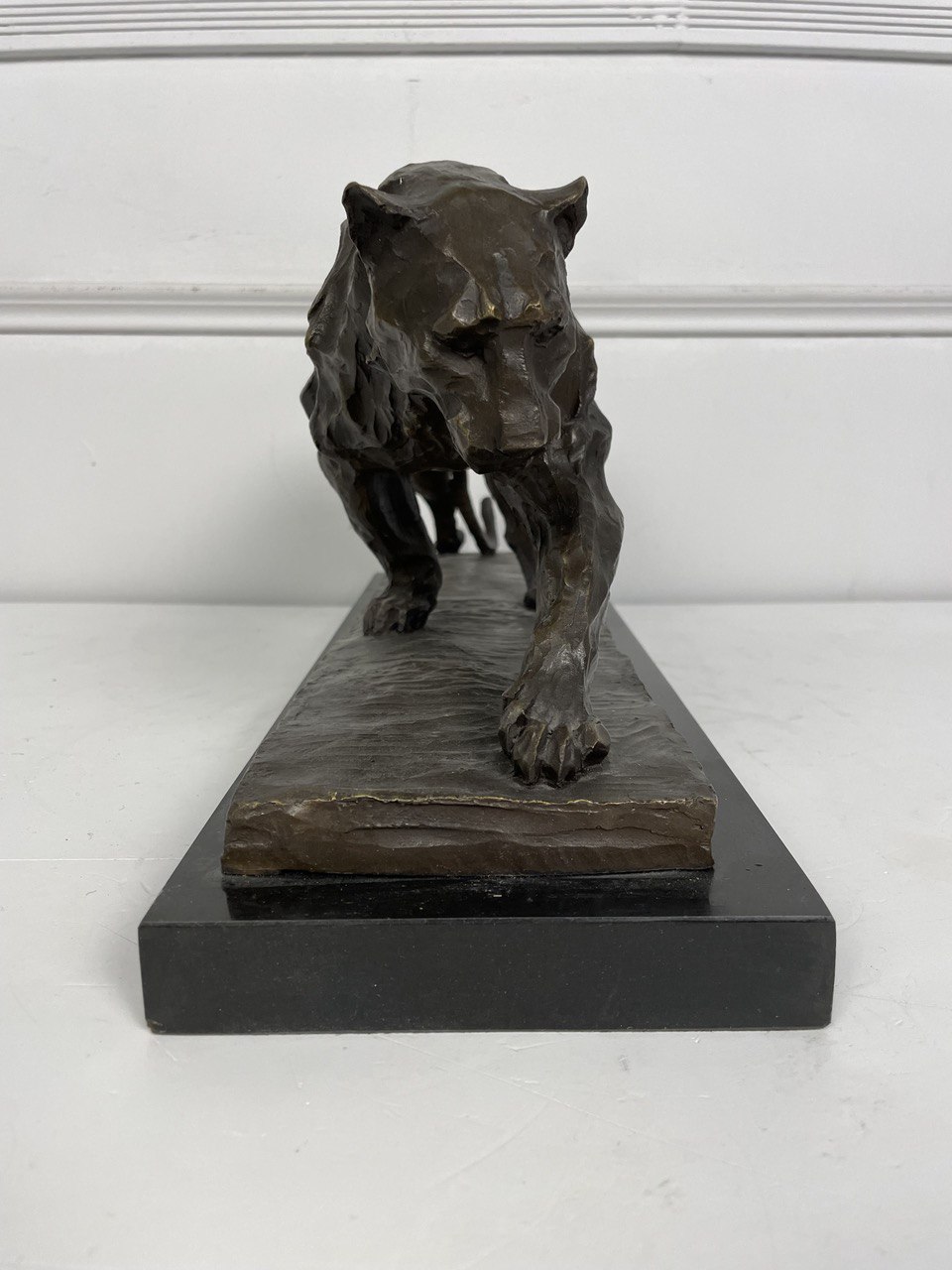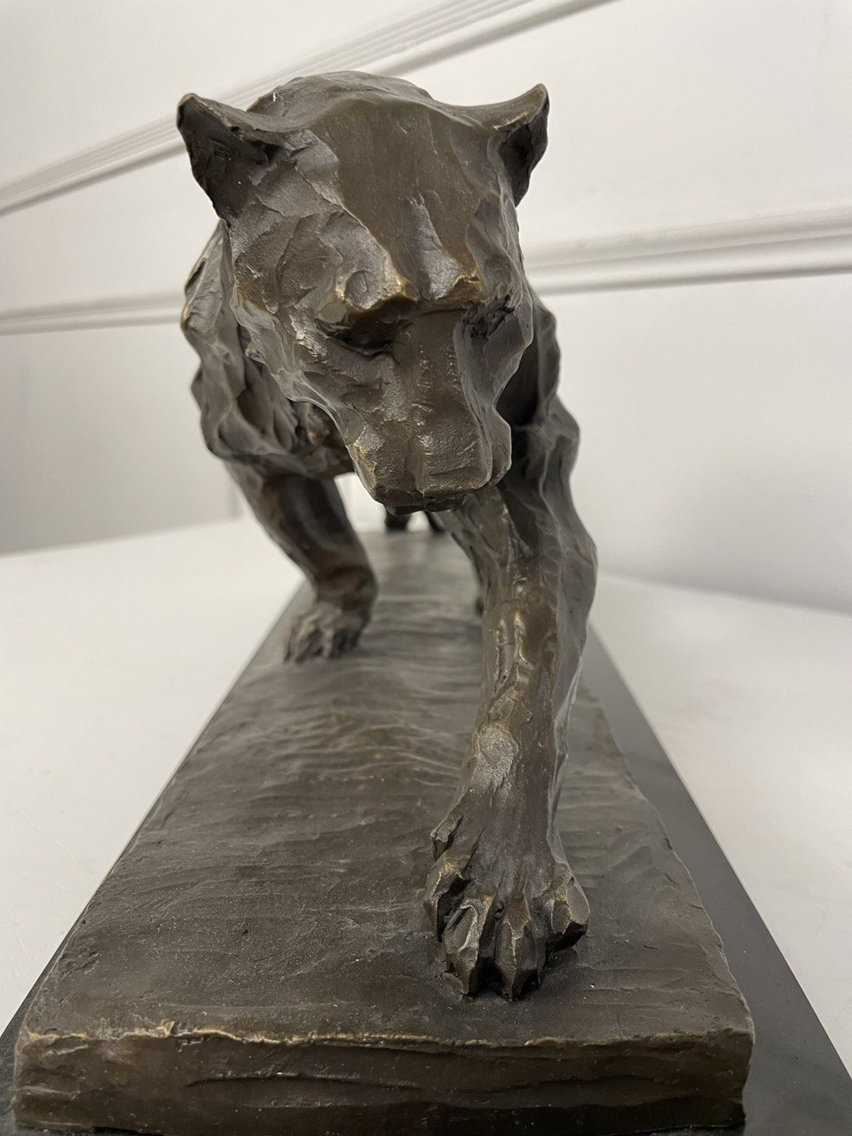 Антикварная скульптура «Леопард в движении» по мотивам одноименной работы знаменитого скульптора Рембрандта Бугатти 1911 года, Италия. Отлита между 1925-1934 годом. Стоит подпись. Бронза, мрамор. Размер 53х17х23h см.