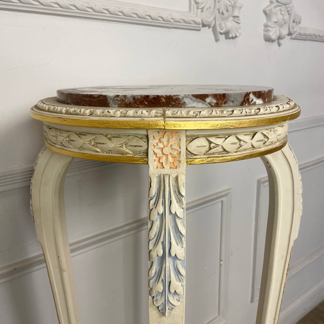 Старинная высокая подставка или столик в стиле Людовика XVI Европа, Франция. Первая половина XX века. Выполнена из ореха и натурального Ротанга. Столешница из натурального оригинального мрамора. Покрашена в белый цвет с позолотой. Диаметр столешницы 40 см. Высота 115 см.