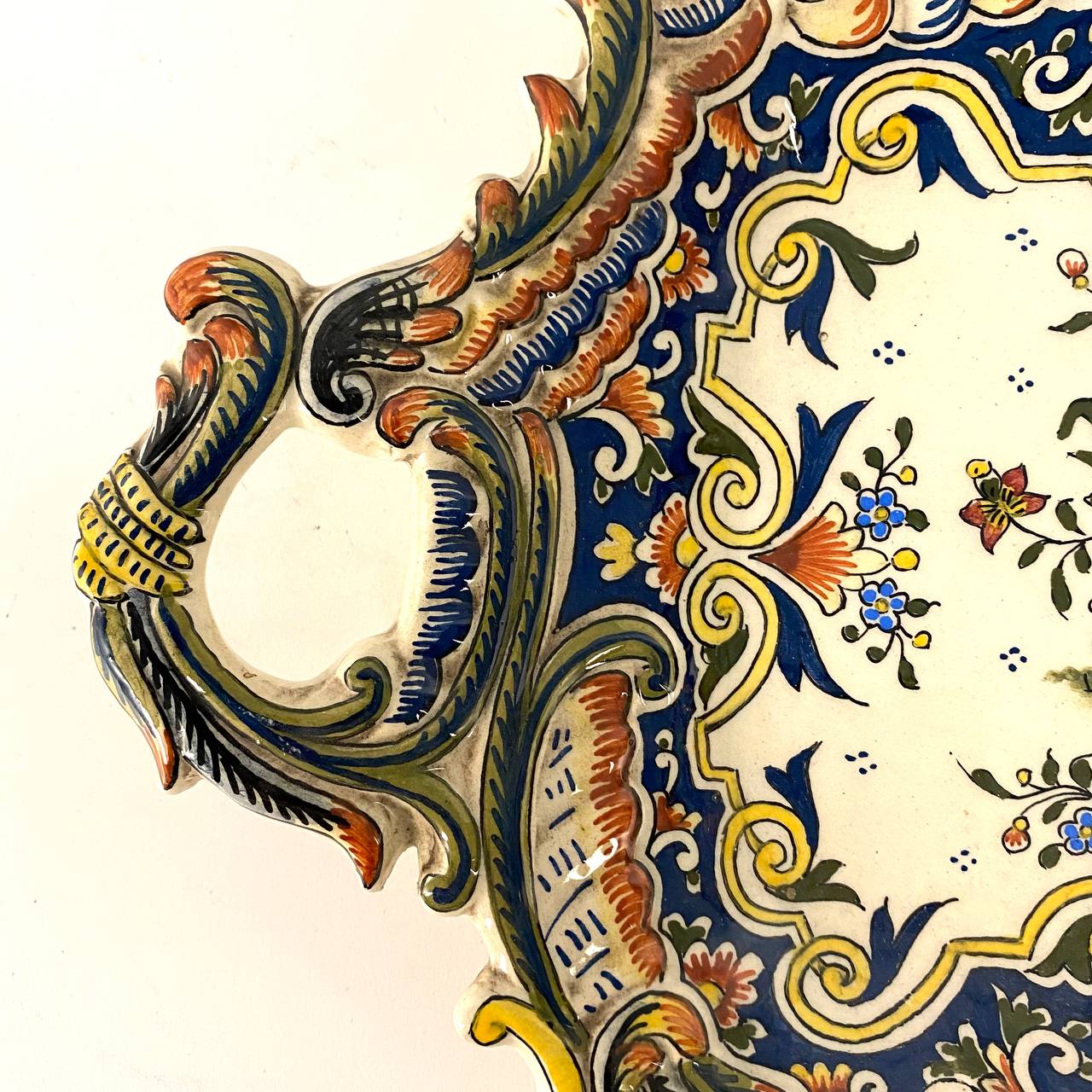 Антикварное блюдо известной мануфактуры Rouen (Нормандия), Франция. Начало XX века. Руан был центром производства французского фаянса и глиняной посуды с оловянным покрытием, по крайней мере, с 1540-х годов. Руанский фаянс был полностью французским по стилям, хотя позднее на него оказал влияние китайский фарфор. В Руане было разработано несколько стилей, рисунков с характерным орнаментом, который стал их визитной карточкой во всем мире. Фаянс, ручная роспись. Размер 37х25х5h см.