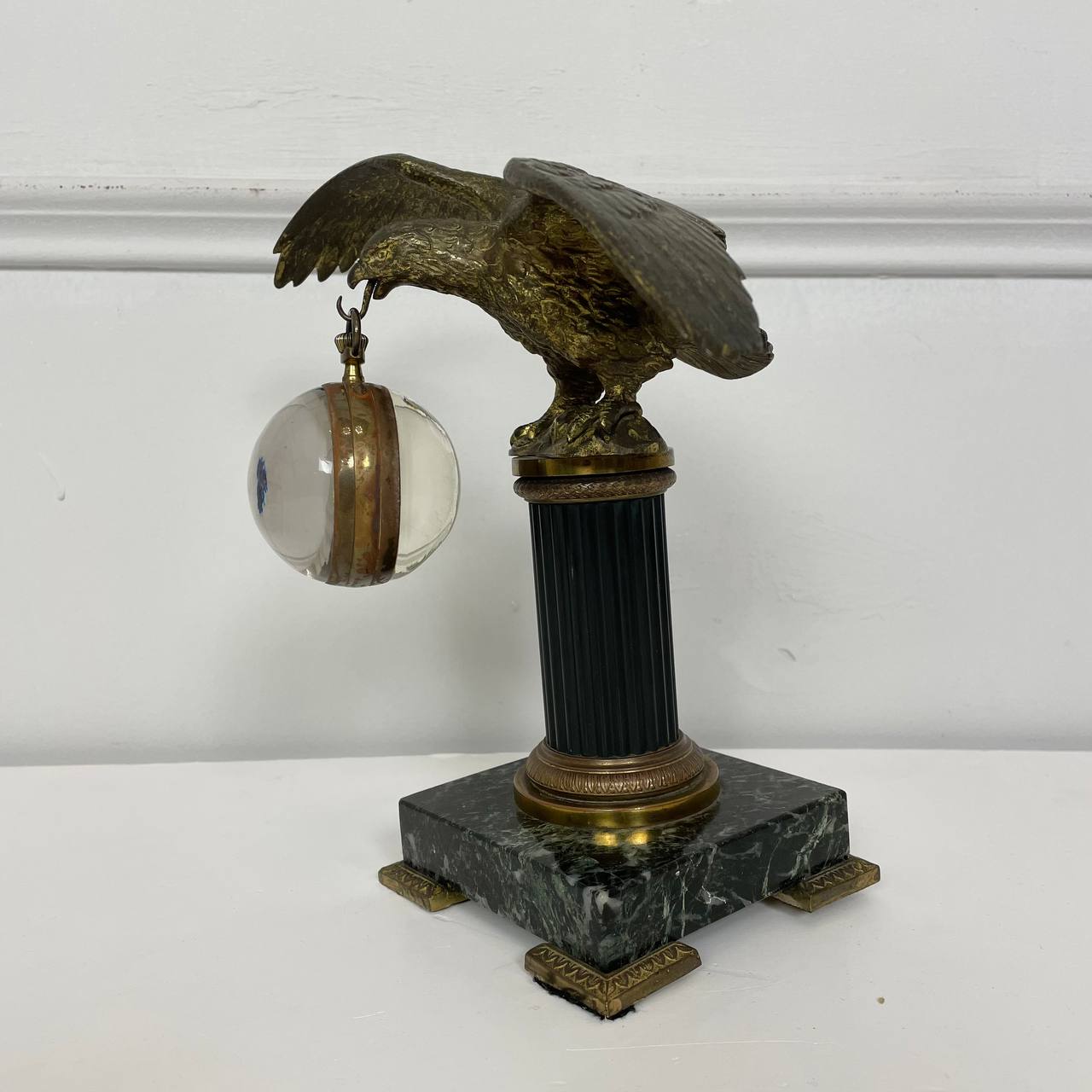 Антикварные часы «Орёл» начала XX века, Франция. Бронзовый орёл на мраморном основании держит в клюве шар с часами. Размер 23х16х22h см
