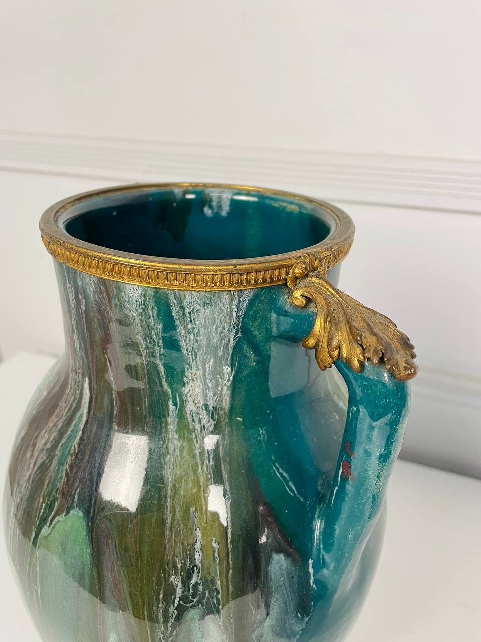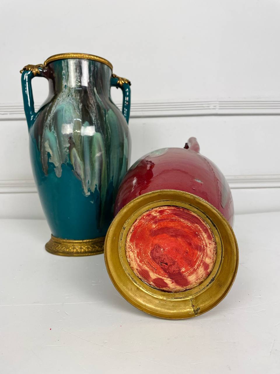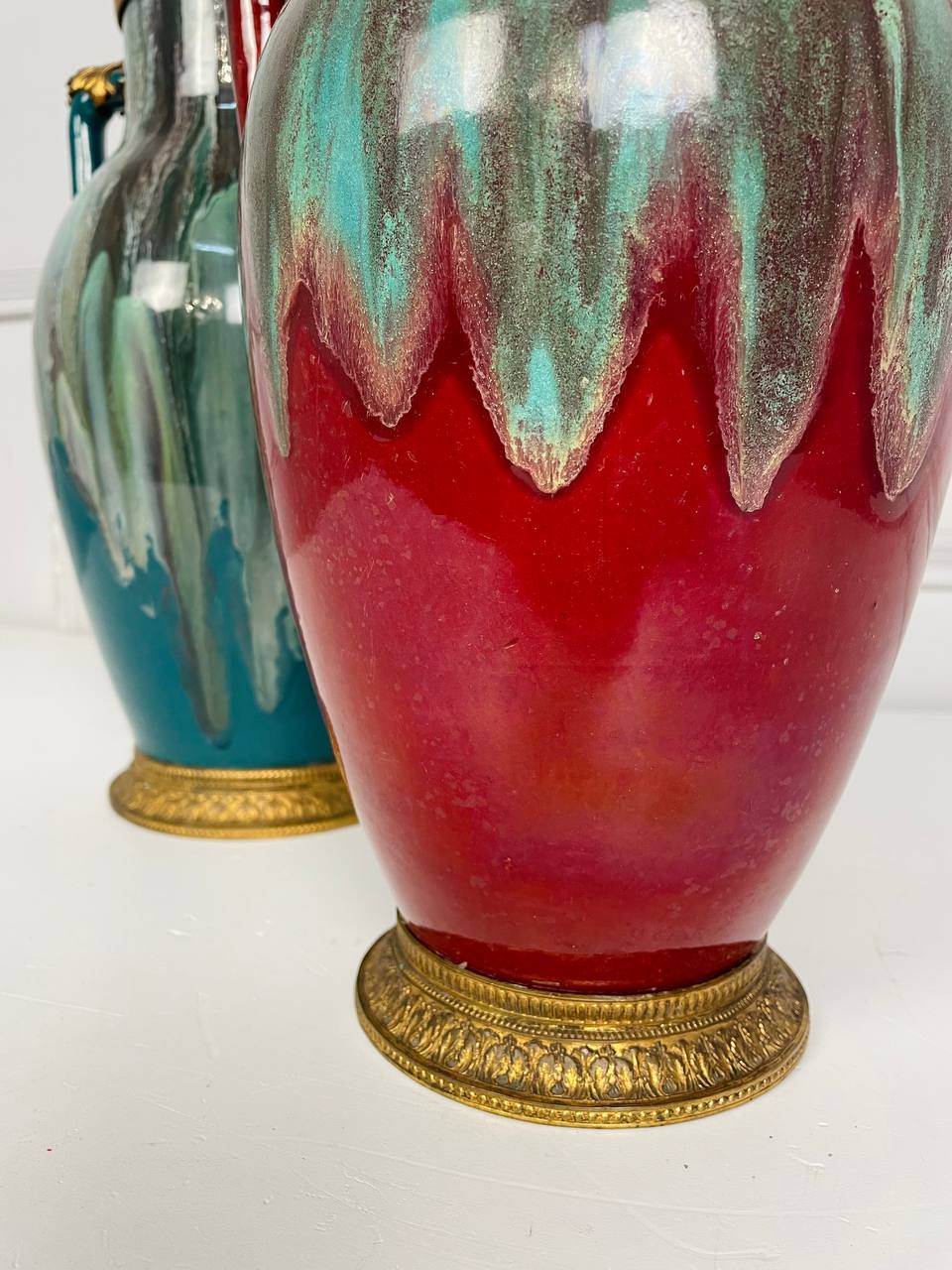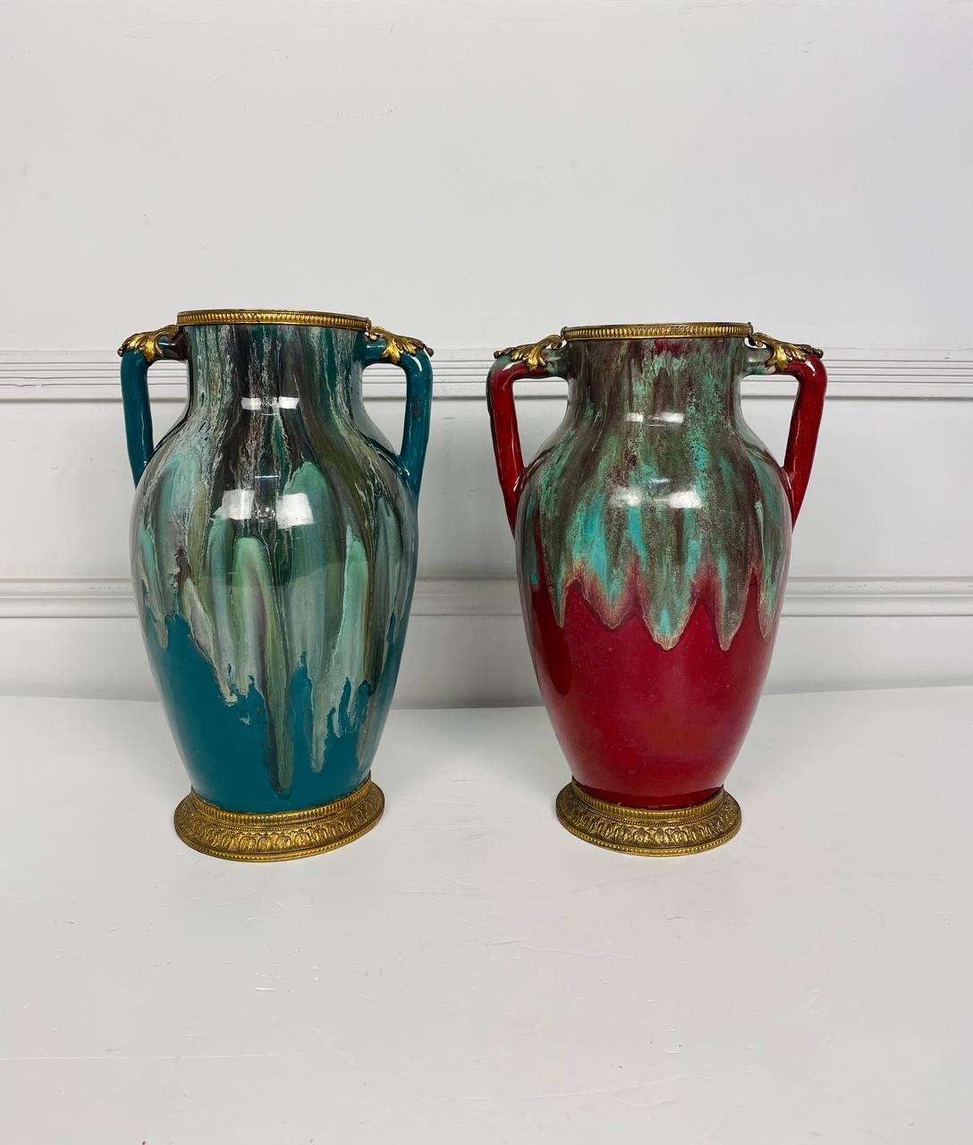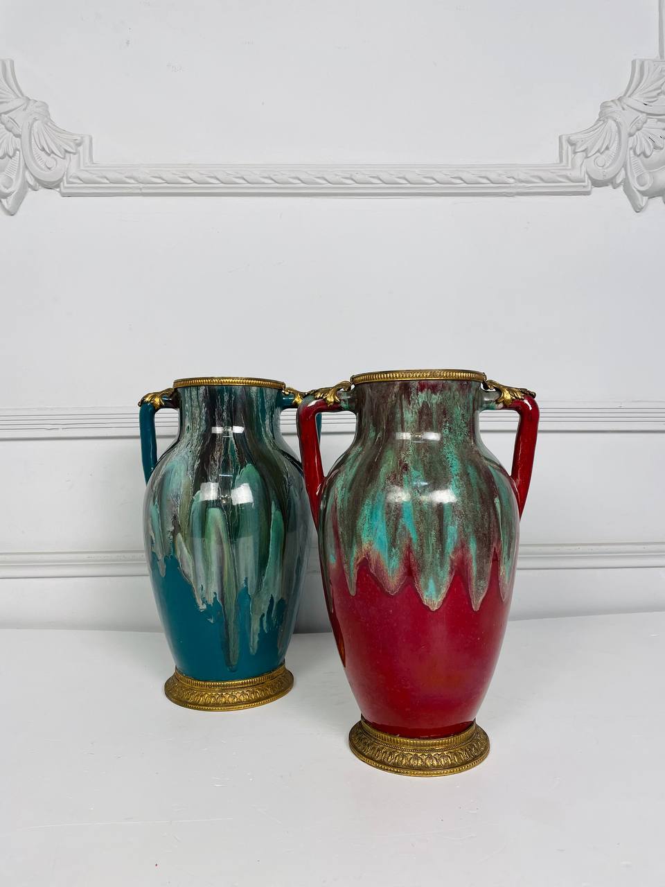 Парные вазы в технике Барботин начала XX века, возможно конец XIX века, Франция. Выполнены из керамики, майолика, бронза. Стоит клеймо на бронзе France. Высота 34 и 33 см. Ширина по ручкам 21 см. Диаметр горловины 12 см.