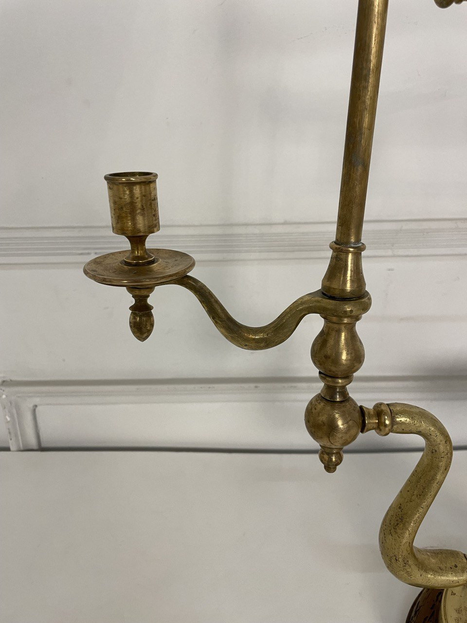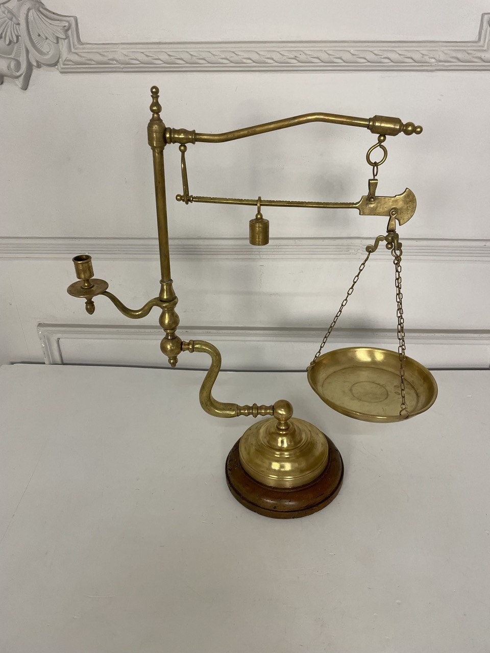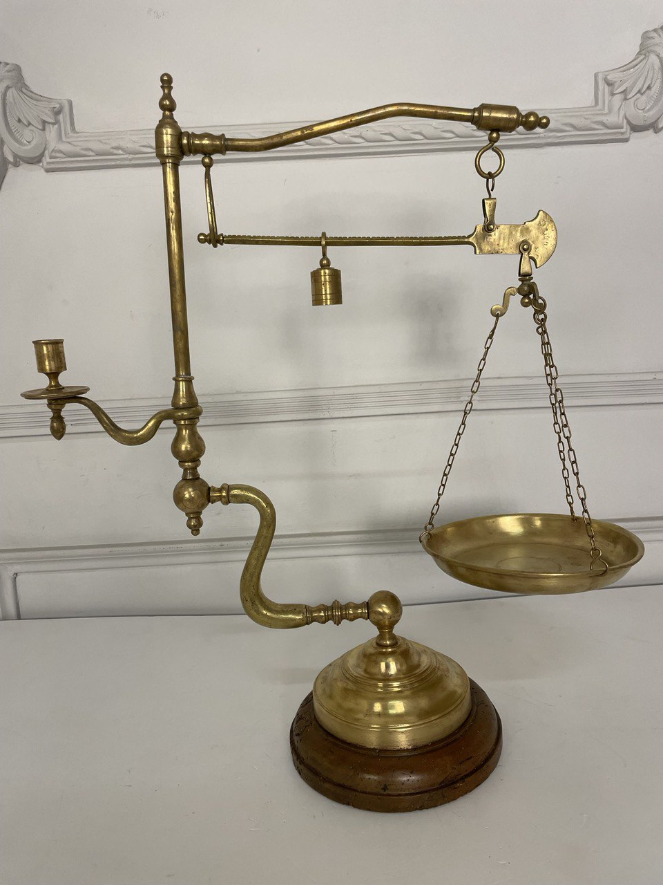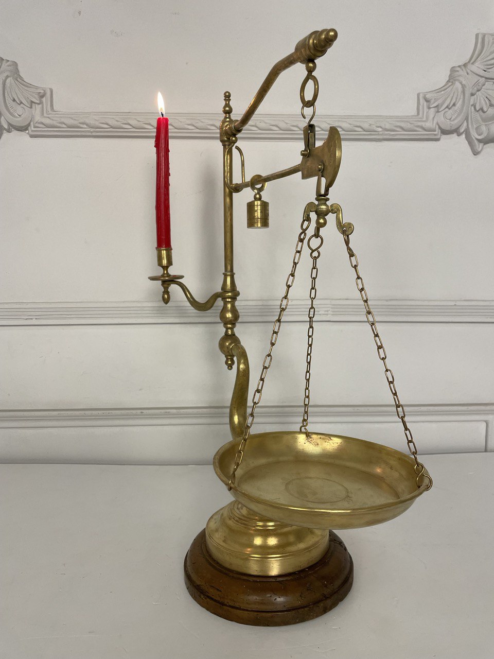 Антикварные весы начала XX века, Франция. Выполнены из латуни и дерева. С одной стороны находится элегантный подсвечник. Размер 57х21х60h см.