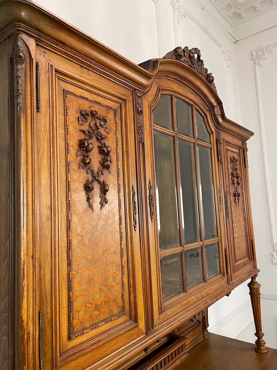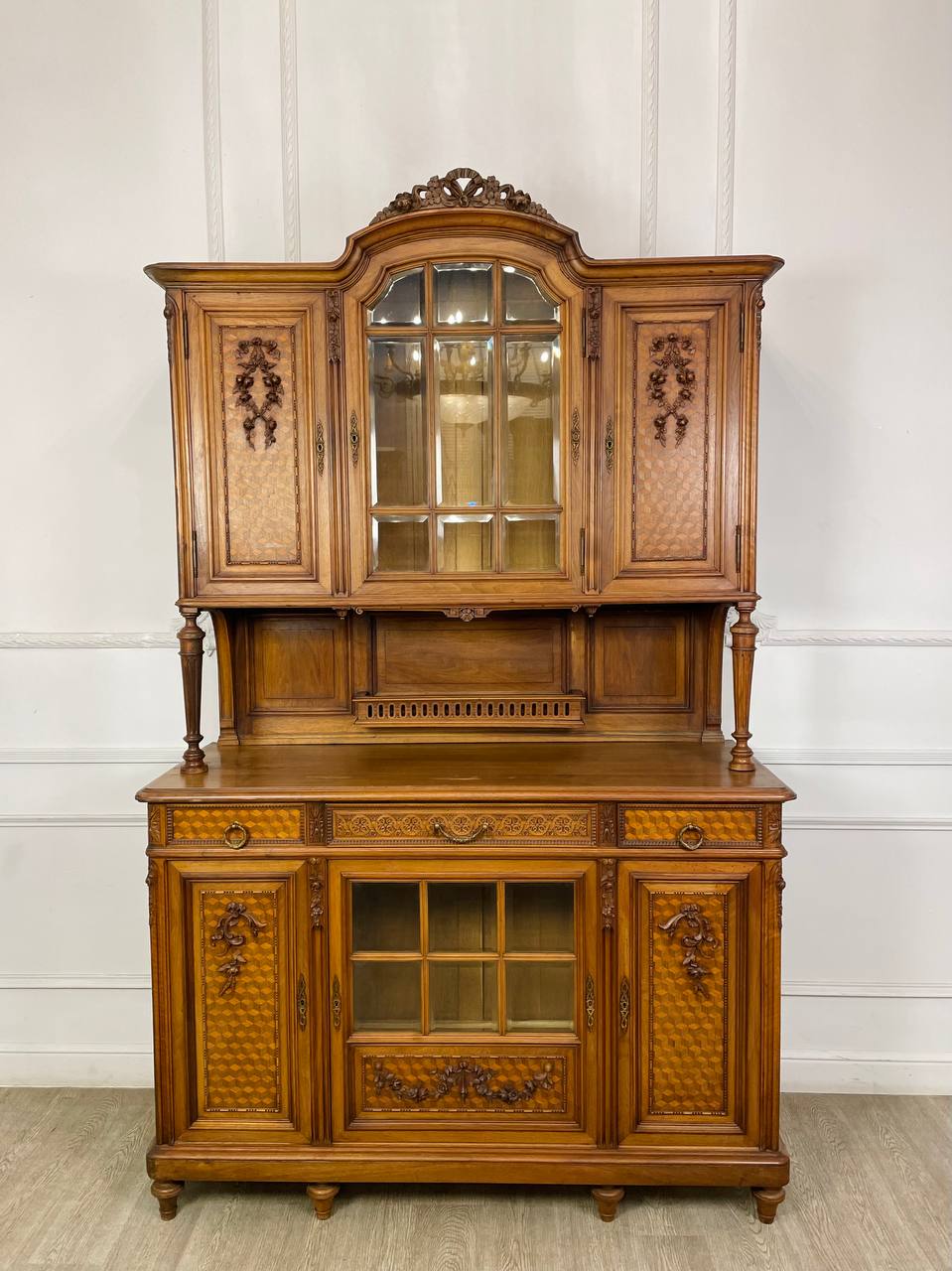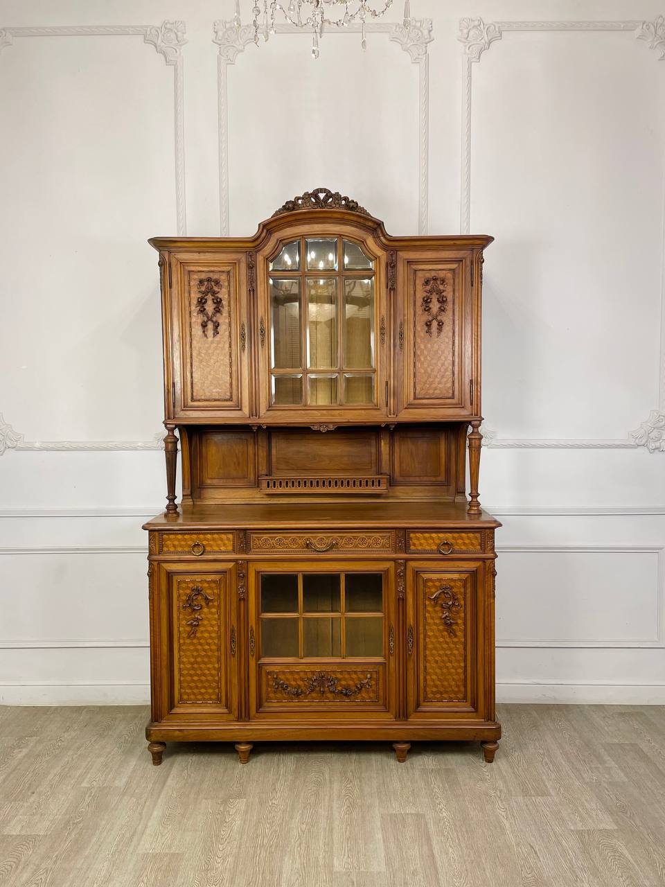 Антикварный буфет рубежа XIX-XX веков, Франция. Выполнен из массива ореха. Паркетри, резьба ручной работы. Оригинальные стекла с фацетом. Размер 150х55х240h см.