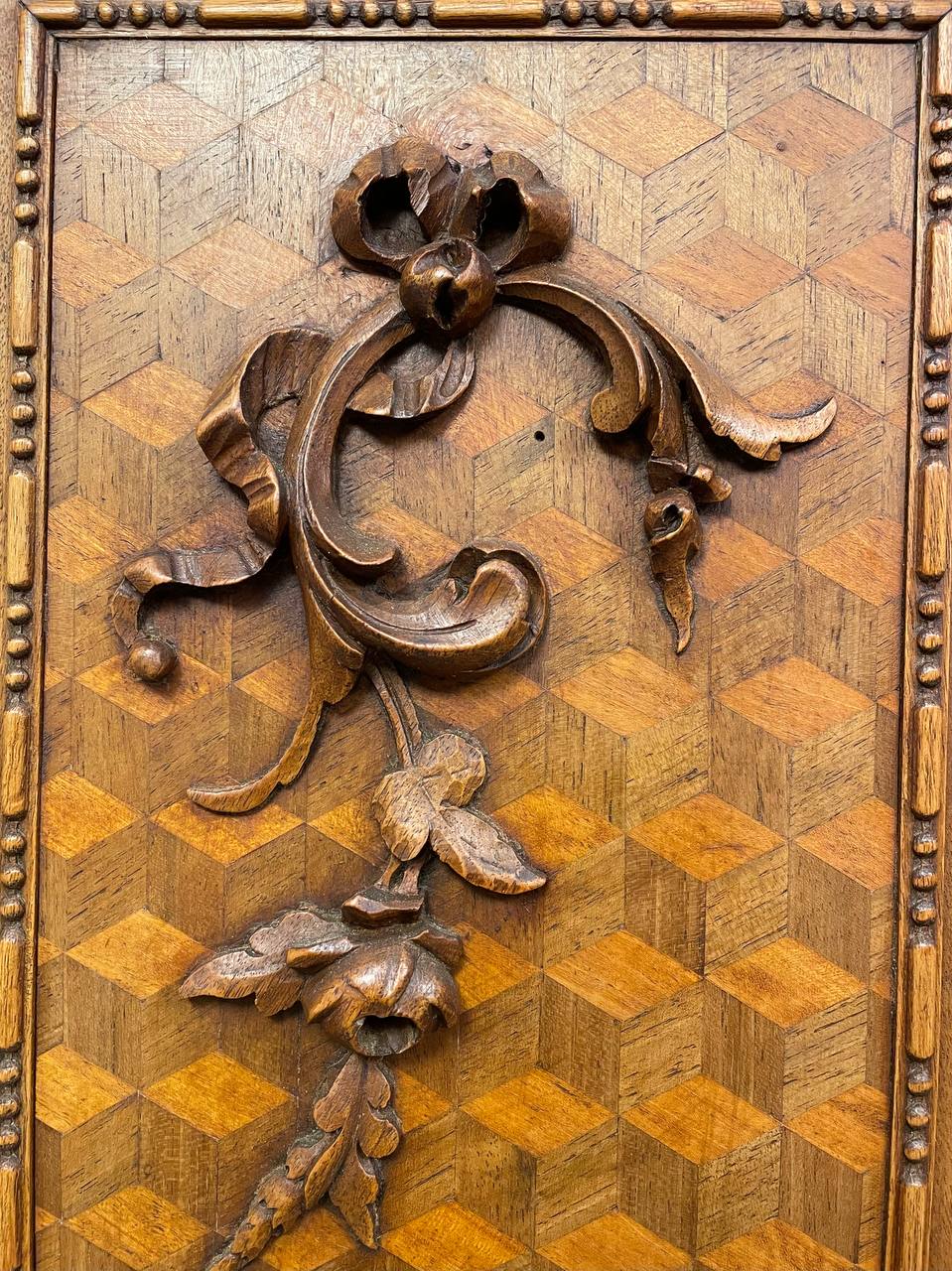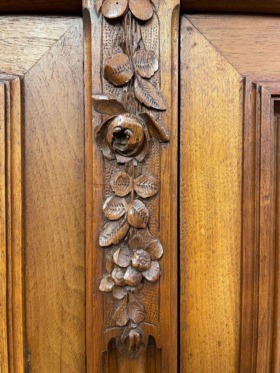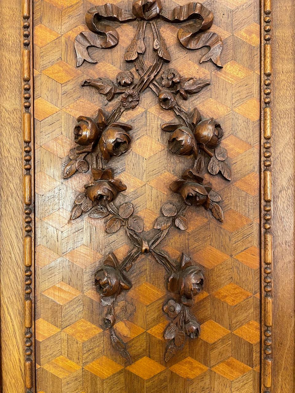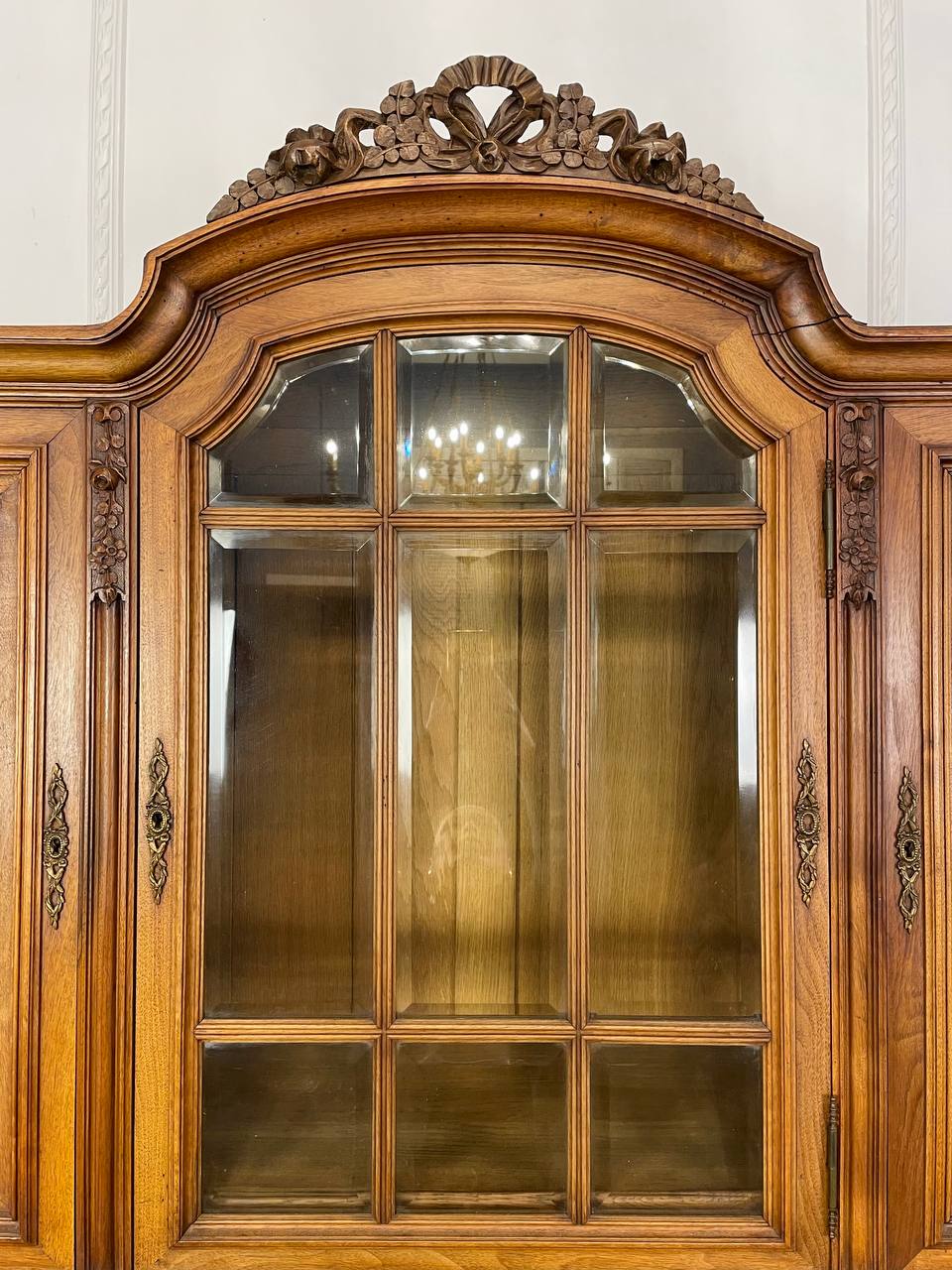 Антикварный буфет рубежа XIX-XX веков, Франция. Выполнен из массива ореха. Паркетри, резьба ручной работы. Оригинальные стекла с фацетом. Размер 150х55х240h см.