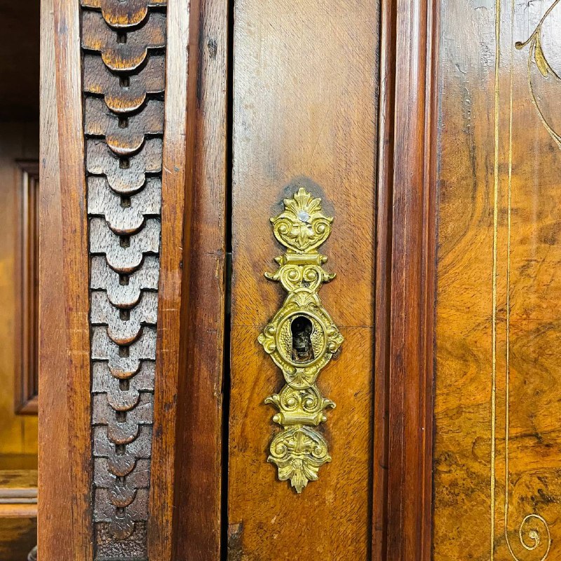 Изящный поставец, конец ХIХ века, Франция. Массив ореха и корень ореха, позолота. Родная бронзовая фурнитура. Три выдвижных ящичка, закрывающихся на ключ (ключики в комплекте). Размер: 120х52х210h см.