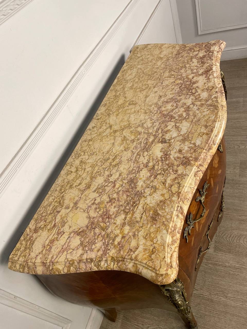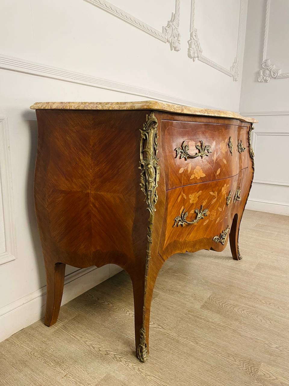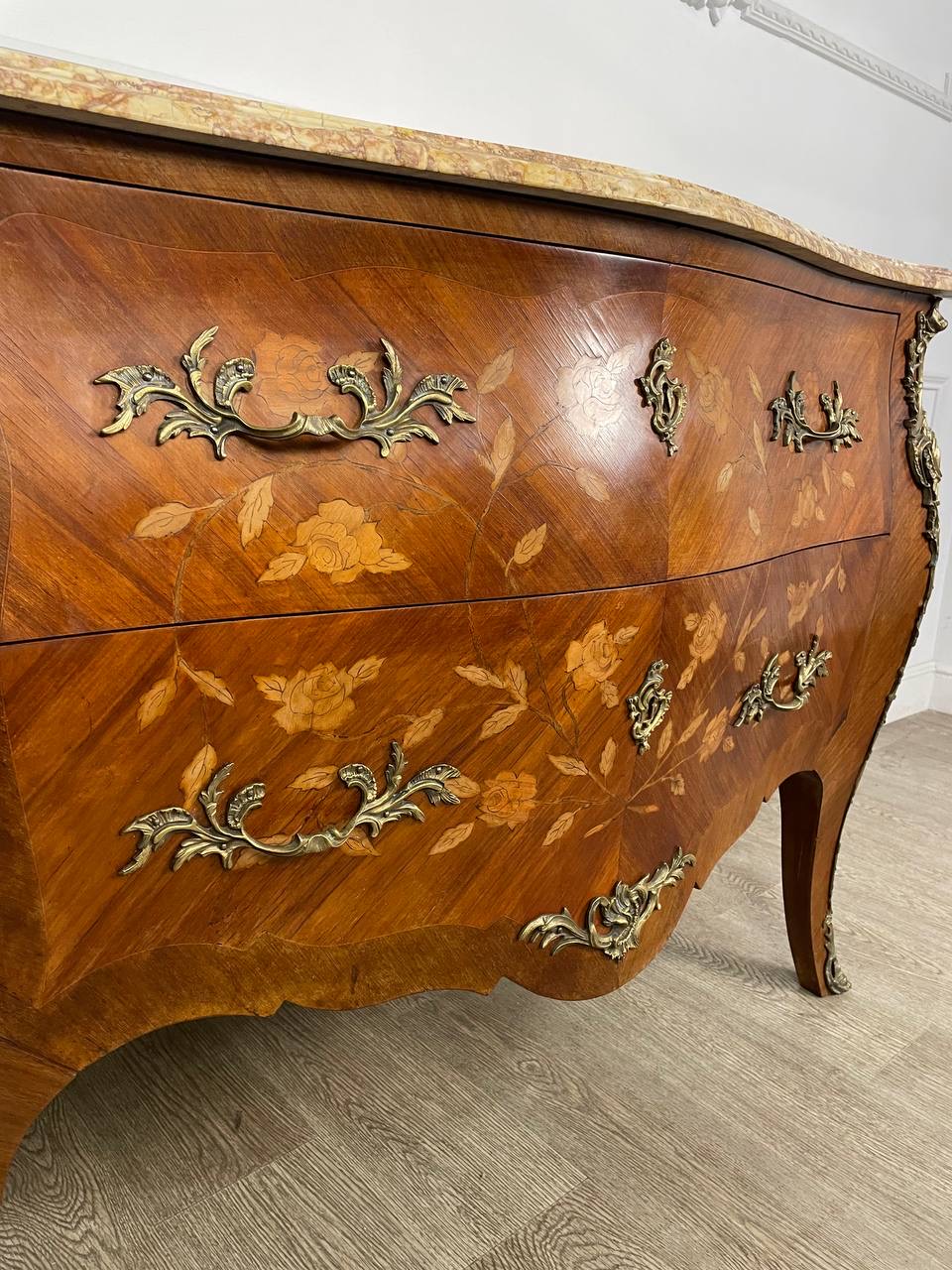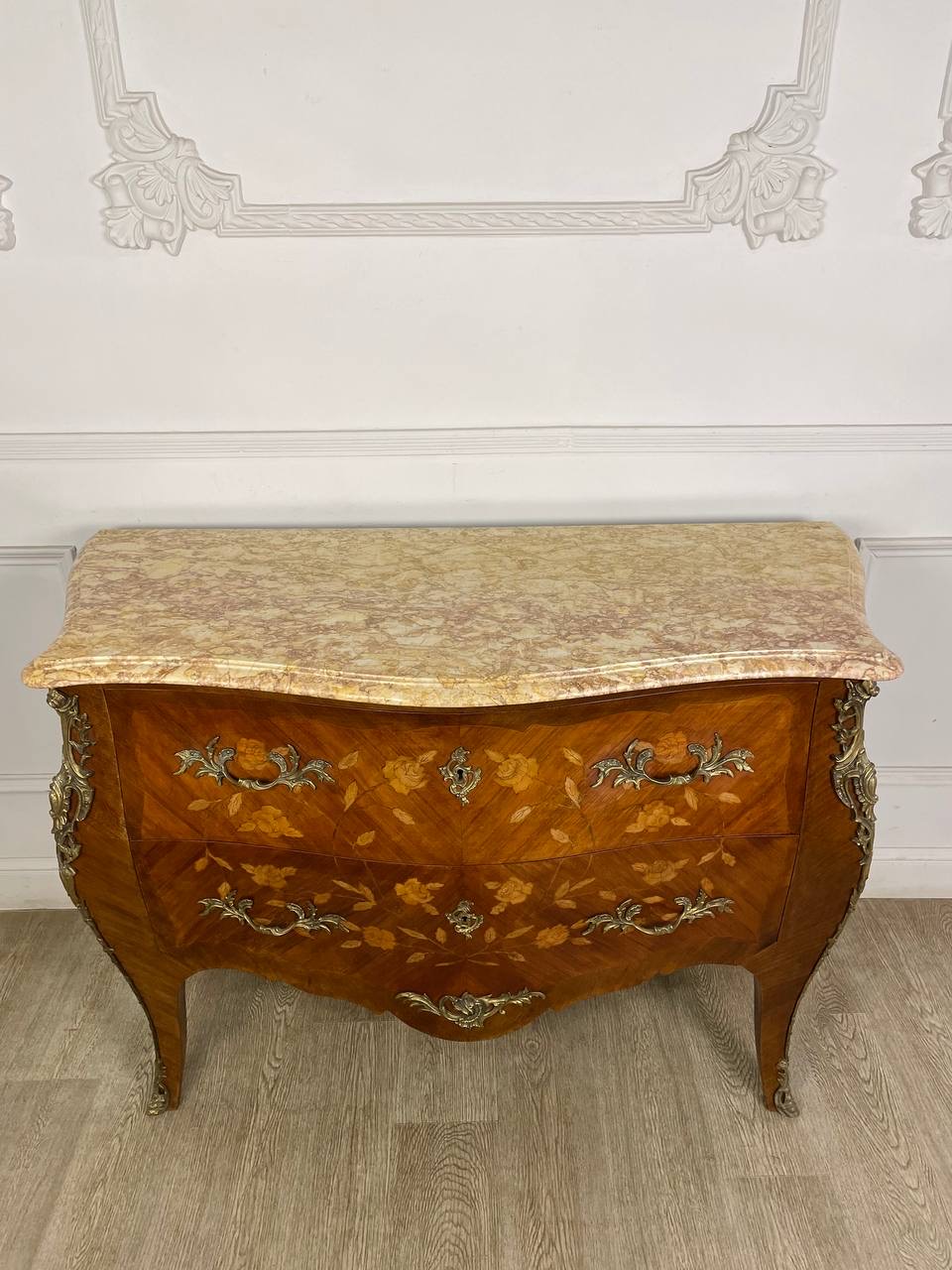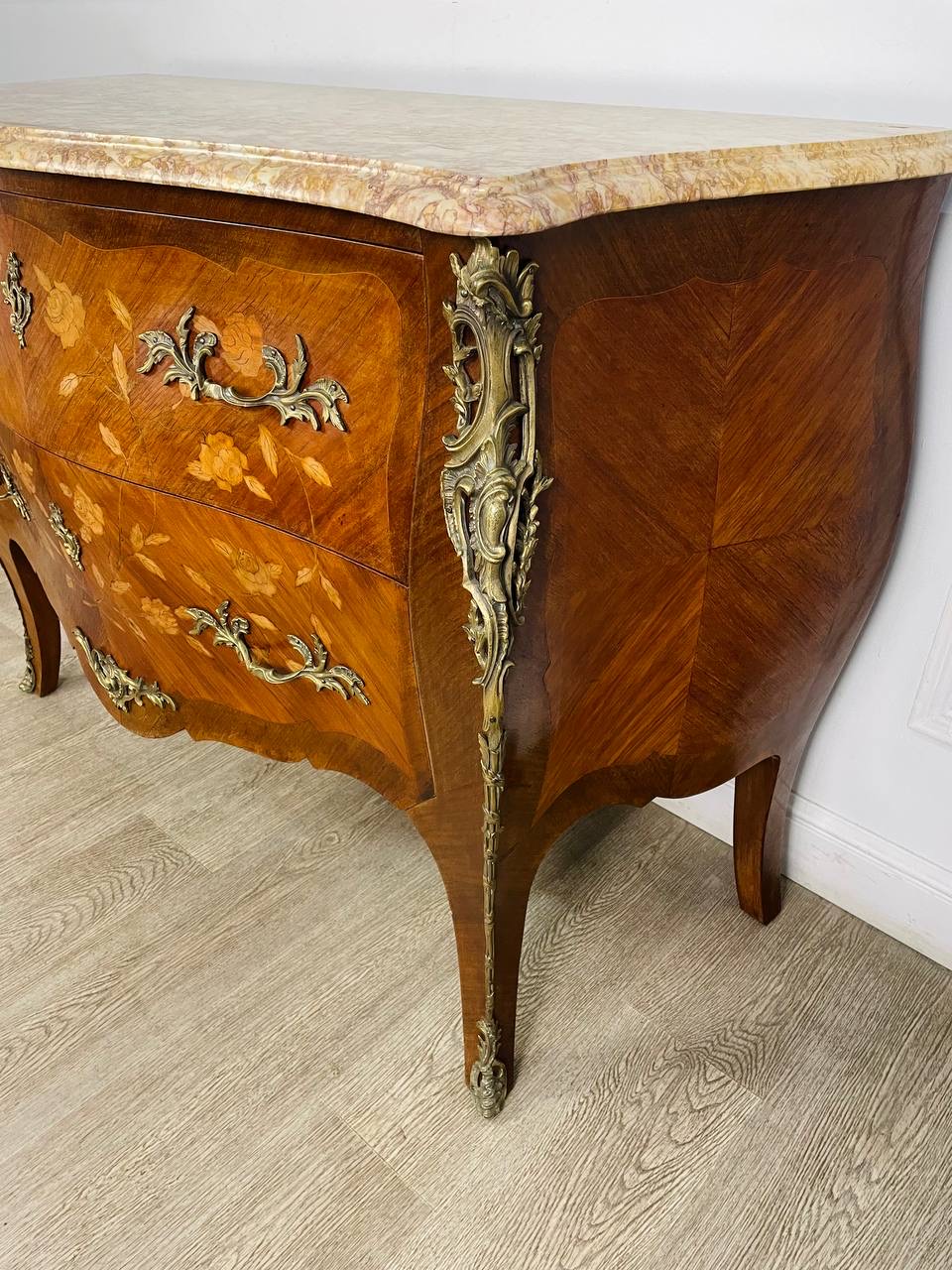 Антикварный комод первой половины XX века, Франция. Выполнен из розового дерева, маркетри. Оригинальная бронзовая фурнитура. Оригинальная мраморная столешница. Два объемных выдвижных ящика. Размер 125х52х85h см.