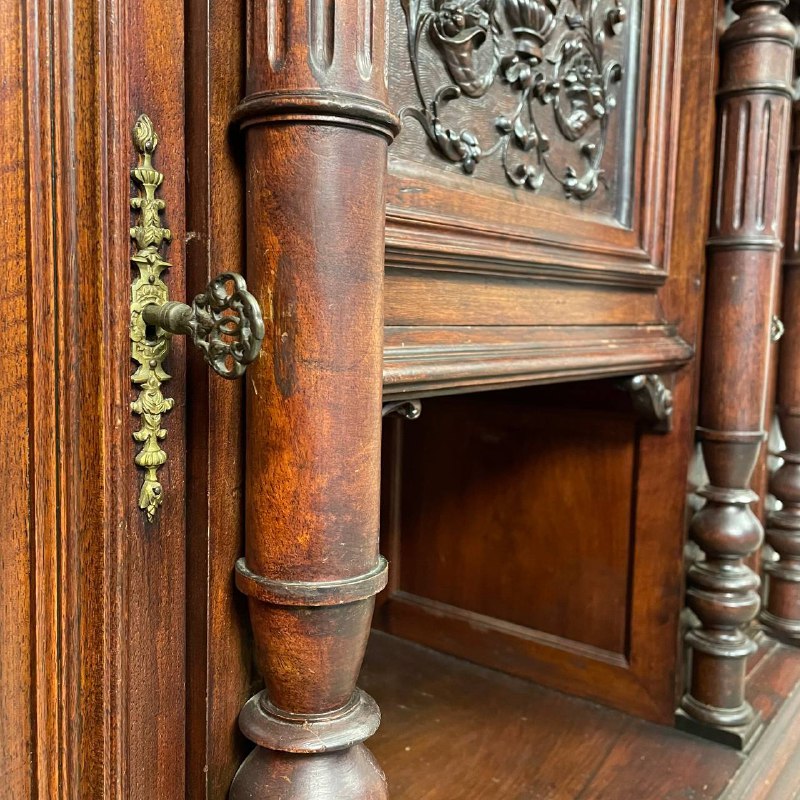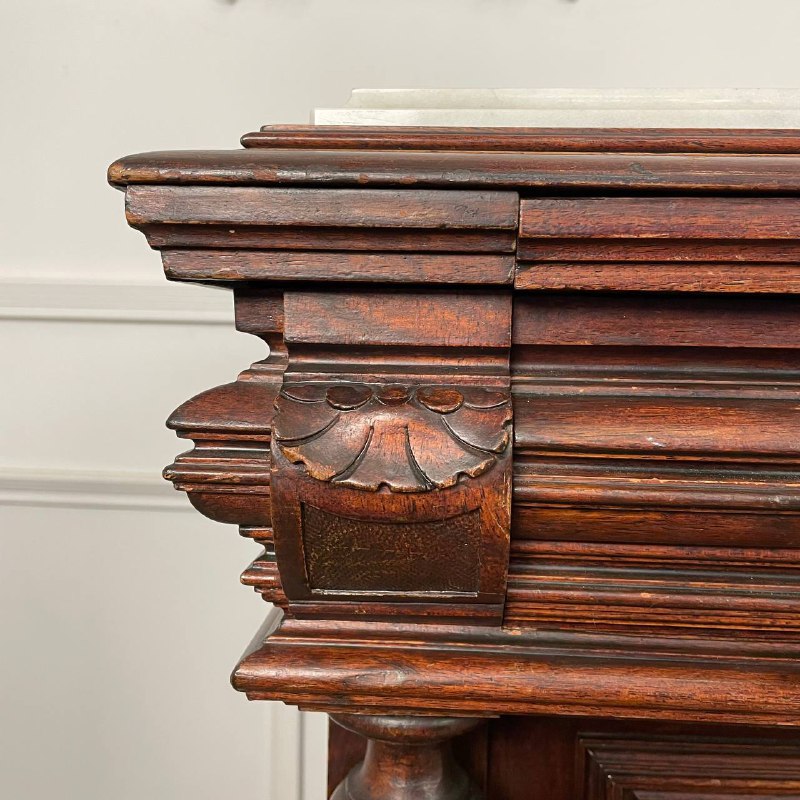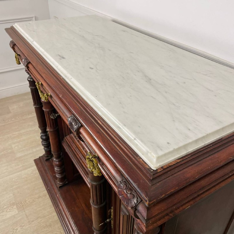 Антикварный поставец, рубежа ХIХ-ХХ века, Бельгия. Массив ореха, тонировка. Мраморная столешница, бронзовая фурнитура. Размер: 125х51х101h см.