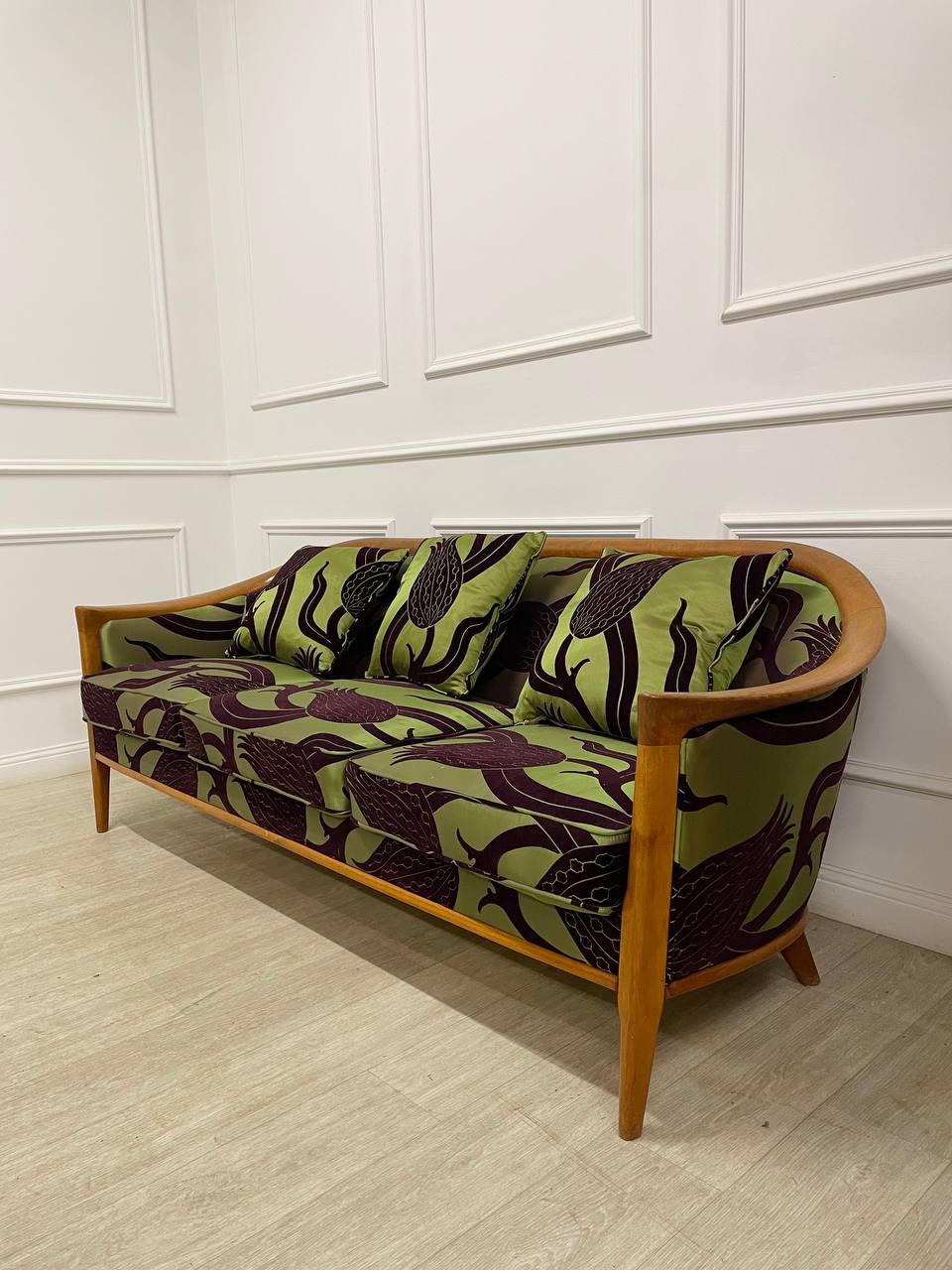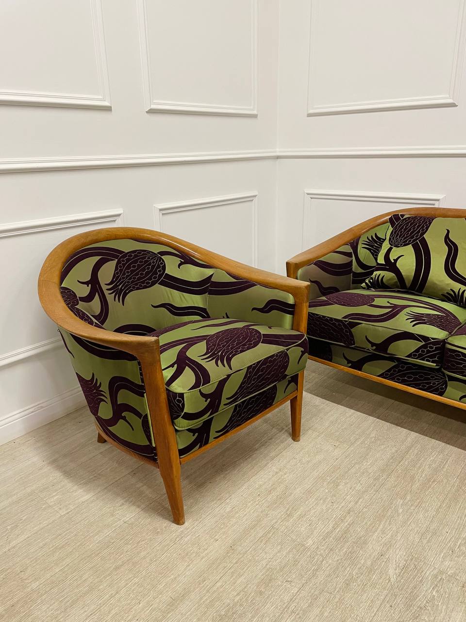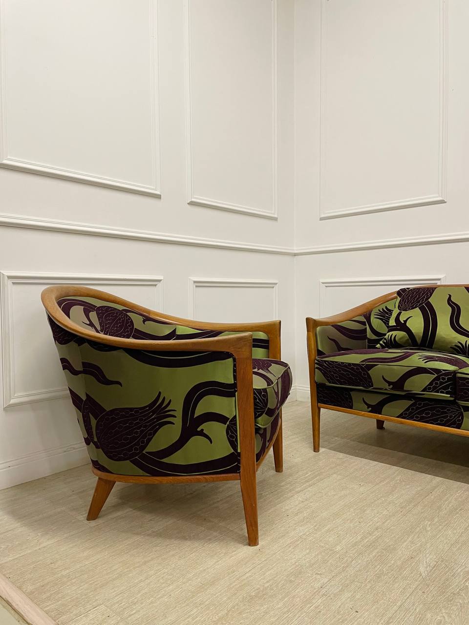 Антикварный комплект диван и кресло в стиле Ар-Деко 1950х годов, Скандинавия. Дизайн Broderna Andersson. Выполнены из массива тика. Переобиты позднее современной тканью Zoffani. Размер дивана 197х77х72h см. Размер кресла 80х77х73h см.