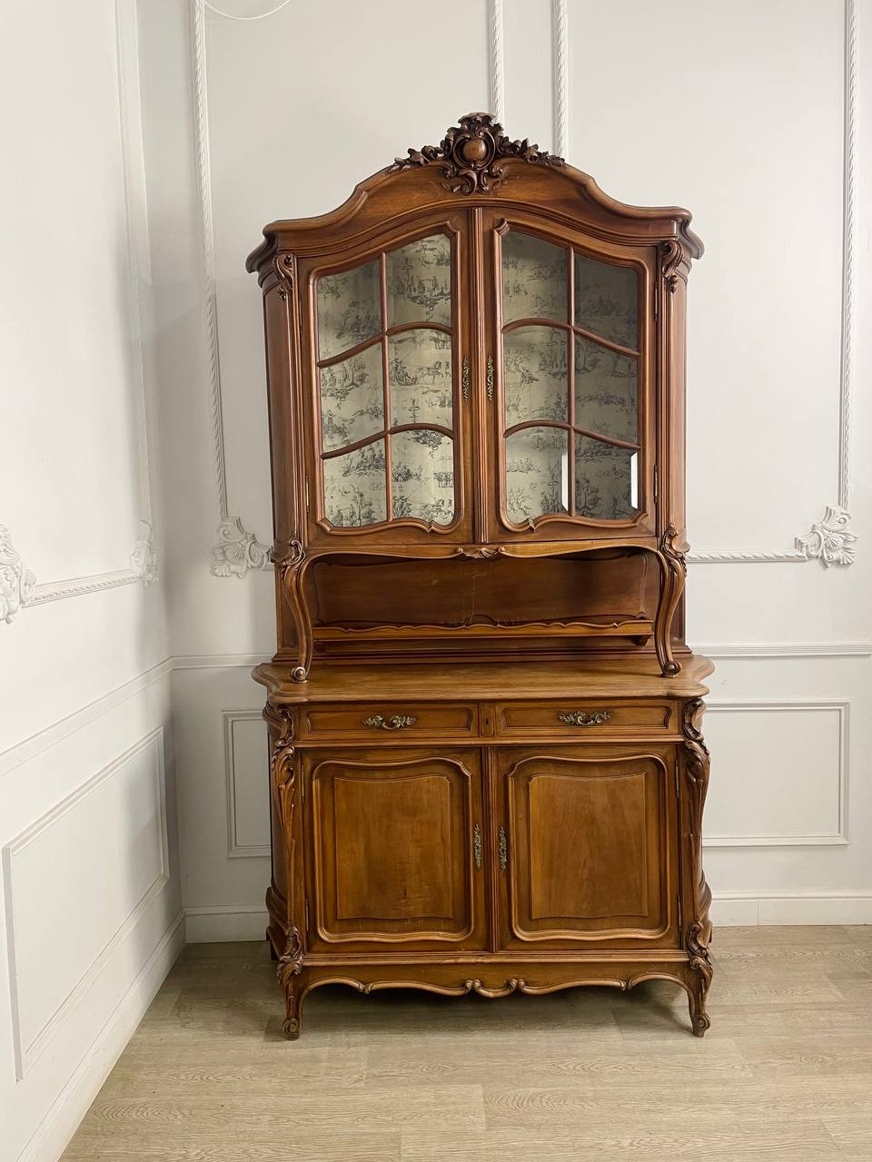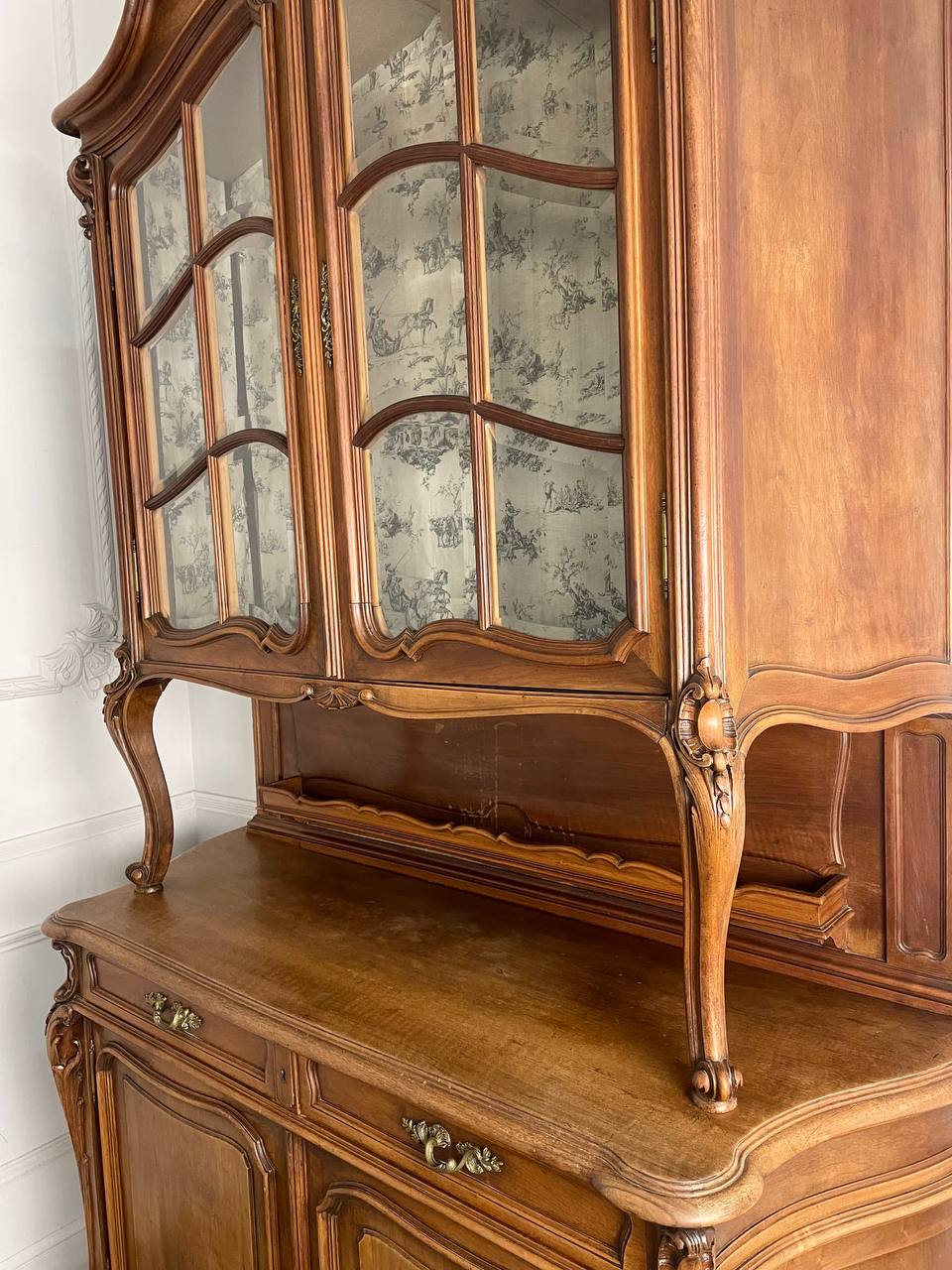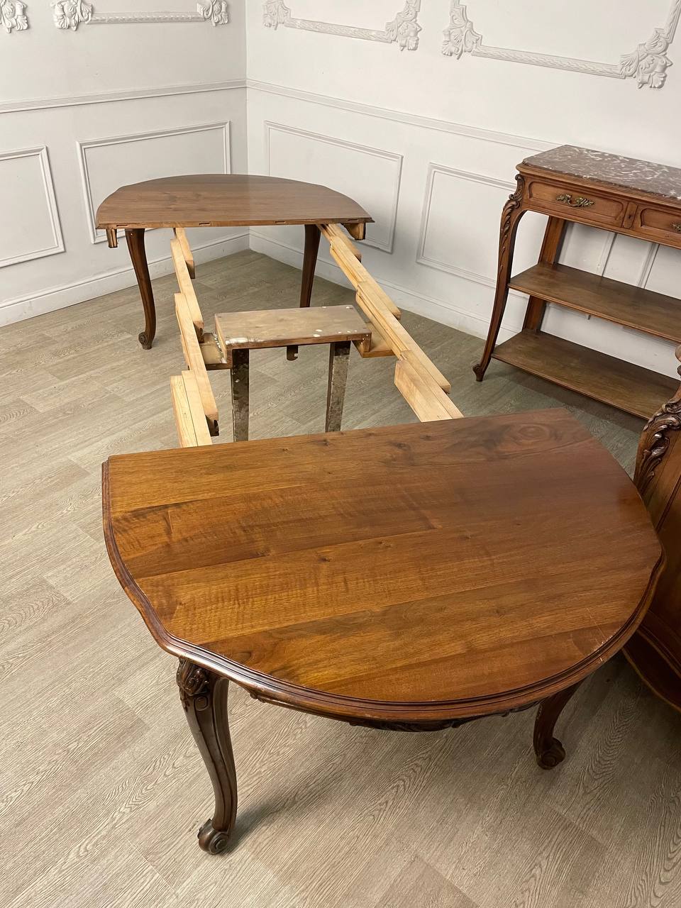 Антикварный комплект столовой мебели 8 предметов в стиле Луи XV рубежа XIX-начала XX веков, Франция. Выполнен из массива ореха. Оригинальные стекла с фигурным фацетом. Оригинальная бронзовая фурнитура. Овальный обеденный стол может раскладываться, но оригинальные вставки не сохранены. Буфет 150х55х255h см. Стол 142(+180)х108х76h см. Стулья 6 шт 49х49х93h см.