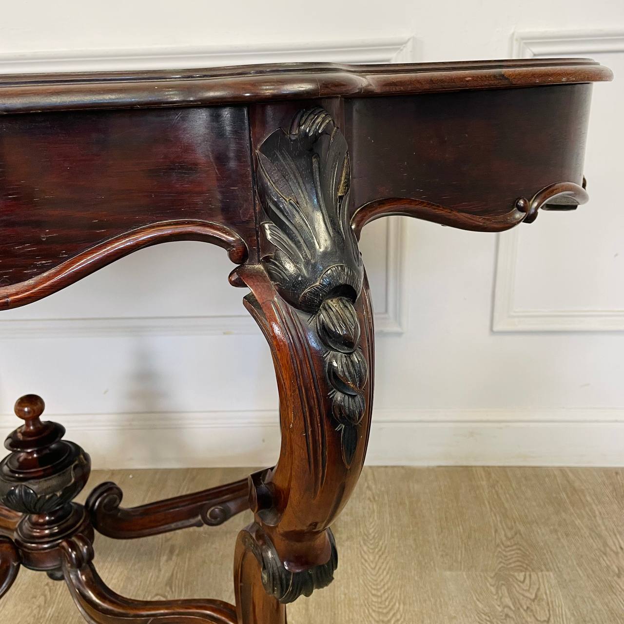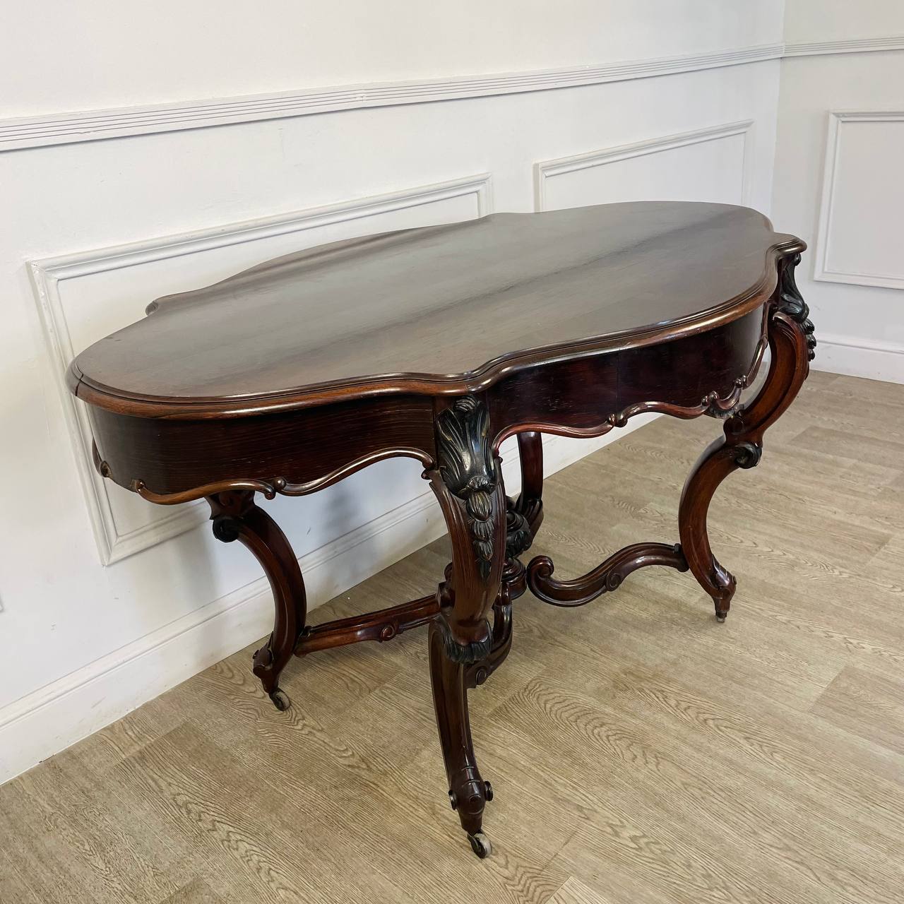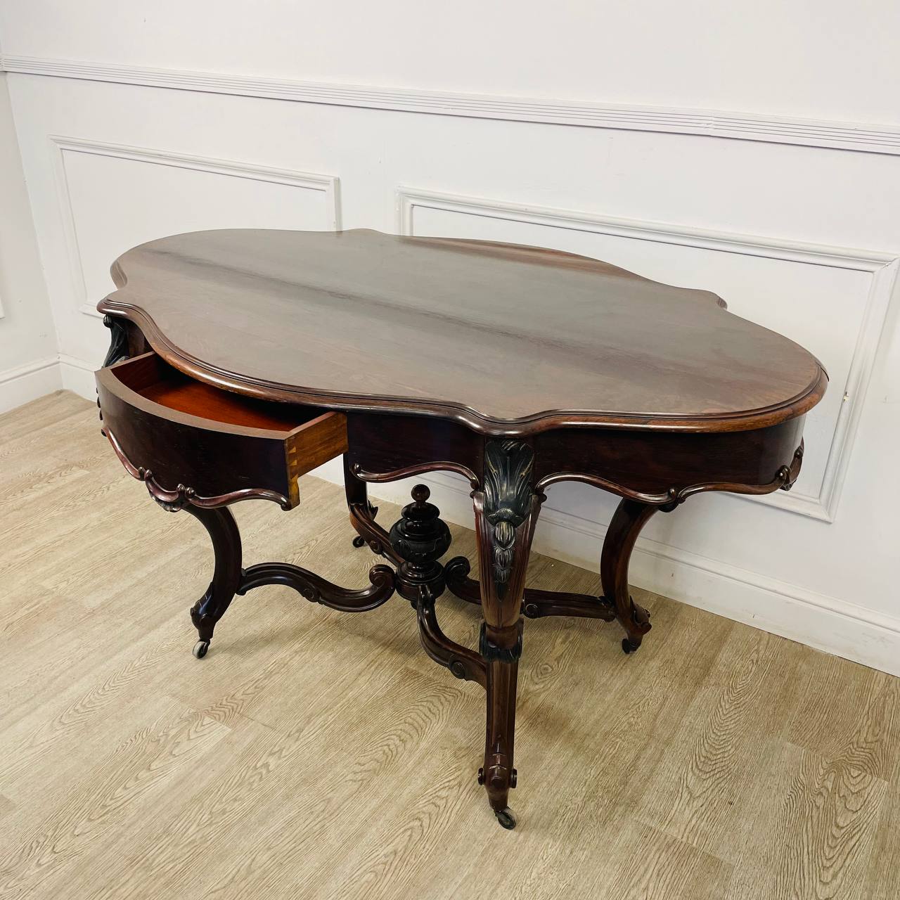Антикварный обеденный стол на колесиках фигурной формы "Скрипка" начала XX века, Франция. Выполнен из палисандра, одной из самых дорогих пород дерева. С двух сторон имеются выдвижные ящички. Размер 128х84х74h см.