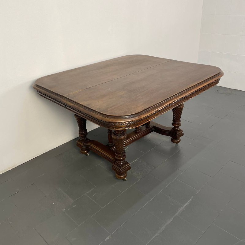 Антикварный обеденный стол Обеденный стол из массива ореха, начало ХХ века, Франция. Стол раскладывается. Оригинальные вставки не сохранились, но можем сделать на заказ. Размер: 131х113х74 см. В разложенном виде: 320х113х74 см.