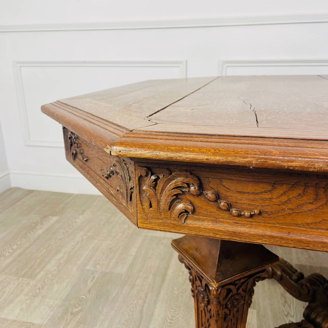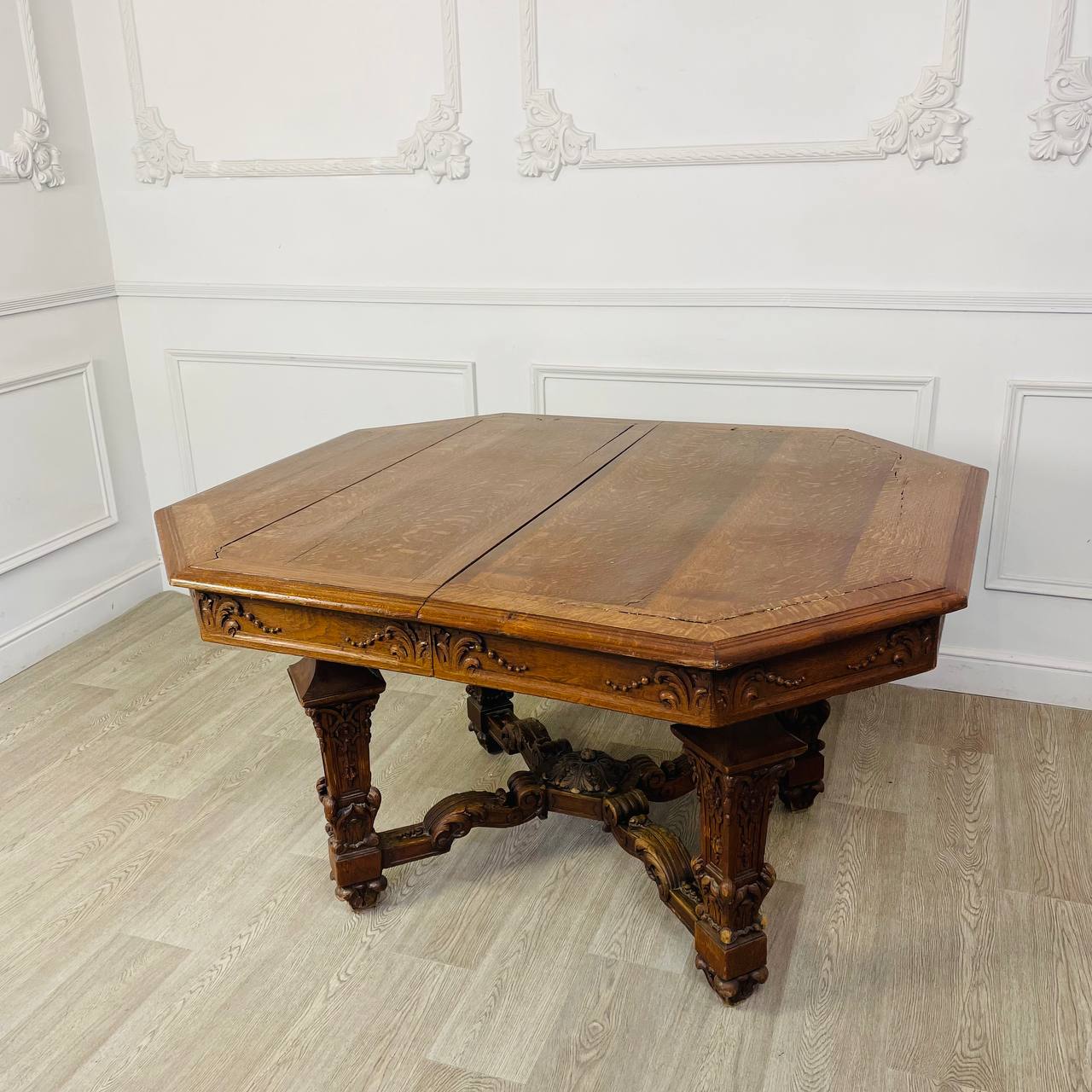 Восьмиугольный обеденный стол конца ХIХ века, Франция. Выполнен из массива дуба, резьба ручной работы по периметру. Может раскладываться. Размер: 136х118х74h см.