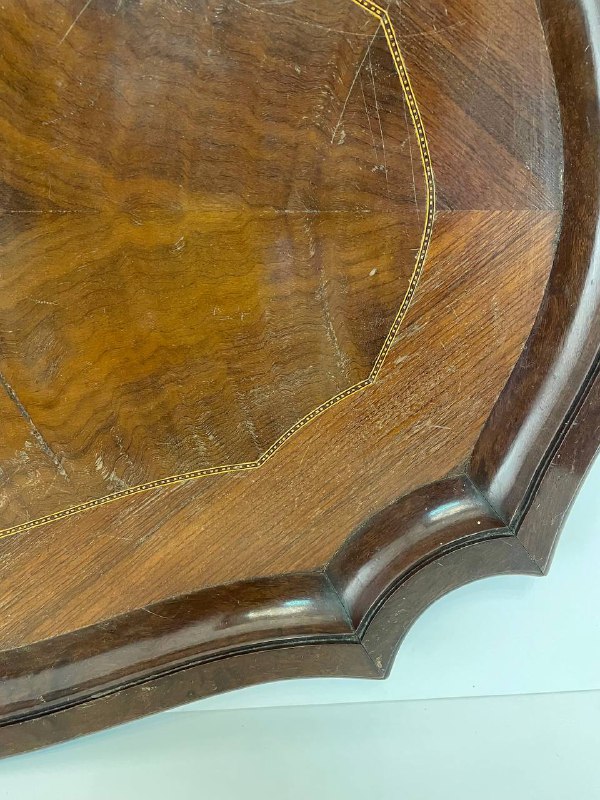 Большой поднос из нескольких пород дерева: корень ореха, палисандр, ручки выполнены из бронзы. Начало ХХ века, Франция. Размер: 78х48 cм.