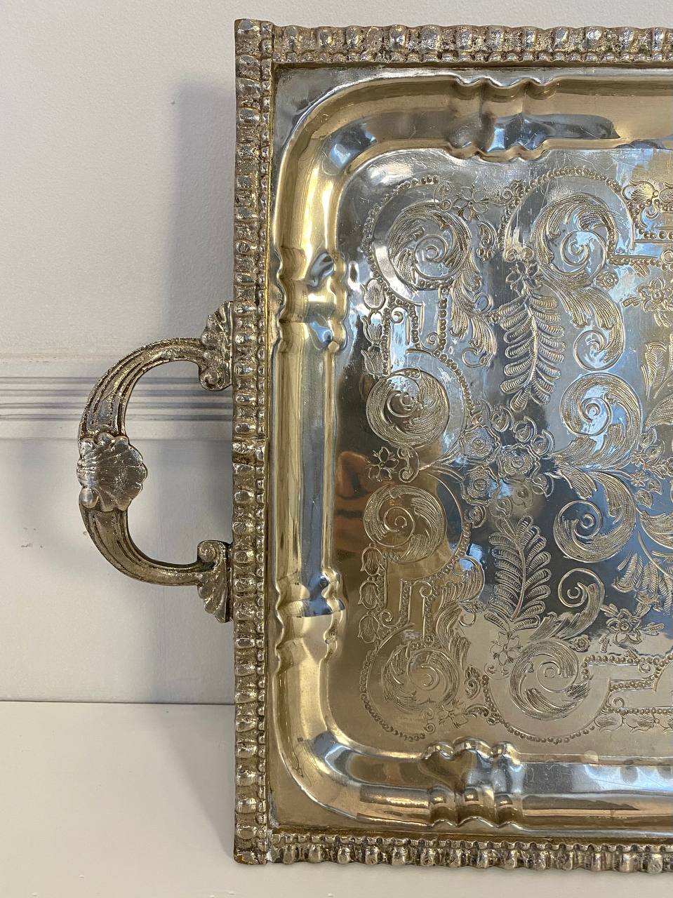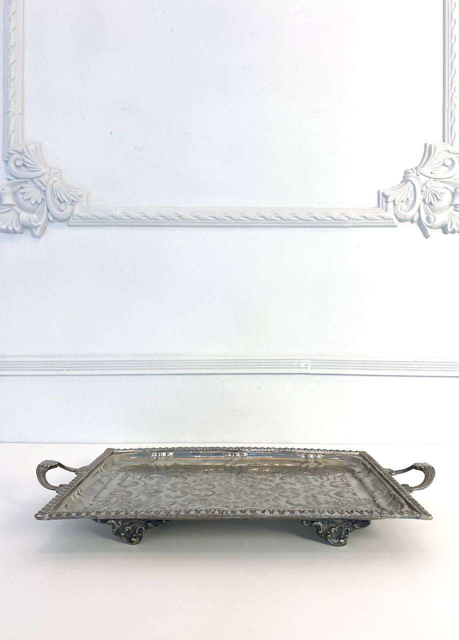 Большой антикварный поднос первой половины XX века, Франция. Серебрение, гравировка. Размер 59х34 см.