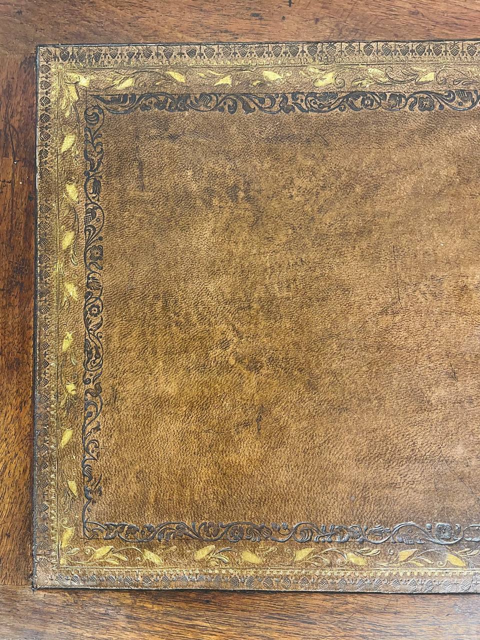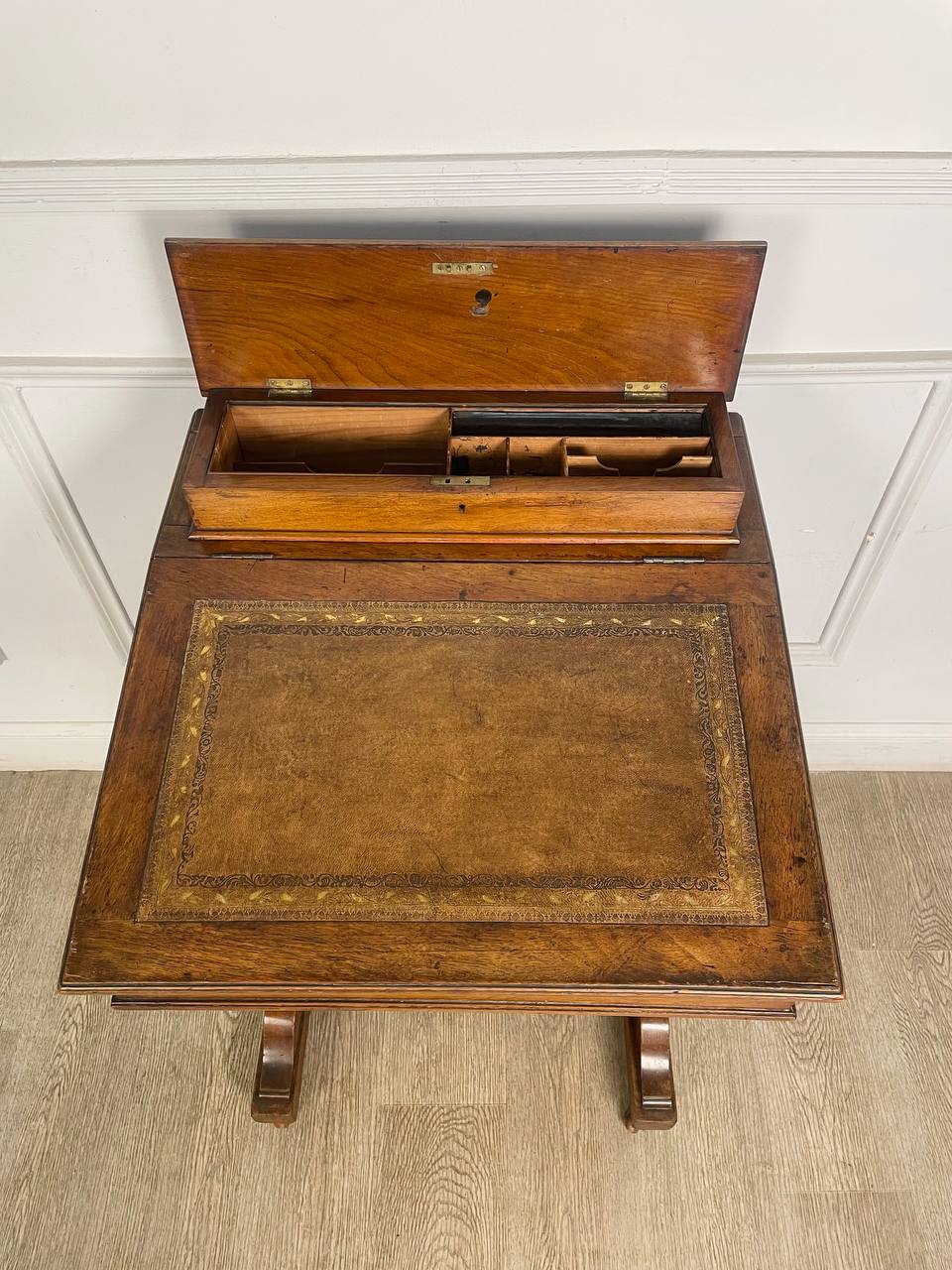 Антикварный рабочий стол-парта начала XX века, Франция. Выполнен из красного дерева. Натуральная кожа с тиснением в хорошем состоянии. Выдвижные ящички (4 шт.) находятся сбоку. Столешница поднимается, внутри пространство для хранения и один выдвижной ящик. Сверху находится отделение для письменных принадлежностей. Размер 56х48х90h см.