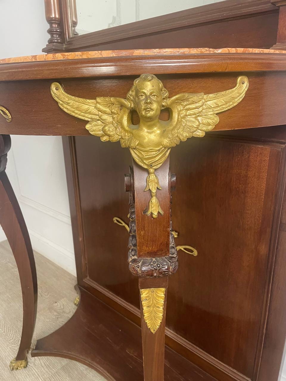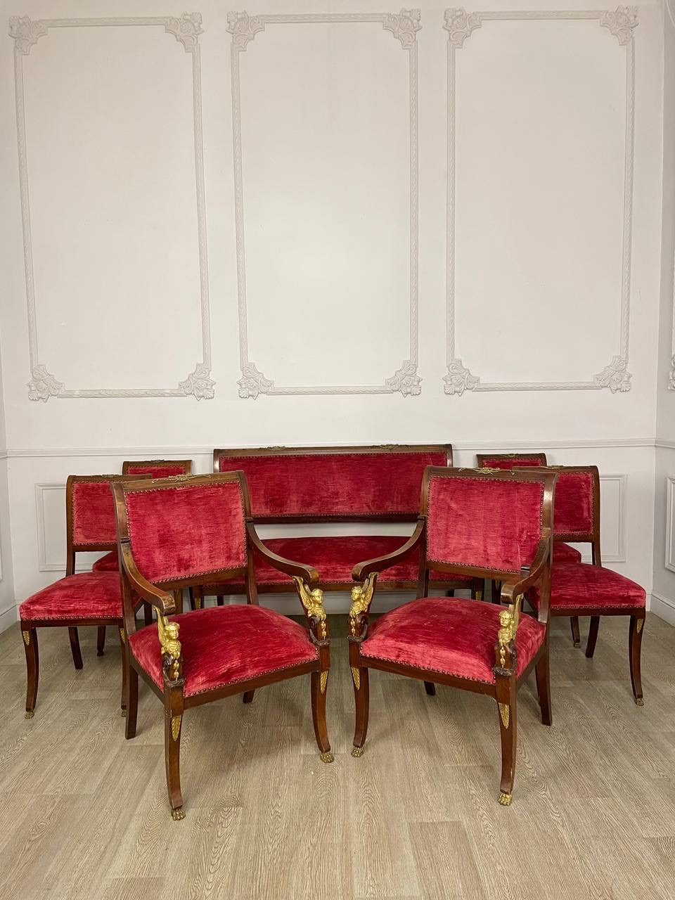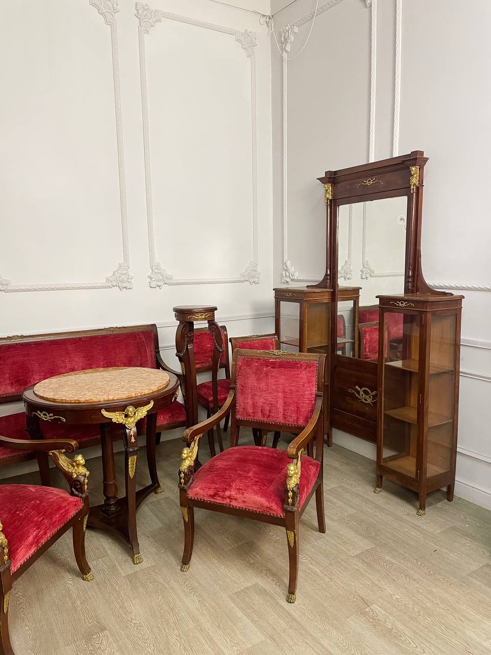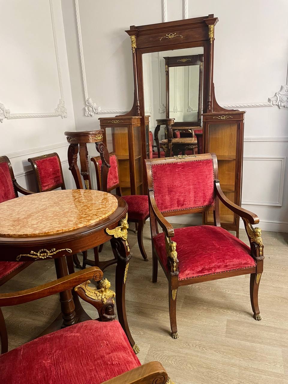 Антикварный гарнитур в стиле Ампир XIX века, Франция. Состоит из 11 предметов. Выполнен из красного дерева. Оригинальная бронзовая фурнитура. Оригинальные зеркальные полотна. Оригинальная мраморная столешница. Стол диаметр 82 см, высота 83 см. Диван 142х64х98h см. Кресло 60х61х98h см. Стул 43х51х93h см. Зеркало с консолью 88х46х241h см. Зеркало с витринами 143х31х211h см.