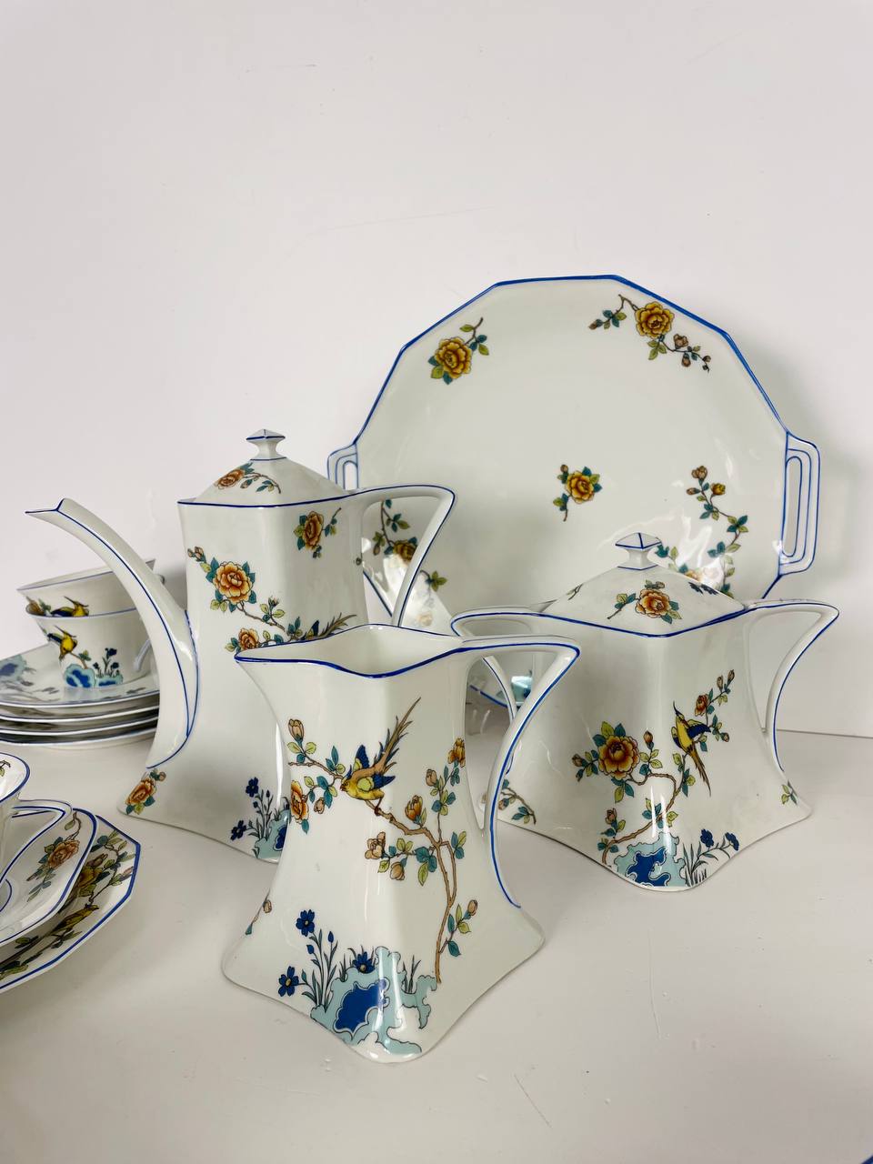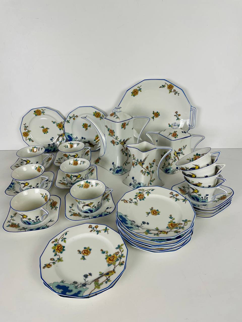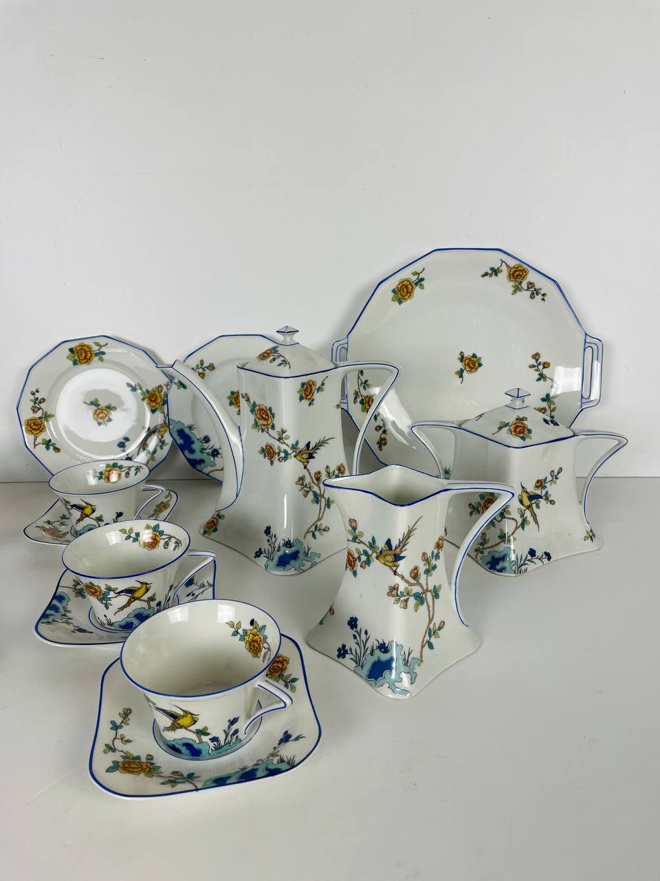 Антикварный кофейный сервиз Limoges в стиле шинуазри, первая половина ХХ века, Франция. Костяной фарфор с ручной росписью. 9 кофейных чашек, 9 блюдец, 9 пирожковых тарелочек, 1 блюдо, 1 кофейник, 1 молочник, 1 сахарница. Всего: 31 предмет