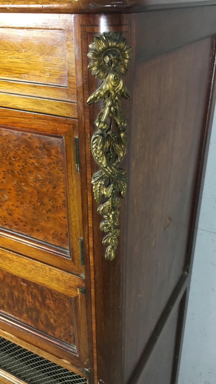 Редкий антикварный шкафчик для патефона конца XIX века из Франции. Предназначен для патефона или проигрывателя, нижнее отделение для пластинок или нот. Выполнен из ореха и корня ореха, оригинальная бронзовая фурнитура. Обратите внимание, что верхняя часть может откидываться наверх. Размер 63х45х140/175h см.