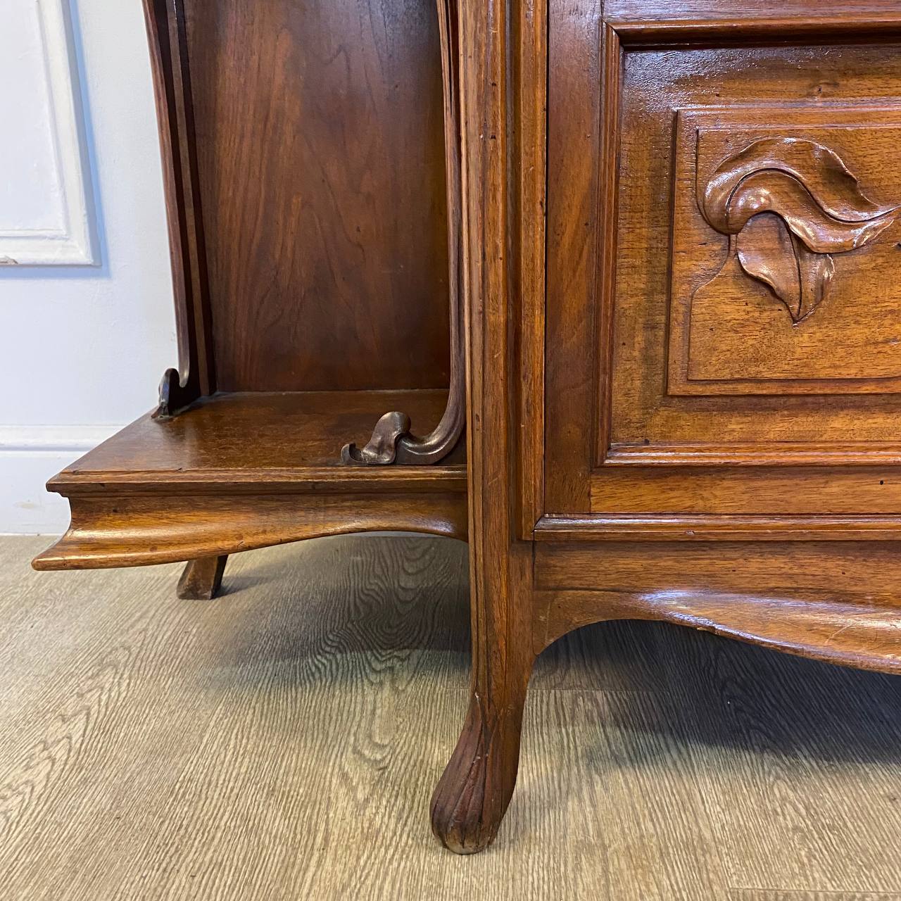 Антикварная витрина в стиле Ар-Нуво начала XX века, Франция. Выполнена из массива ореха, украшена резьбой в виде цветов водяной лилии. Внутренняя стенка отделана зеркальным полотном. Родной ключик. Размер: 102х37х167h см.