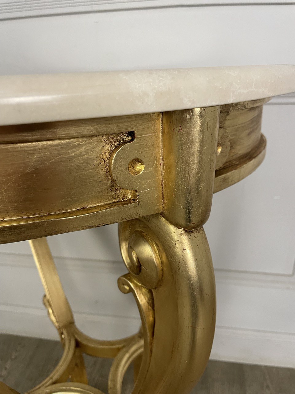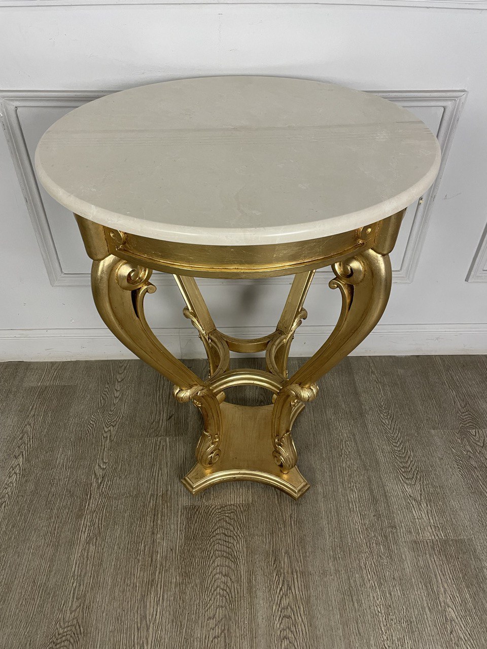 Антикварный столик с мраморной столешницей XIX века, Франция. Сусальное золото. Мраморная столешница современная. Диаметр 62 см. Высота 84 см.