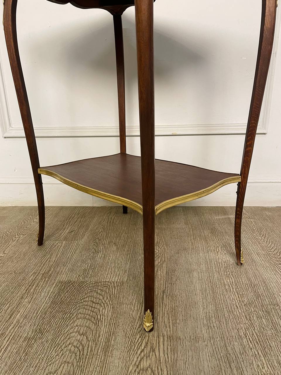 Приставной двухъярусный столик, ХIХ век, Франция. Красное дерево, латунь, бронза. Фигурная столешница из оригинального мрамора. Отличное состояние! Размер: 53х38х73h см.