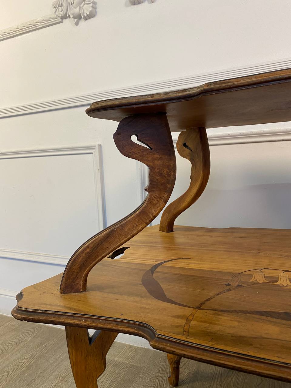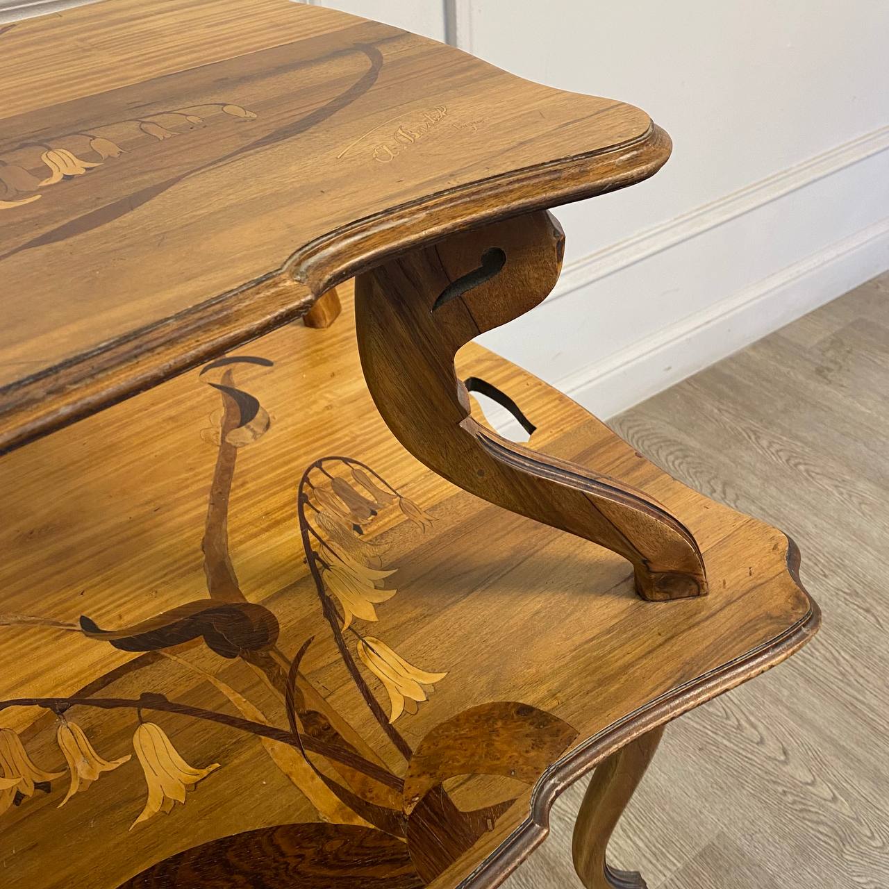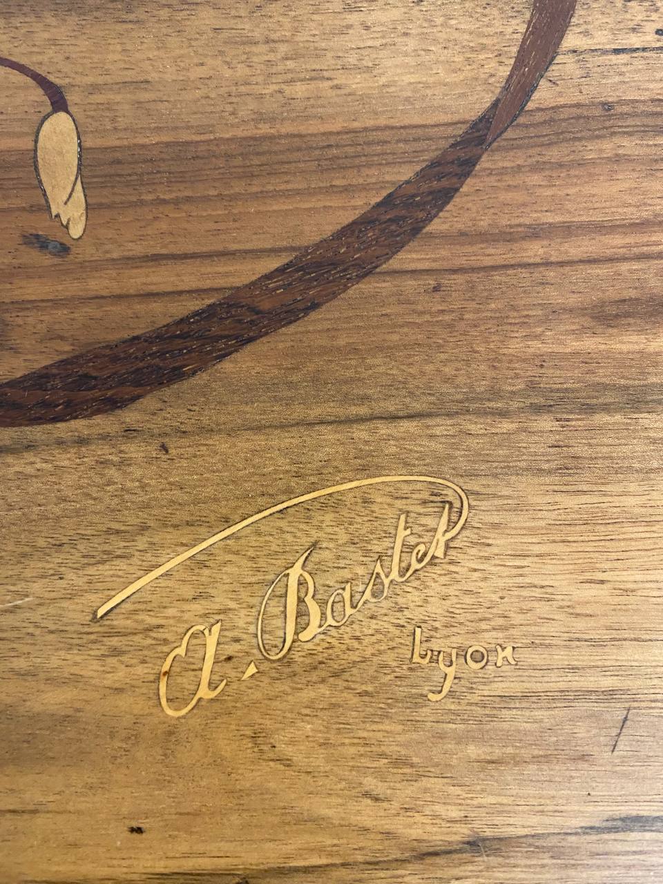 Подписной двухъярусный столик известного краснодеревщика A. Bastet, начало ХХ века, Франция. Стоит подпись. Выполнен из массива ореха. Украшен в технике маркетри, цветочный рисунок выложен из разных пород дерева: палисандр, розовое дерево, груша. Размер: 92х61х83h см. Antoine Bastet (1864-1935) — французский краснодеревщик, владел