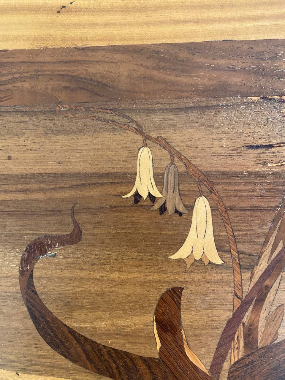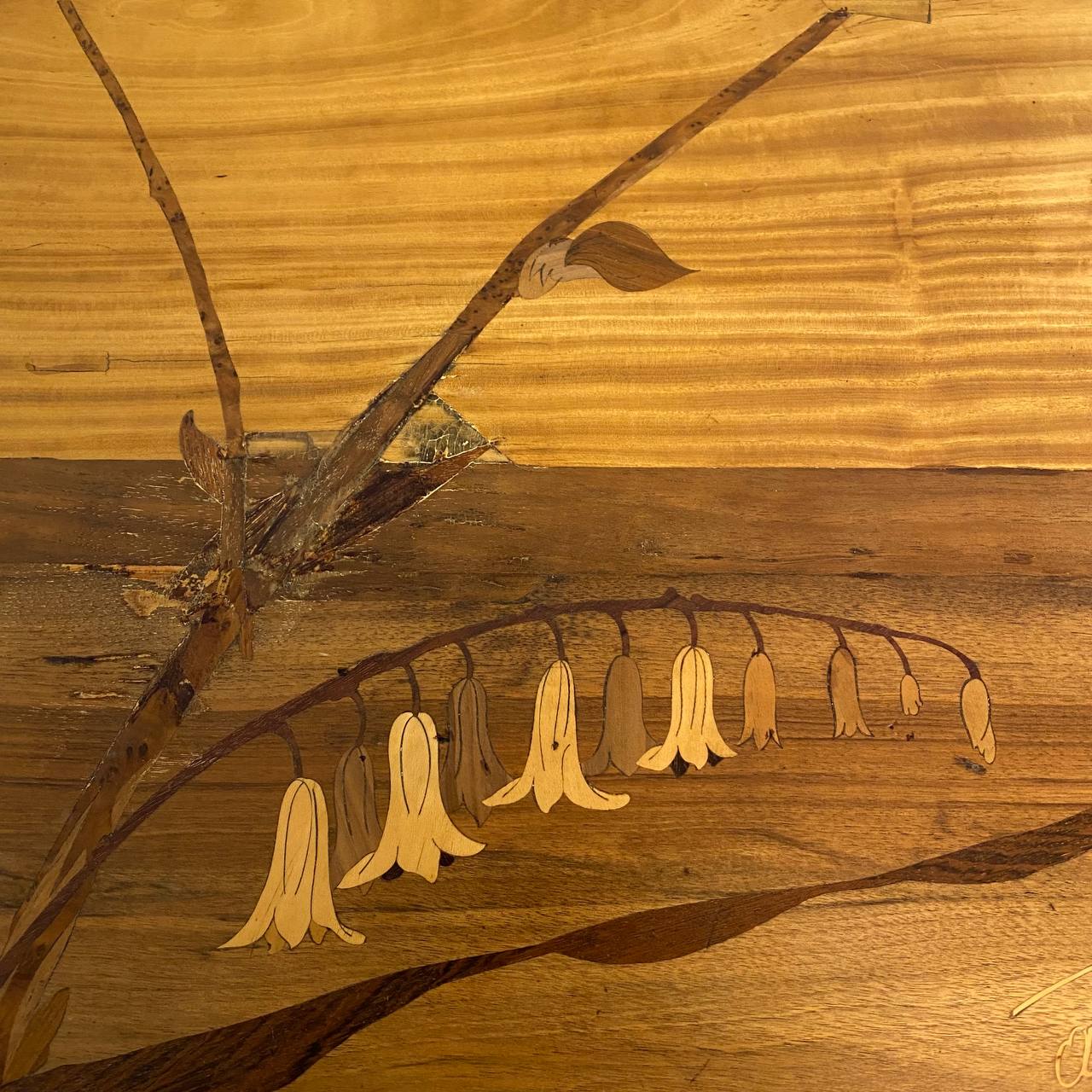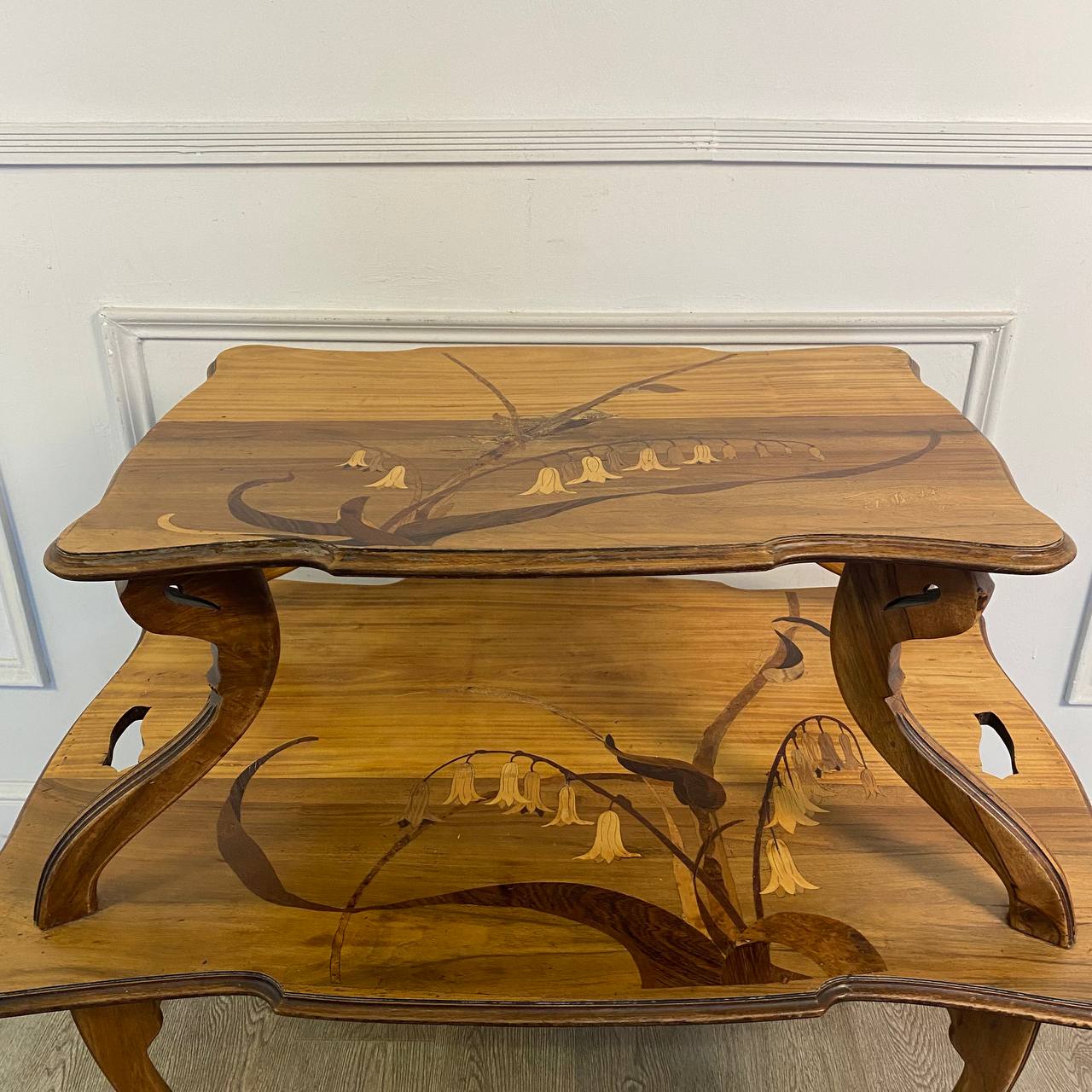 Подписной двухъярусный столик известного краснодеревщика A. Bastet, начало ХХ века, Франция. Стоит подпись. Выполнен из массива ореха. Украшен в технике маркетри, цветочный рисунок выложен из разных пород дерева: палисандр, розовое дерево, груша. Размер: 92х61х83h см. Antoine Bastet (1864-1935) — французский краснодеревщик, владел