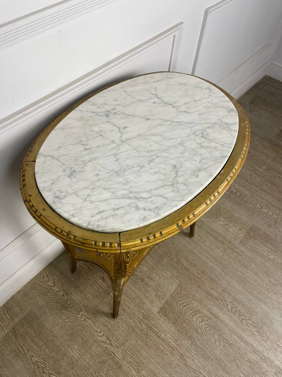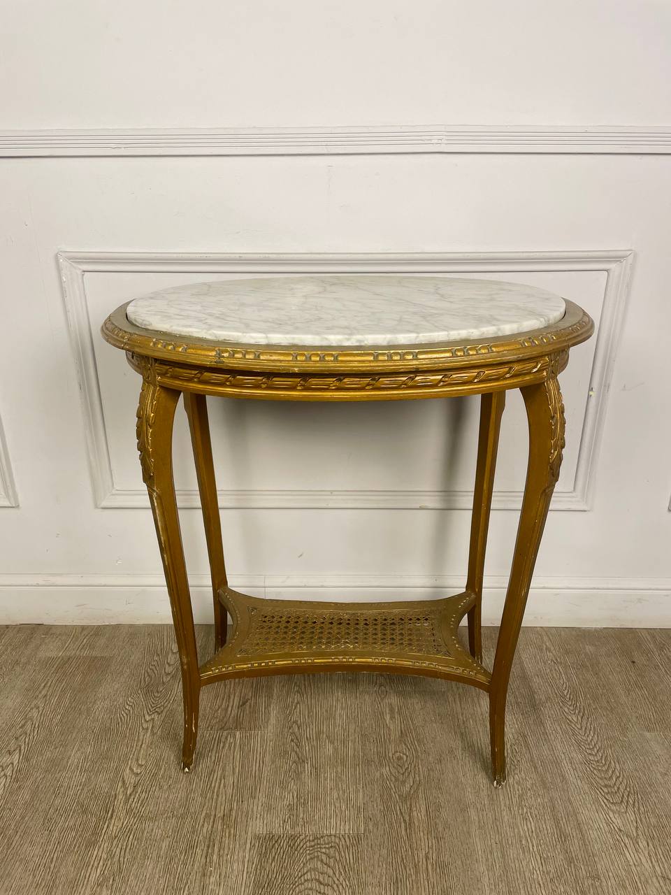 Антикварный овальный столик начала XX века, Франция. Массив дерева, позолота. Оригинальная столешница из белого мрамора. Натуральный ротанг. Размер 70х50х77h см