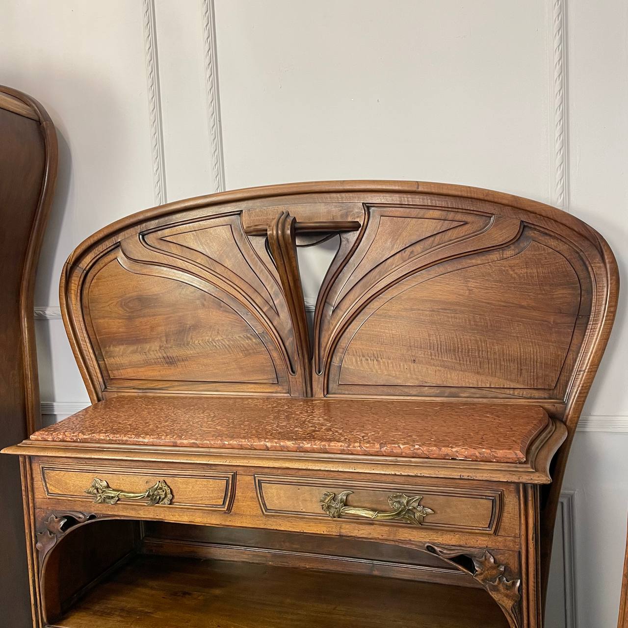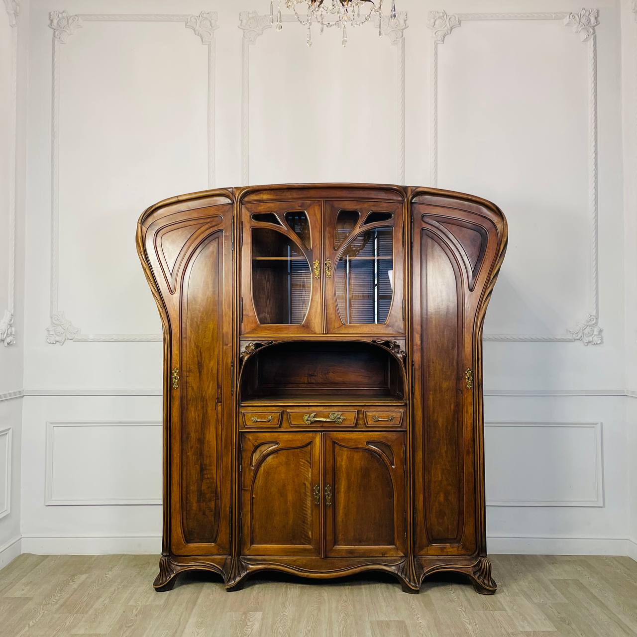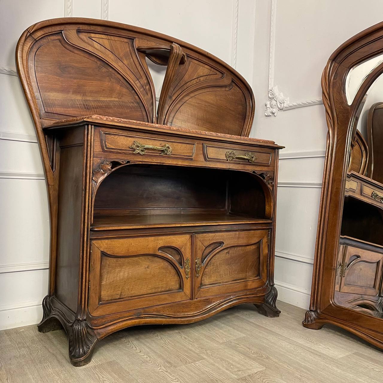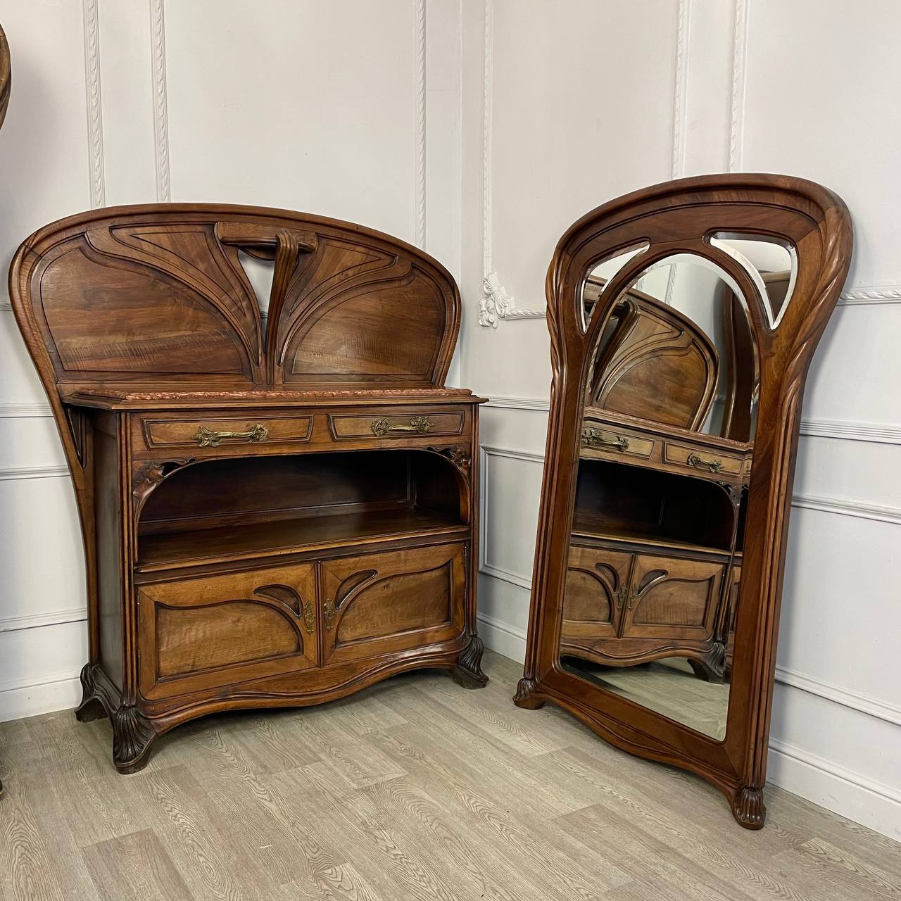 Антикварный столовый гарнитур в стиле Ар-Нуво, 1890- е годы, школа Нанси, Франция. Состоит из 4-х предметов: большой буфет, поставец, раскладывающийся стол, зеркало. Массив ореха, бронзовая оригинальная фурнитура, натуральный мрамор и стёкла с фацетом. Размер буфета: 200х49х213h см. Размер стола: 110х118х74h см. В разложенном виде: 238х110х74h см. Размер поставца: 158х50х165h см. Зеркало: 115х10х166h см. Школа Нанси - объединение художников и мастеров декоративно-прикладного искусства, работавших в столице Лотарингии в 1890-1910-х годах и сформировавших локальную стилистическую школу в рамках стиля Ар-Нуво. Среди самых значимых фигур: Эмиль Галле, Луи Мажорель, Виктор Пруве. Публикации: The Paris Salons 1895-1914 Volume III: Furniture под ред. Alastair Duncan