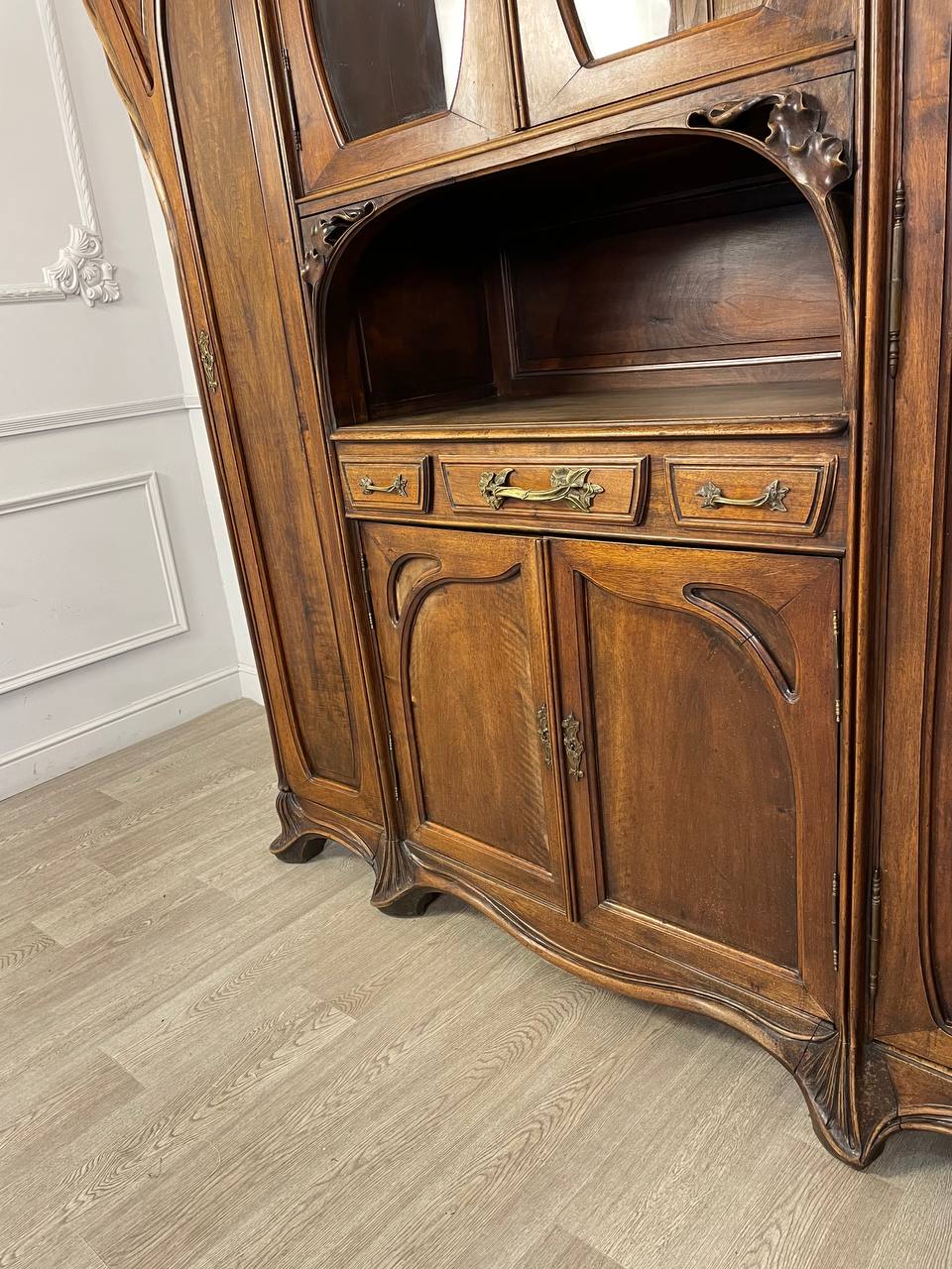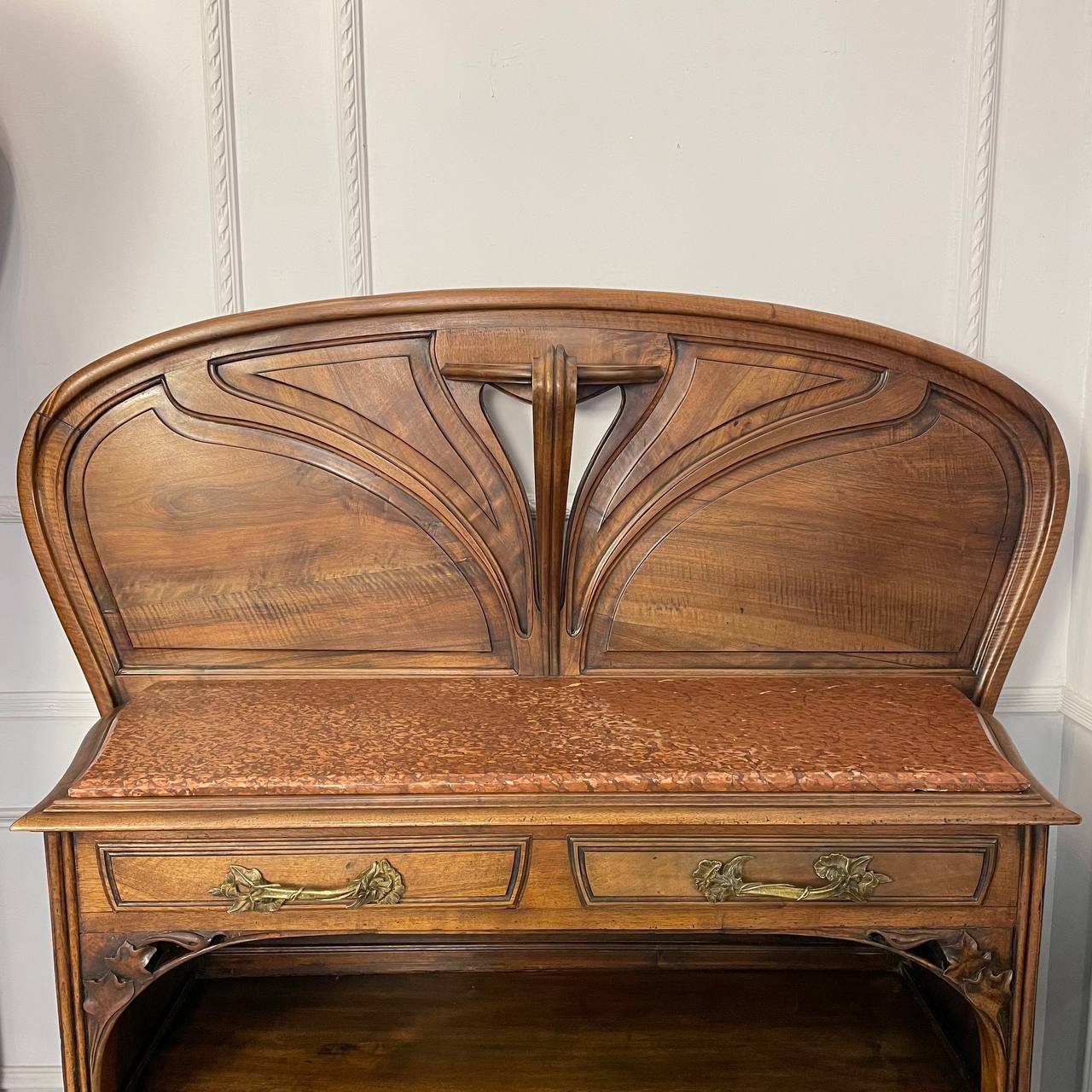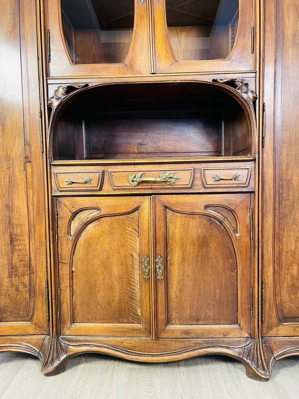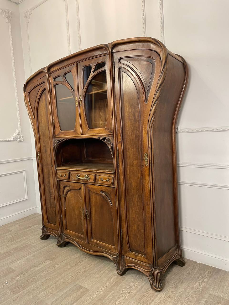Антикварный столовый гарнитур в стиле Ар-Нуво, 1890- е годы, школа Нанси, Франция. Состоит из 4-х предметов: большой буфет, поставец, раскладывающийся стол, зеркало. Массив ореха, бронзовая оригинальная фурнитура, натуральный мрамор и стёкла с фацетом. Размер буфета: 200х49х213h см. Размер стола: 110х118х74h см. В разложенном виде: 238х110х74h см. Размер поставца: 158х50х165h см. Зеркало: 115х10х166h см. Школа Нанси - объединение художников и мастеров декоративно-прикладного искусства, работавших в столице Лотарингии в 1890-1910-х годах и сформировавших локальную стилистическую школу в рамках стиля Ар-Нуво. Среди самых значимых фигур: Эмиль Галле, Луи Мажорель, Виктор Пруве. Публикации: The Paris Salons 1895-1914 Volume III: Furniture под ред. Alastair Duncan