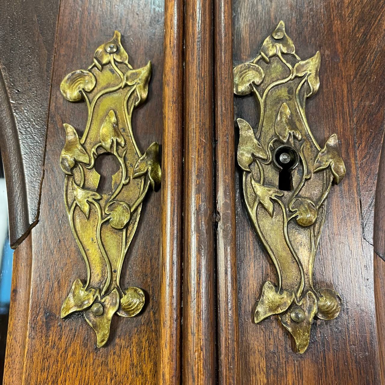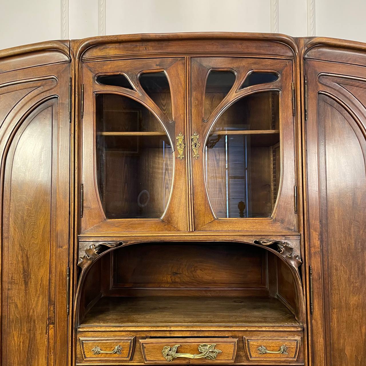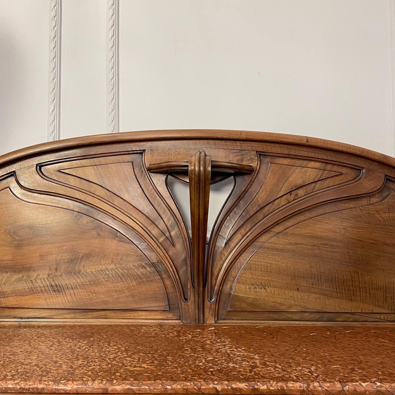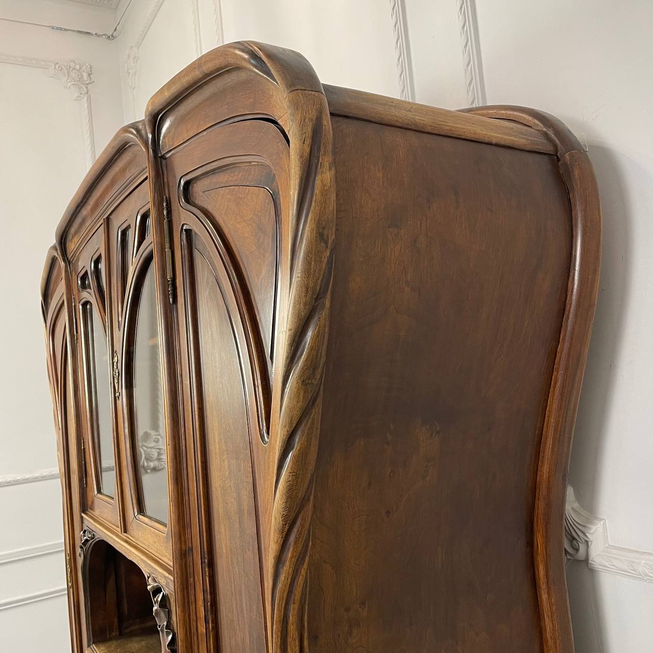 Антикварный столовый гарнитур в стиле Ар-Нуво, 1890- е годы, школа Нанси, Франция. Состоит из 4-х предметов: большой буфет, поставец, раскладывающийся стол, зеркало. Массив ореха, бронзовая оригинальная фурнитура, натуральный мрамор и стёкла с фацетом. Размер буфета: 200х49х213h см. Размер стола: 110х118х74h см. В разложенном виде: 238х110х74h см. Размер поставца: 158х50х165h см. Зеркало: 115х10х166h см. Школа Нанси - объединение художников и мастеров декоративно-прикладного искусства, работавших в столице Лотарингии в 1890-1910-х годах и сформировавших локальную стилистическую школу в рамках стиля Ар-Нуво. Среди самых значимых фигур: Эмиль Галле, Луи Мажорель, Виктор Пруве. Публикации: The Paris Salons 1895-1914 Volume III: Furniture под ред. Alastair Duncan