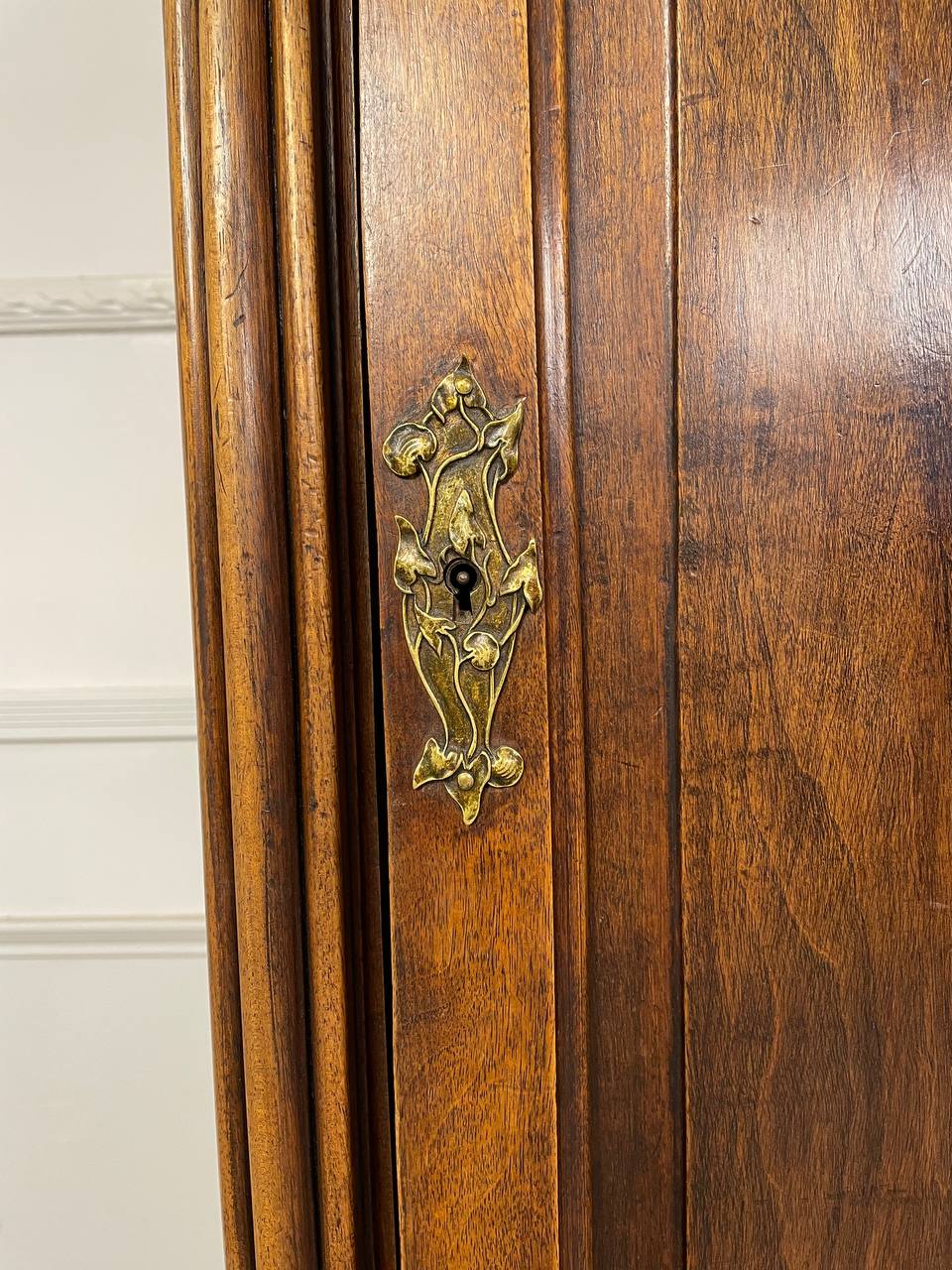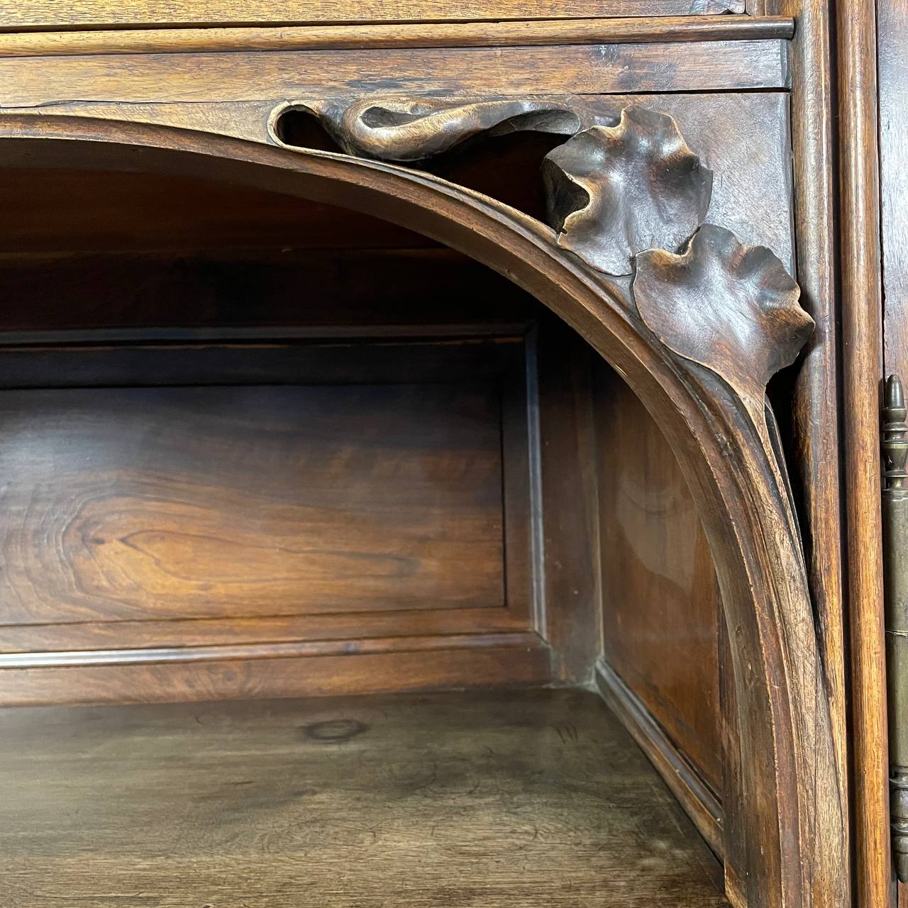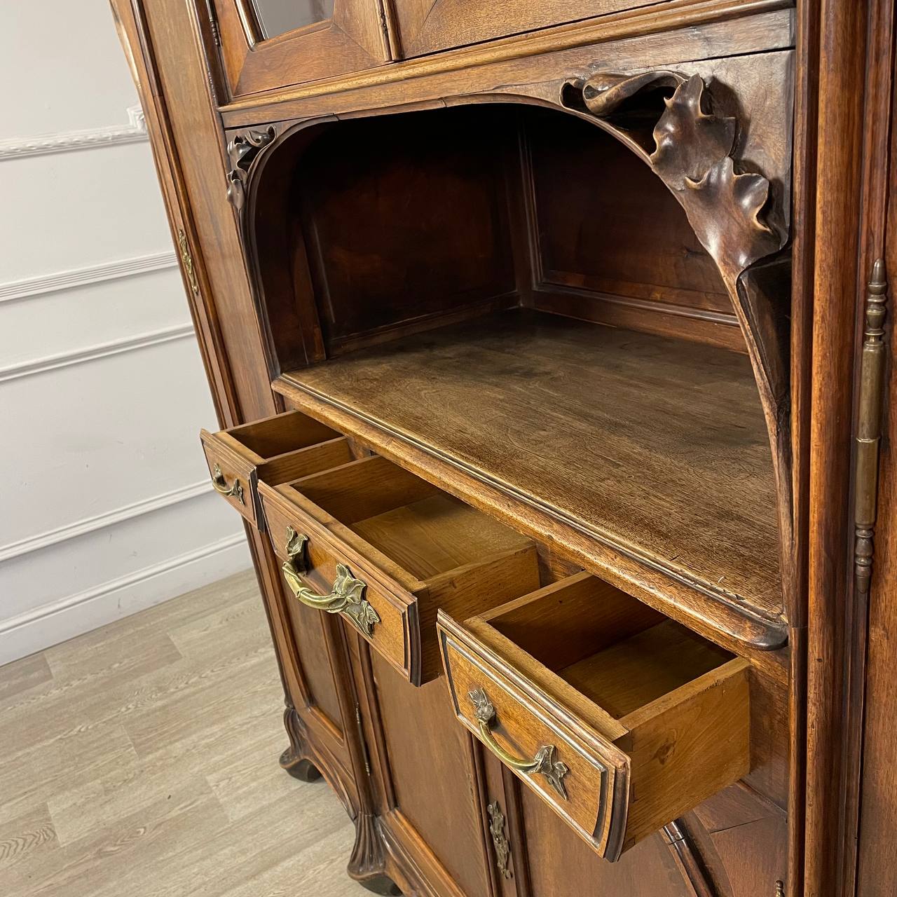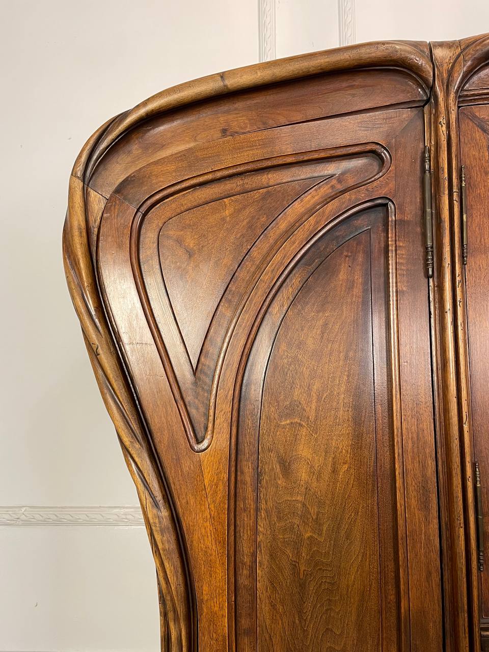 Антикварный столовый гарнитур в стиле Ар-Нуво, 1890- е годы, школа Нанси, Франция. Состоит из 4-х предметов: большой буфет, поставец, раскладывающийся стол, зеркало. Массив ореха, бронзовая оригинальная фурнитура, натуральный мрамор и стёкла с фацетом. Размер буфета: 200х49х213h см. Размер стола: 110х118х74h см. В разложенном виде: 238х110х74h см. Размер поставца: 158х50х165h см. Зеркало: 115х10х166h см. Школа Нанси - объединение художников и мастеров декоративно-прикладного искусства, работавших в столице Лотарингии в 1890-1910-х годах и сформировавших локальную стилистическую школу в рамках стиля Ар-Нуво. Среди самых значимых фигур: Эмиль Галле, Луи Мажорель, Виктор Пруве. Публикации: The Paris Salons 1895-1914 Volume III: Furniture под ред. Alastair Duncan
